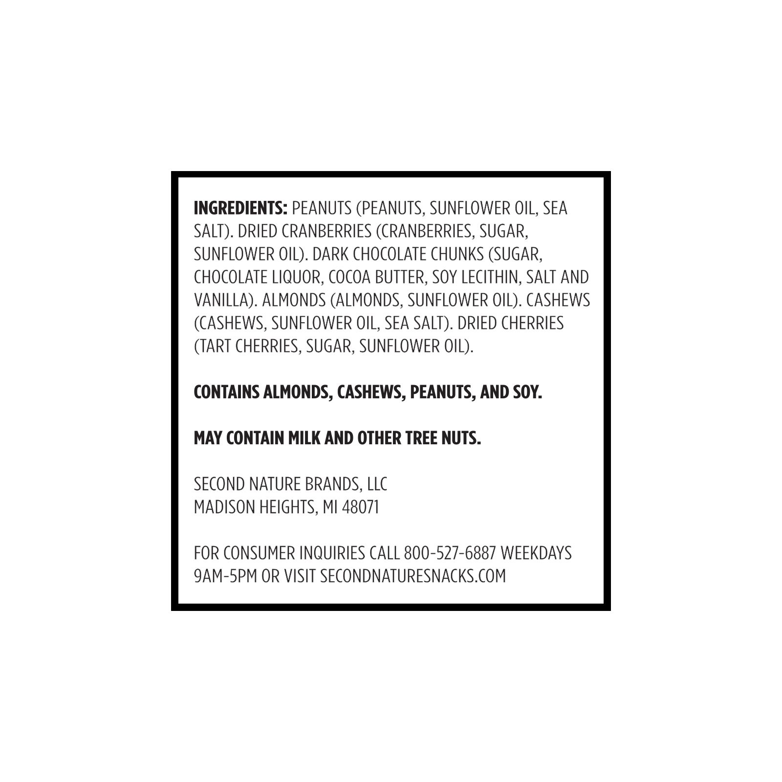 Second Nature Wholesome Medley Trail Mix is a blend of Almonds, Dark Chocolate Chunks, Peanuts, Dried Cranberries, Cashews, & Dried Cherries. This delicious mix is Gluten Free, NON-GMO, and low in sodium.