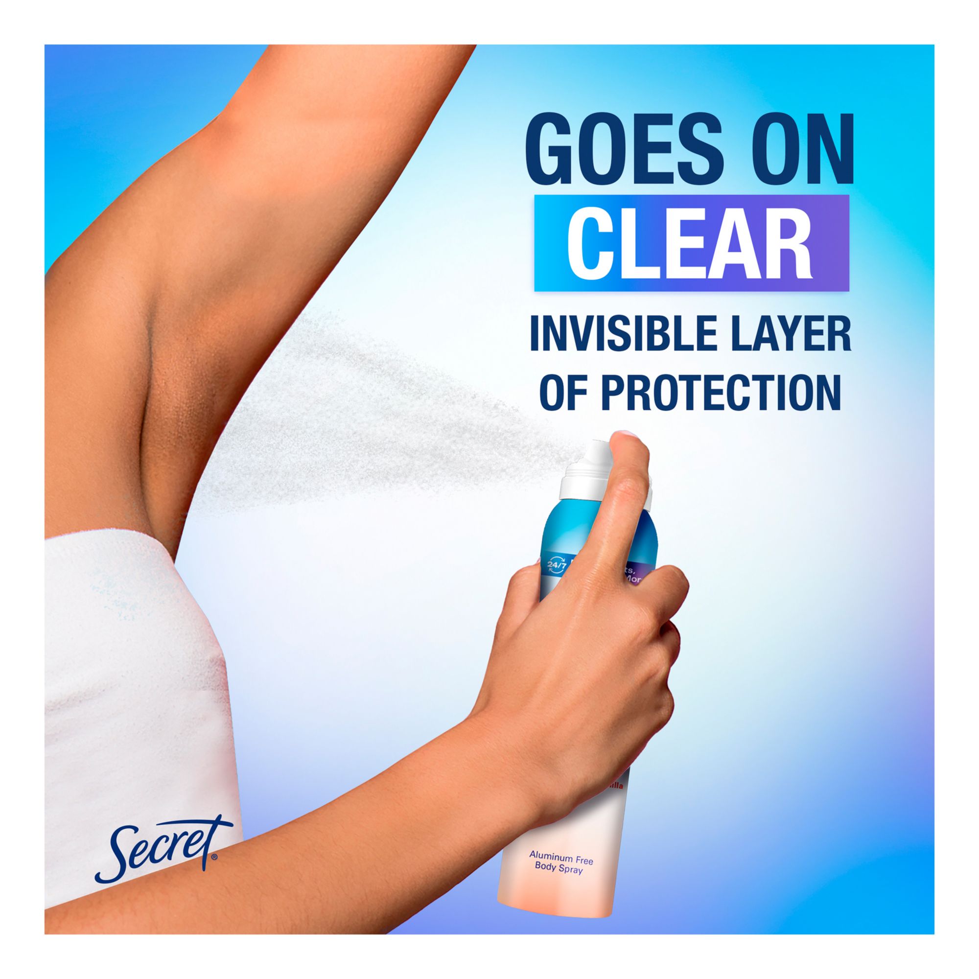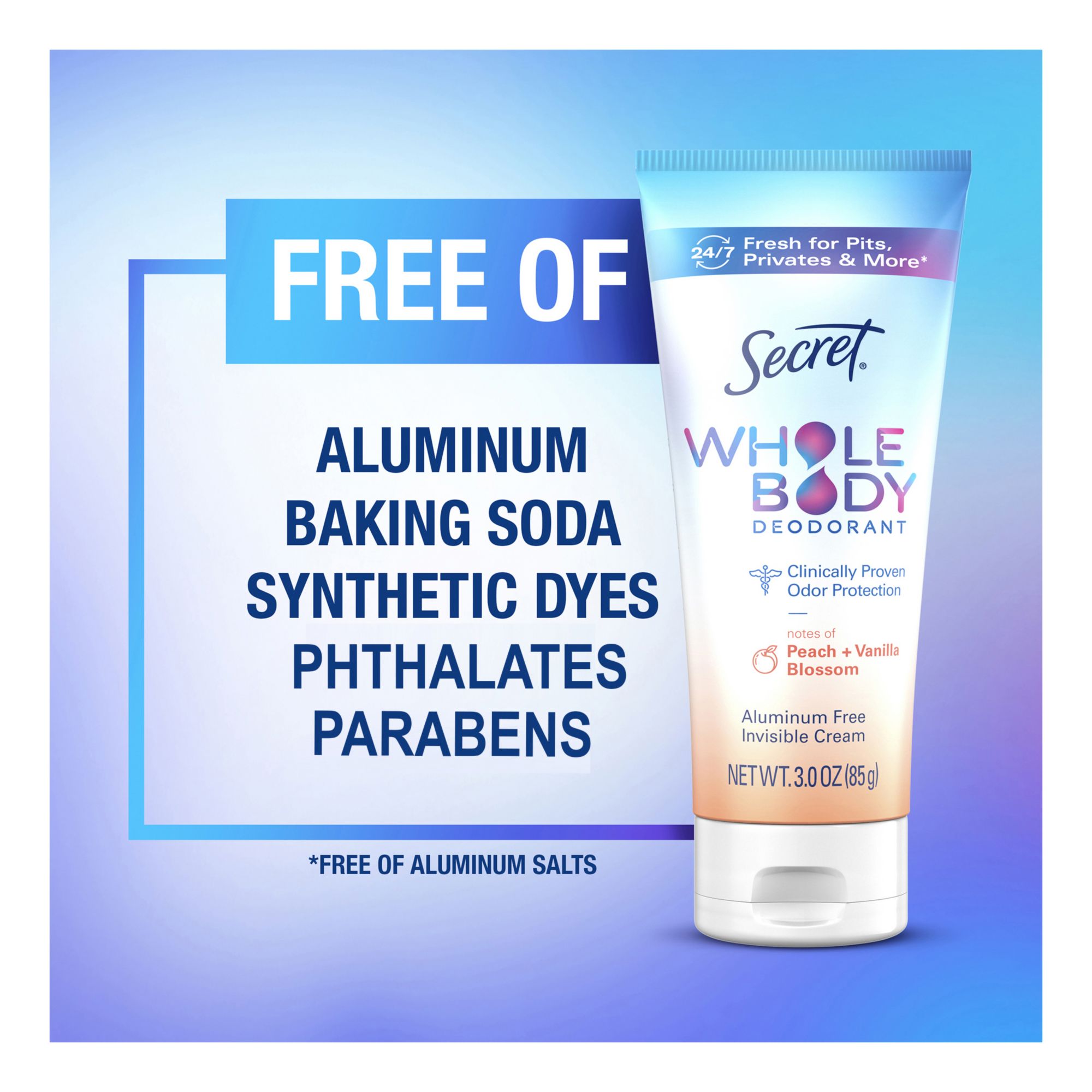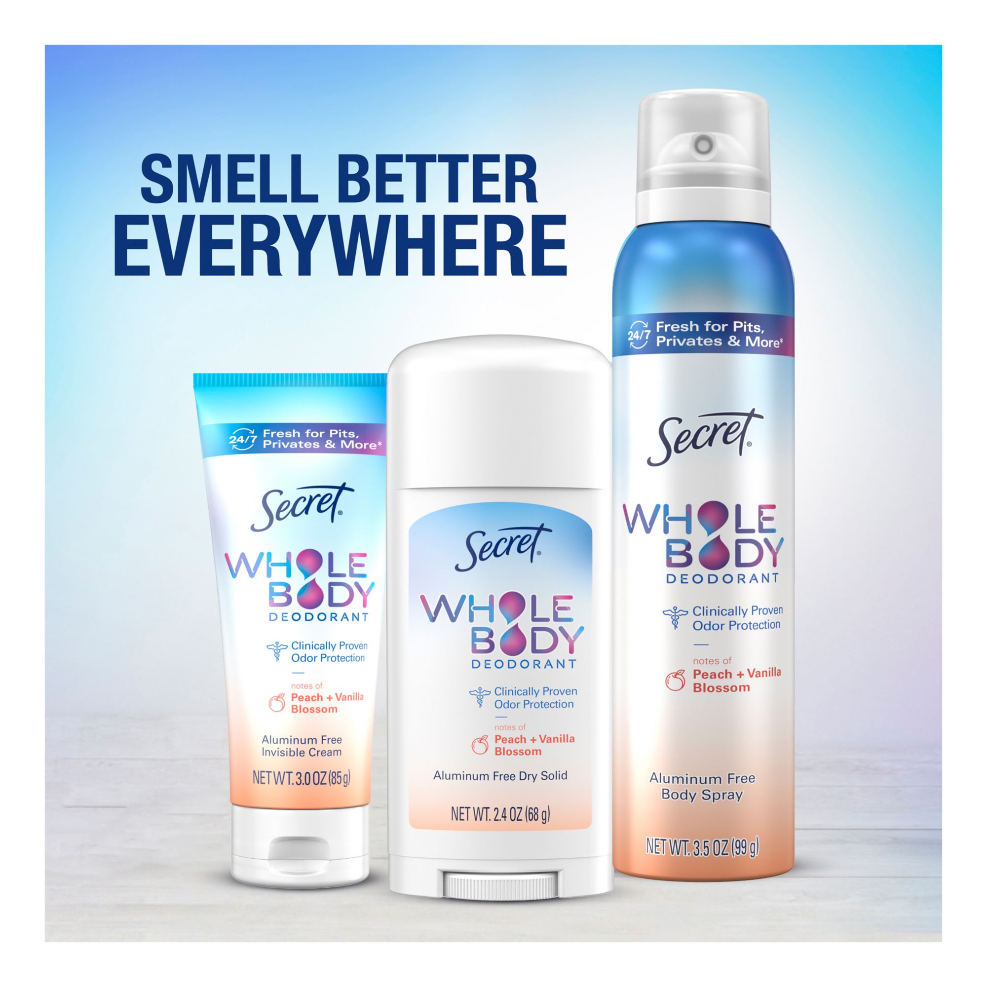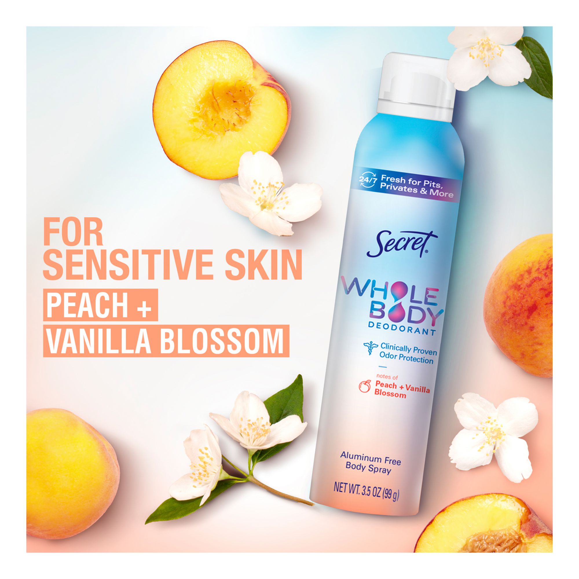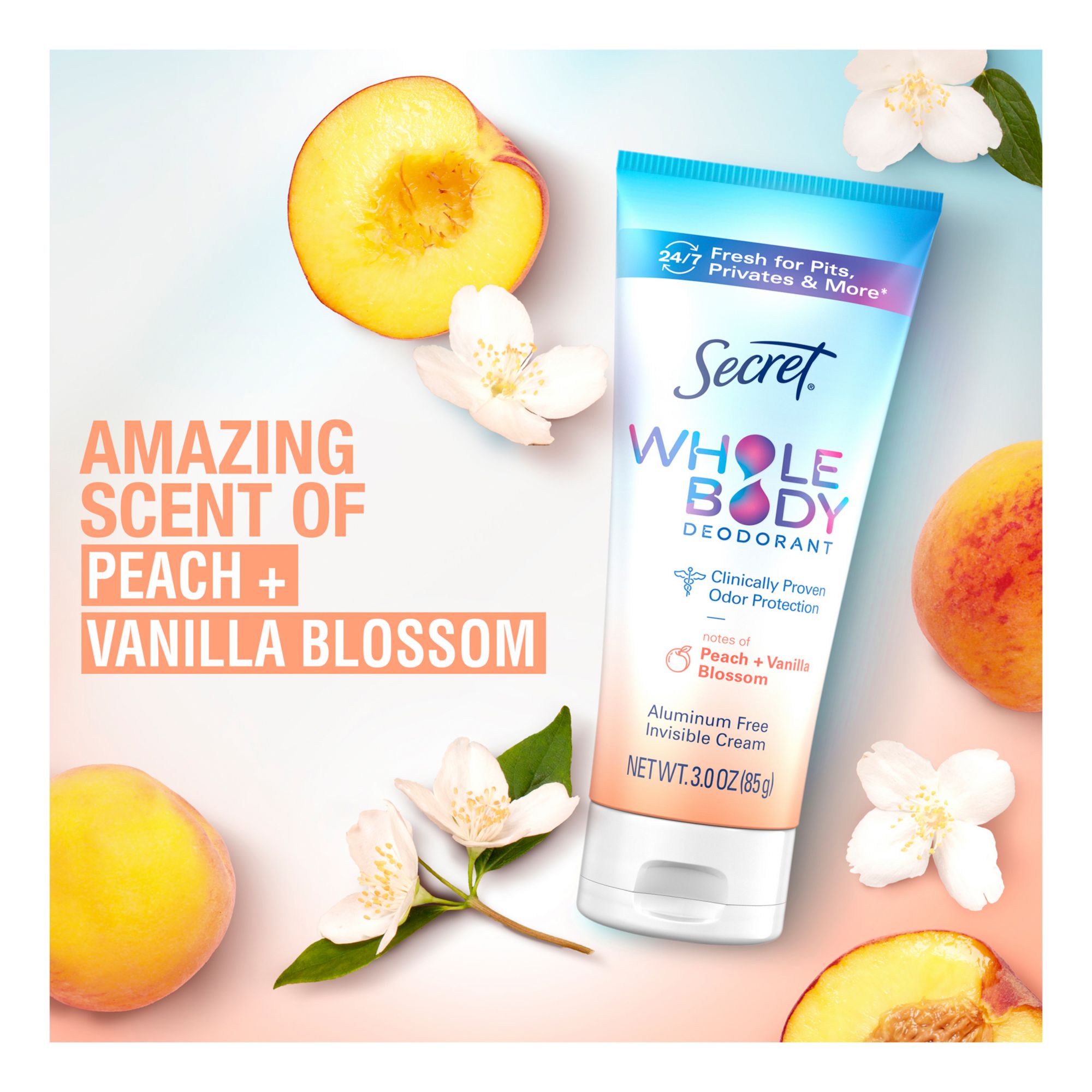 Say goodbye to multiple showers and say hello to 24/7 freshness* from your pits to your privates. Secret Whole Body Deodorant was created to use on your underarms, underboobs, thighs, privates, and feet. Secret Whole Body Deodorant goes on clear and leaves an invisible layer of protection so you feel nothing but fresh, no matter what the day may bring. Engulf yourself in the enticing scent of Secret Whole Body Deodorant in Peach & Vanilla scent in both a Spray and a Cream form. The Secret Whole Body Deodorant Spray can be used for easy daily application or a refresh over large areas like pits, feet, and thighs. The Secret Whole Body Deodorant Cream is great for comfortable and precise application, especially in more intimate areas like privates, thighs, and underboob.