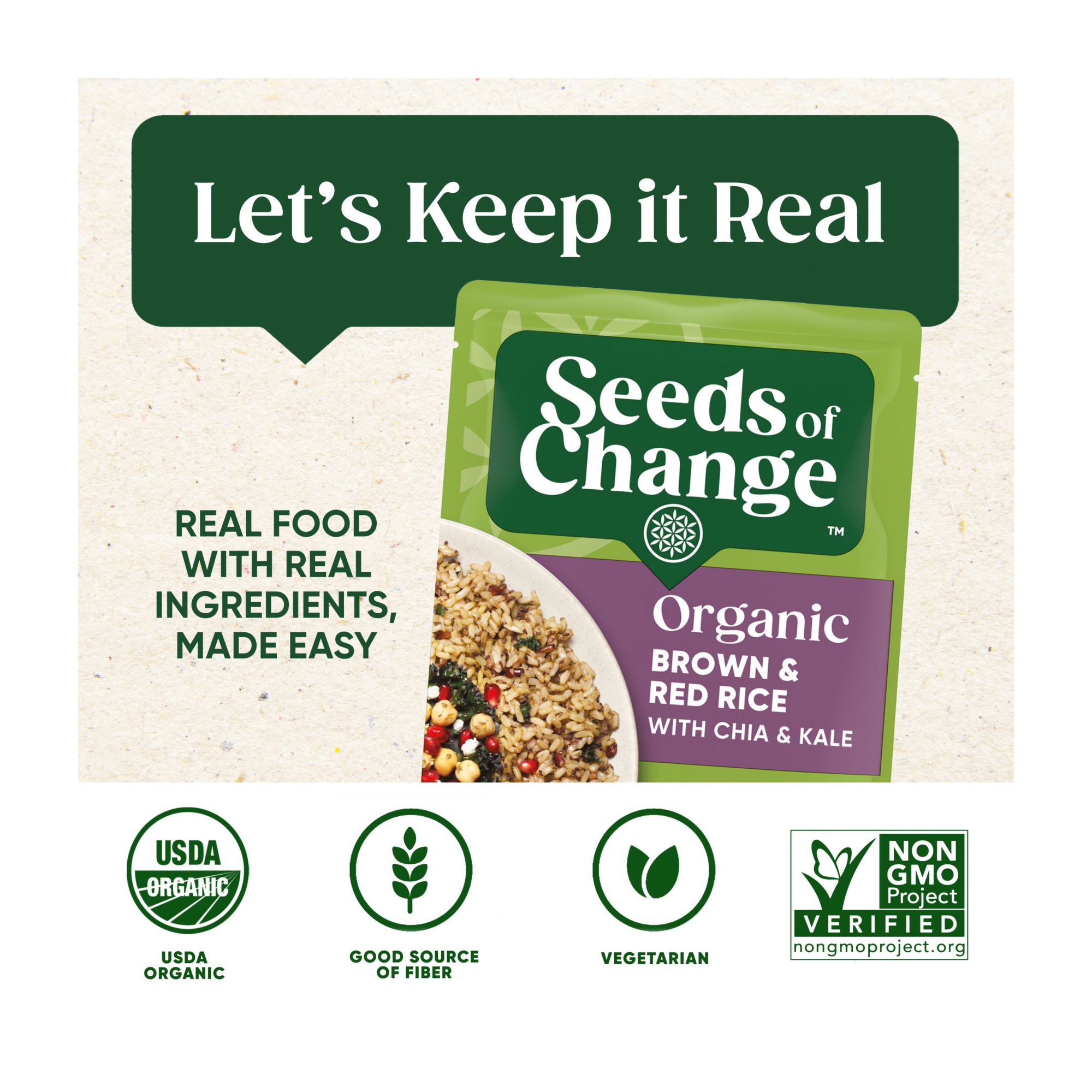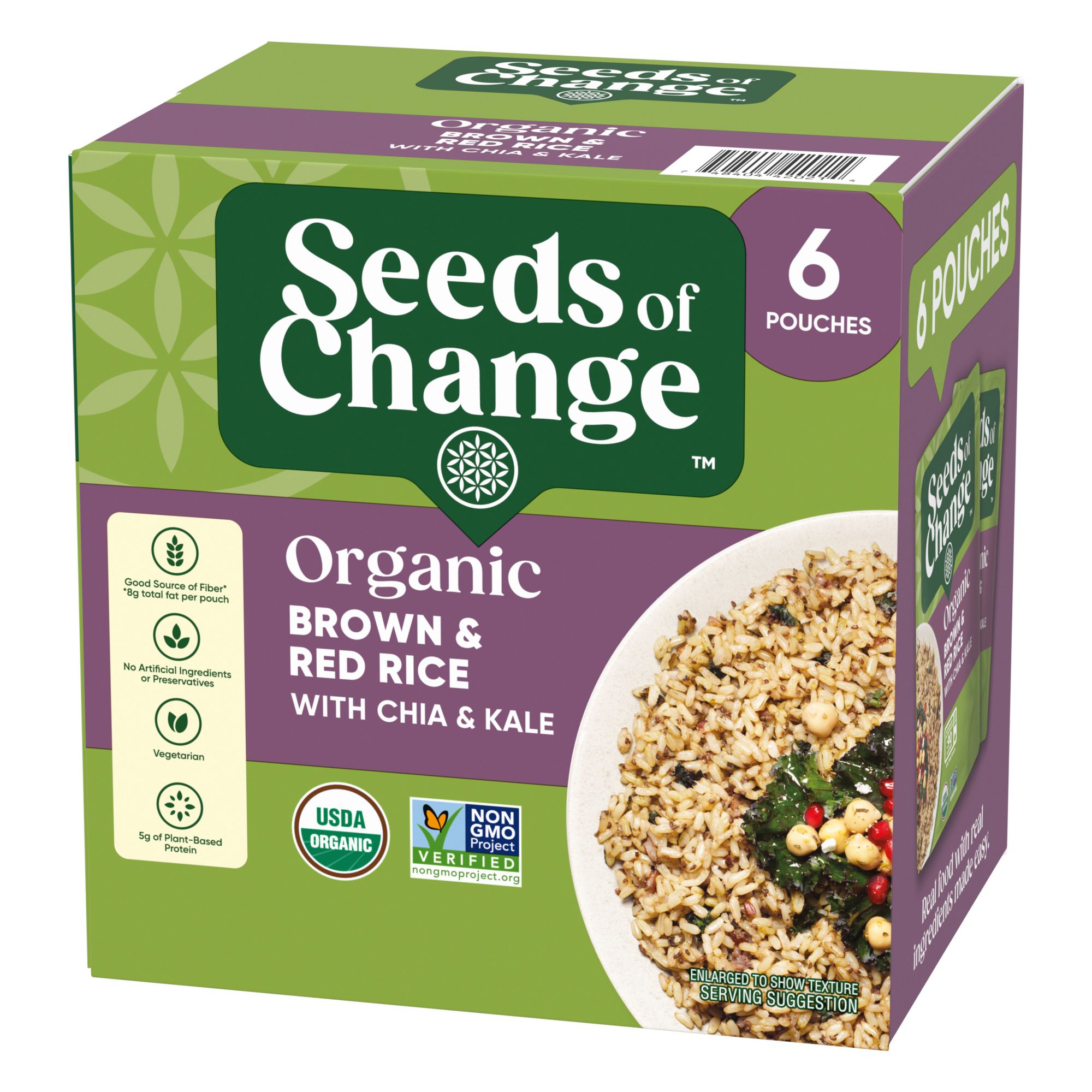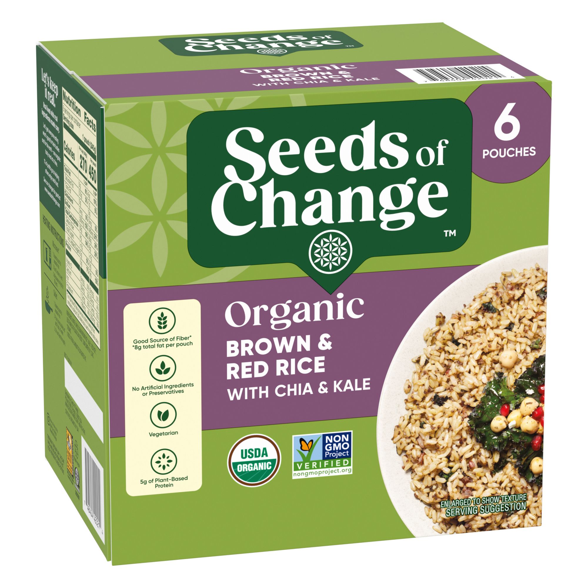 Seeds of Change Certified organic brown and red rice with chia and kale brings everything you need for a filling, nutritious rice side dish — and it's easy to prepare, so you can enjoy wholesome deliciousness in less than two minutes, this dish is the perfect addition to the subtle sweetness and nutty aroma of the red and brown rice blend. To prepare, simply squeeze the pouch to separate the rice, tear 2" from the top, and place it in a microwave for about 90 seconds. You can also make a yummy rice medley in a skillet with water, some butter and a dash of olive oil to accent the flavors. Serve a vegetarian-friendly dish to your guests by pairing Seeds of Change brown and red rice with creamy mushroom sauce, trimmed asparagus and sliced red peppers. For a casual lunch, you can prepare your rice blend with chicken sausage, black beans and Gouda cheese. Seeds of Change rice is made with USDA-certified organic ingredients that are completely free of artificial flavors, colors and preservatives; enjoy fresh ingredients while feeling connected to nature. Seeds of Change brand believes that real organic food, carefully prepared with wholesome ingredients, brings exceptional flavor. They are committed to donating a portion of all profits to FoodCorps to help plant nutritious seeds through school growing programs across the country.