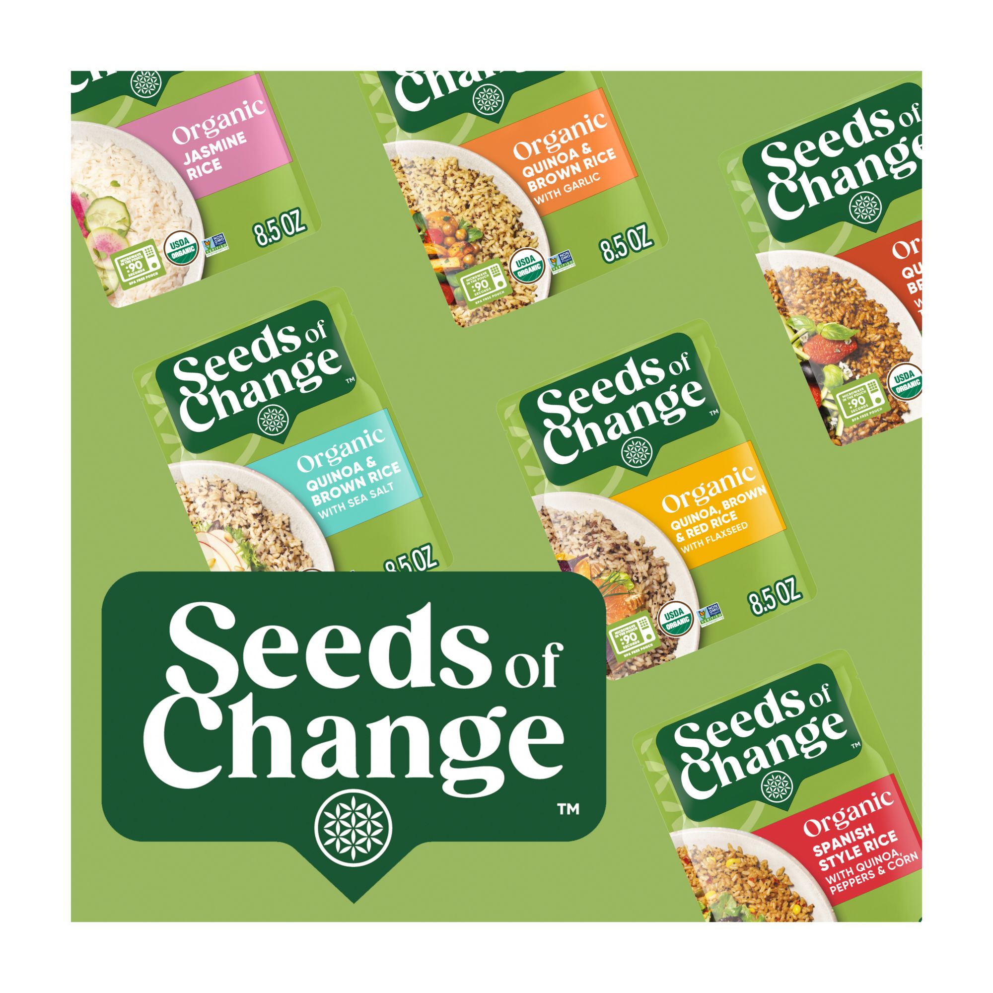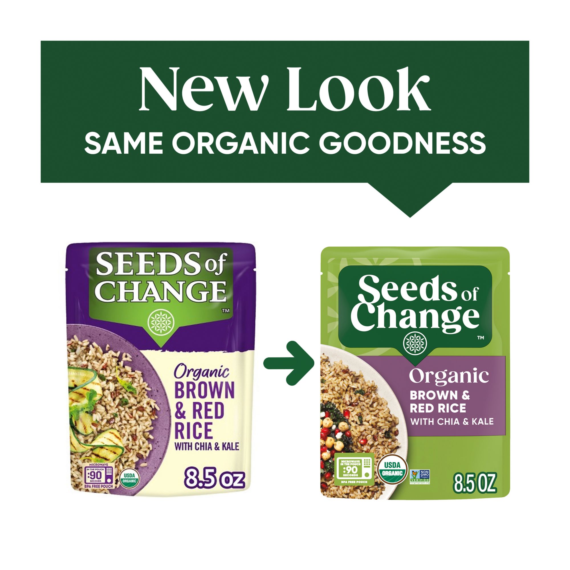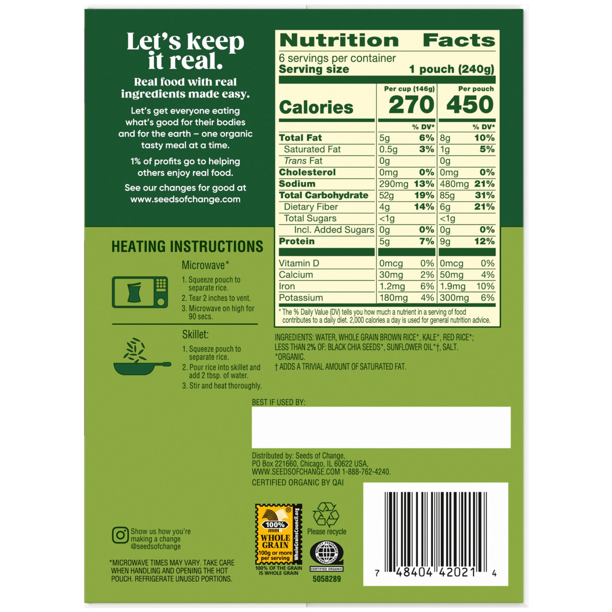 Seeds of Change Certified organic brown and red rice with chia and kale brings everything you need for a filling, nutritious rice side dish — and it's easy to prepare, so you can enjoy wholesome deliciousness in less than two minutes, this dish is the perfect addition to the subtle sweetness and nutty aroma of the red and brown rice blend. To prepare, simply squeeze the pouch to separate the rice, tear 2" from the top, and place it in a microwave for about 90 seconds. You can also make a yummy rice medley in a skillet with water, some butter and a dash of olive oil to accent the flavors. Serve a vegetarian-friendly dish to your guests by pairing Seeds of Change brown and red rice with creamy mushroom sauce, trimmed asparagus and sliced red peppers. For a casual lunch, you can prepare your rice blend with chicken sausage, black beans and Gouda cheese. Seeds of Change rice is made with USDA-certified organic ingredients that are completely free of artificial flavors, colors and preservatives; enjoy fresh ingredients while feeling connected to nature. Seeds of Change brand believes that real organic food, carefully prepared with wholesome ingredients, brings exceptional flavor. They are committed to donating a portion of all profits to FoodCorps to help plant nutritious seeds through school growing programs across the country.
