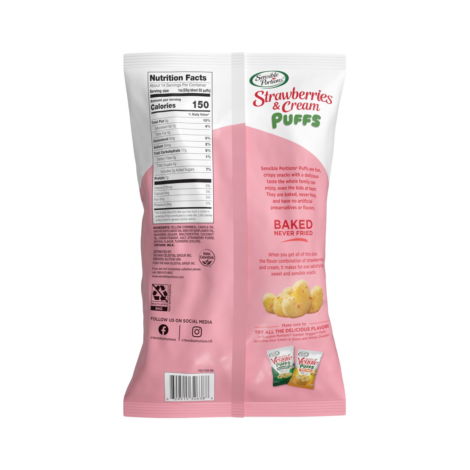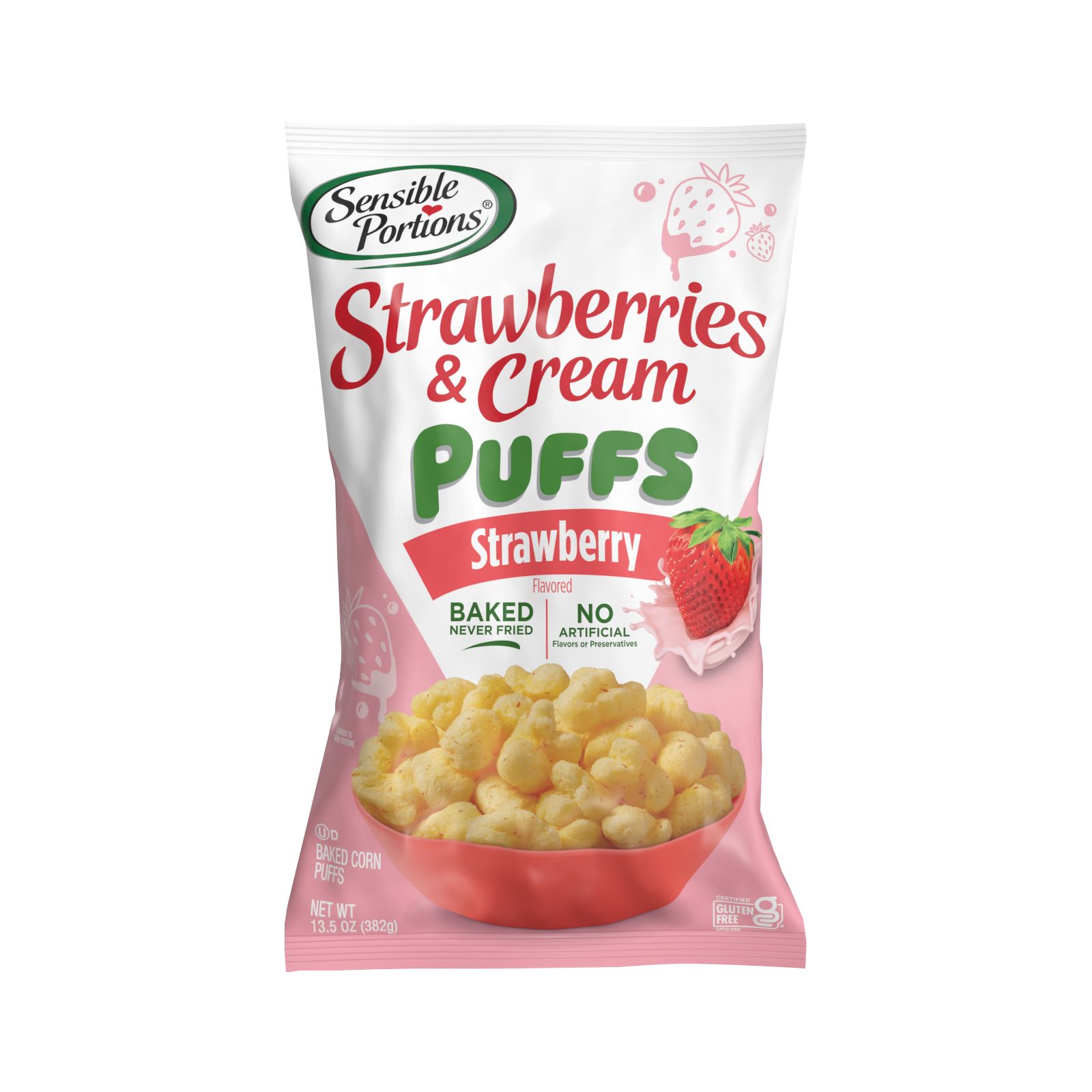 Sensible Portions Strawberries & Cream Puffs are fun, crispy snacks with a delicious taste the whole family can enjoy, even the kids at heart. They are baked, never fried and have no artificial preservatives or flavors. When you get all of this plus the flavor combination of strawberries & cream, it makes for one satisfying, sweet and sensible snack. Grab a bag today!