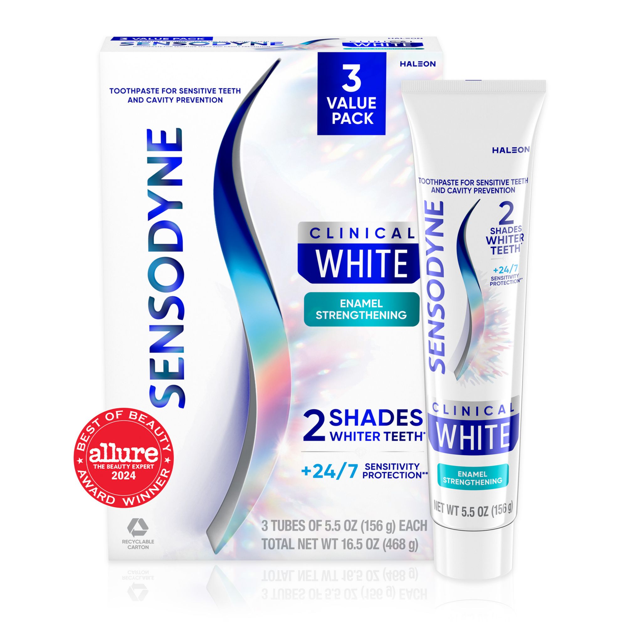 2024 Allure Best of Beauty Winner. Sensodyne Clinical White Enamel Strengthening toothpaste provides clinically proven whitening, specially designed for sensitive teeth. Delivering two shades whiter teeth (1) and 24/7 sensitivity protection (2), Sensodyne Clinical White is also enamel safe and clinically proven to strengthen enamel. Sensodyne Clinical White provides all the benefits of a daily anticavity fluoride toothpaste, is great-tasting, and leaves you with minty-fresh breath. Get whiter, brighter teeth (3) without the pain of tooth sensitivity (2) with Sensodyne Clinical White, from Sensodyne, the #1 dentist-recommended brand for sensitive teeth. (1) As shown in an eight-week study (2) with twice daily brushing (3) after eight weeks of twice daily brushing as compared to a non-whitening toothpaste (4). Check locally. Recycling facilities for this product are only available in some communities.