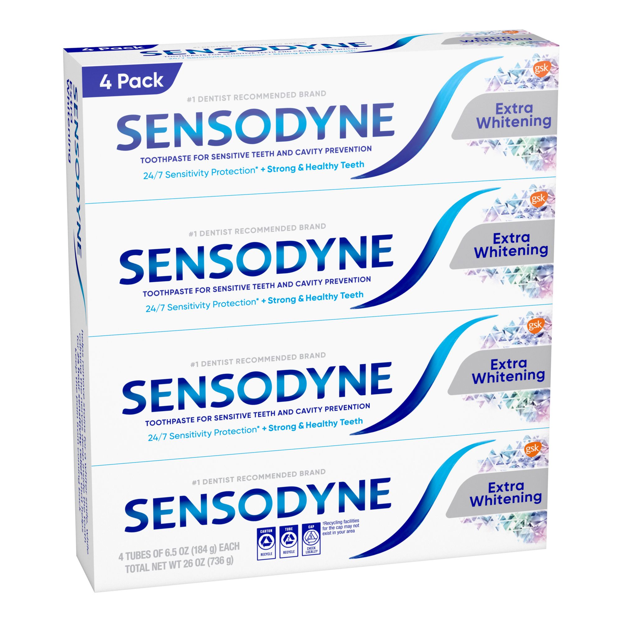 Club pack Sensodyne Extra Whitening toothpaste for sensitive teeth relieves tooth pain caused by sensitive teeth Promotes lasting tooth sensitivity protection and protects teeth against cavities (with twice daily brushing) Sensodyne Extra Whitening sensitive toothpaste helps remove stains for a whiter, brighter smile Sensodyne sensitive toothpaste is the number 1 dentist recommended toothpaste brand for sensitive teeth Best results with twice daily brushing