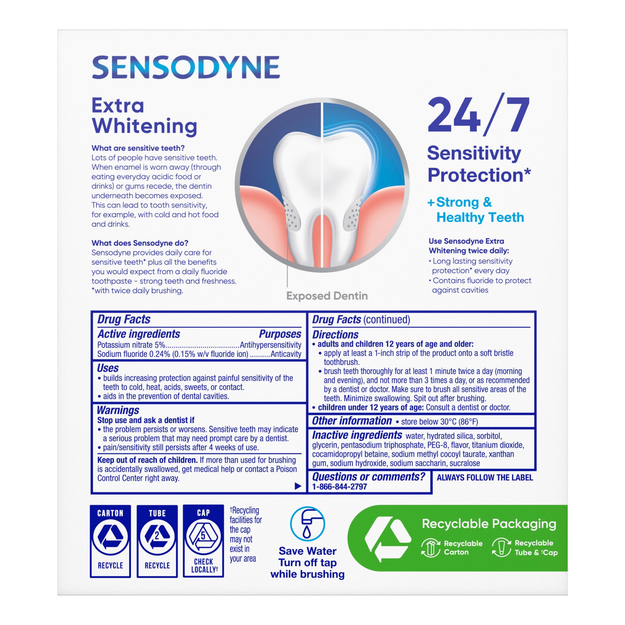 Sensodyne Extra Whitening toothpaste for tooth sensitivity is a Sodium Laurel Sulfate (SLS) free toothpaste that is recommended by dentists for sensitive teeth. Sensodyne cavity protection toothpaste provides proven relief from the pain caused by sensitive teeth and provides long-lasting sensitivity protection.* It removes stains for a whiter smile, and protects teeth against cavities with 24/7 sensitivity protection.*