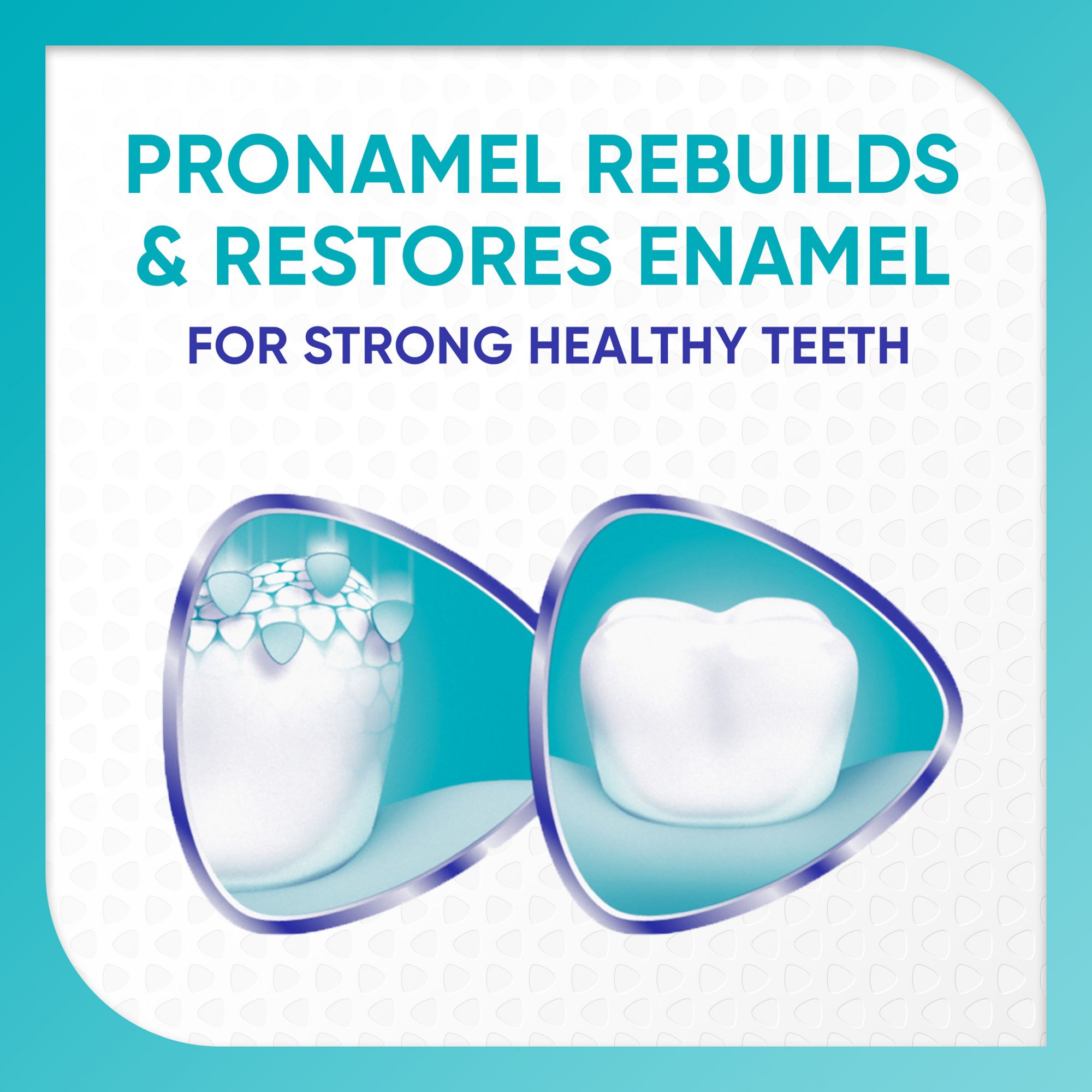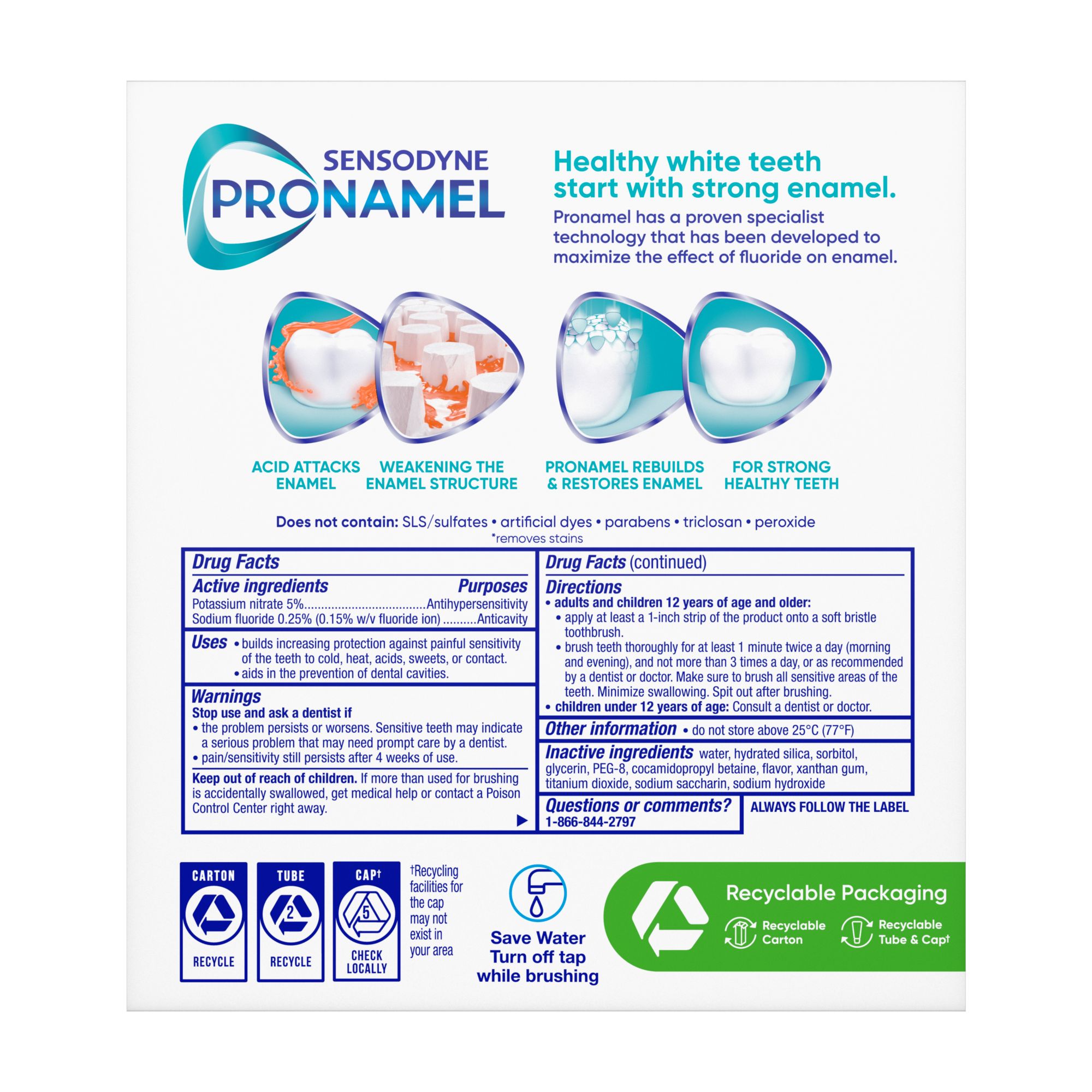 Sensodyne Pronamel Gentle Whitening Advanced Toothpaste for Sensitive Teeth and Cavity Prevention rebuilds and restores tooth enamel for strong healthy teeth. It actively strengthens tooth enamel and helps keep teeth strong, white and protected against dietary acids (1). The powerful whitening removes stains and is gentle on the enamel. Every day, acids in your diet, such as fruit, orange juice, wine and soft drinks can weaken the enamel surface. Over time, the effects of Acid Erosion may include dull, yellow, transparent, thin and weak teeth and can lead to twinges of sensitivity. Pronamel has a proven specialist technology that has been developed to maximize the effect of fluoride on enamel. This helps protect your teeth from the effects of acid erosion and helps to re-harden acid-softened enamel, making it more resistant to future acid challenges. Sensodyne Pronamel Gentle Whitening Advanced does not contain: SLS, Artificial Dyes, Parabens, Triclosan, or Peroxides. Healthy, white teeth start with strong enamel. For best results, use Pronamel Gentle Whitening Advanced toothpaste brush teeth thoroughly for at least 1 minute twice a day (morning and evening). For stronger, healthier enamel and strong teeth for life (3), choose Pronamel the #1 Dentist Recommended toothpaste for Protecting and Strengthening Enamel. (1) with twice daily brushing (2) removes stains (3) with continued twice daily brushing, a healthy diet and regular dental visits.