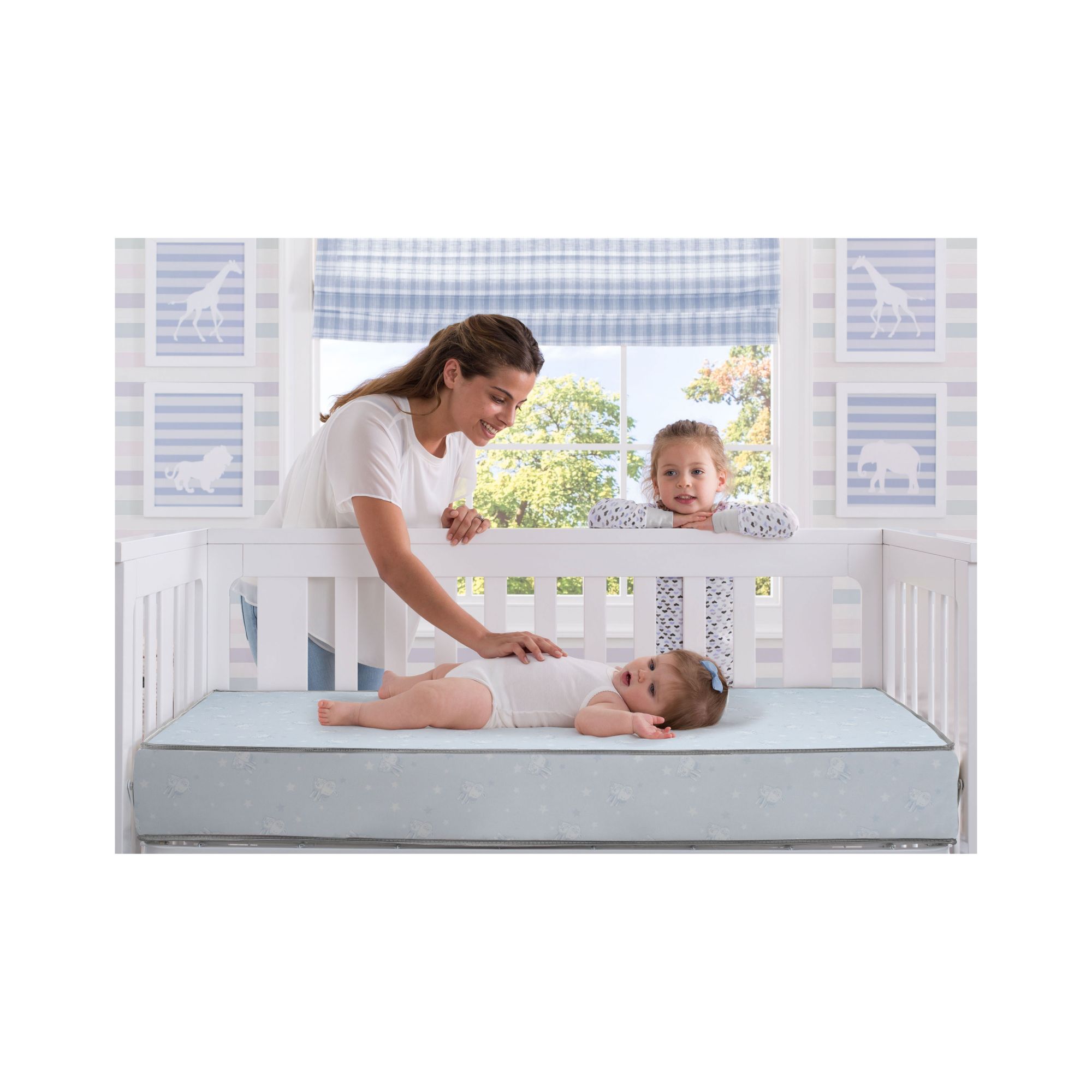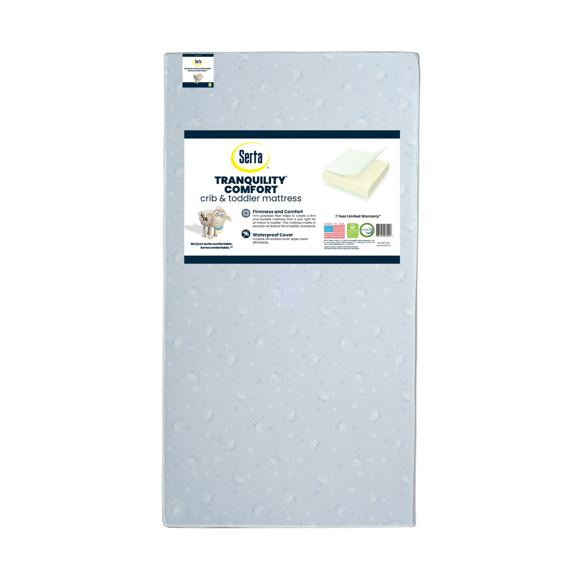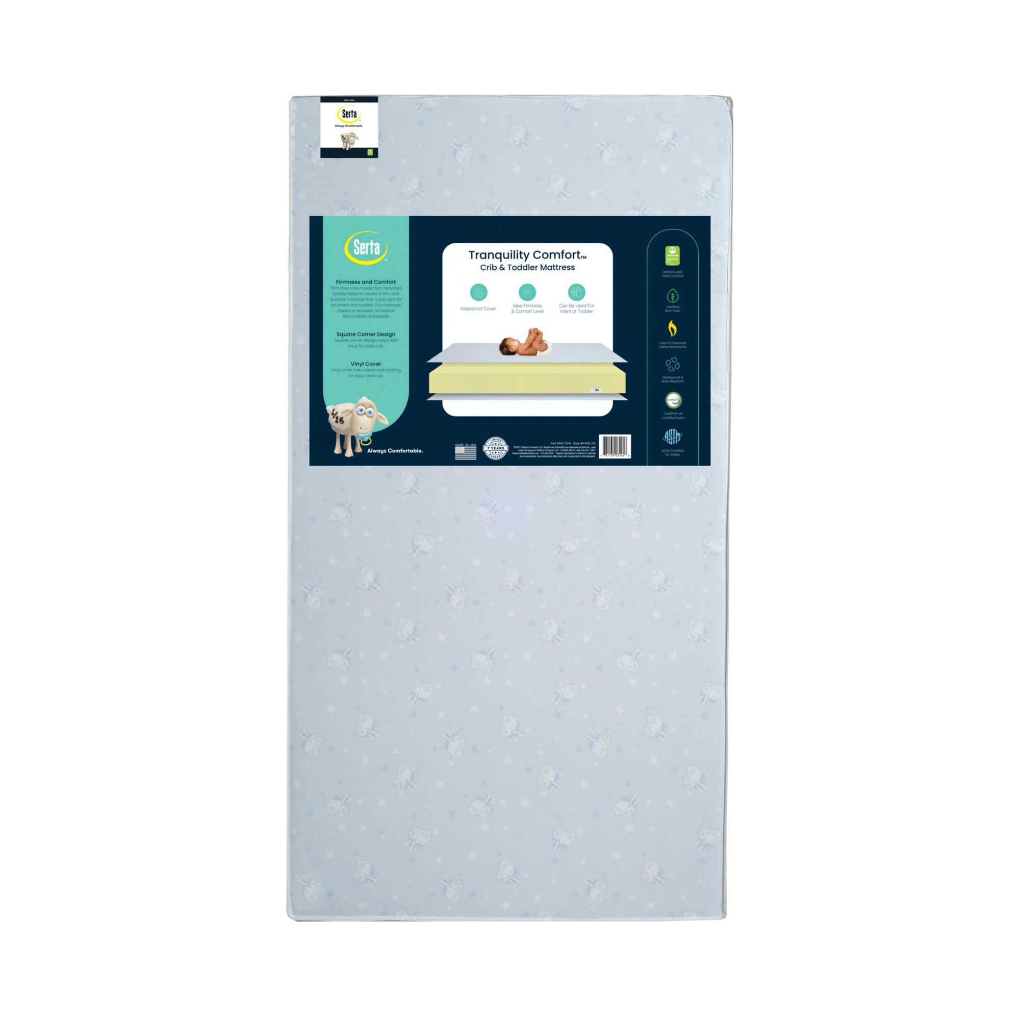 Serta’s Tranquility Comfort Crib and Toddler Mattress is designed with all the features you’d hope to find in your child’s first mattress: a waterproof and stain resistant vinyl cover, cloth binding for long-lasting durability, plus a lightweight construction that’s finished with square corners to help with a secure fit inside the crib. It’s also designed to stay with your child from birth through their toddler years, just flip it as your child grows; the labeled infant and toddler sides provide the ideal support and comfort for each age range.