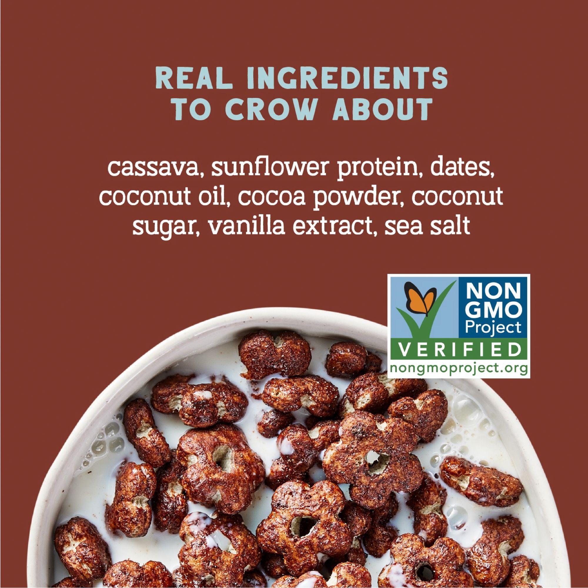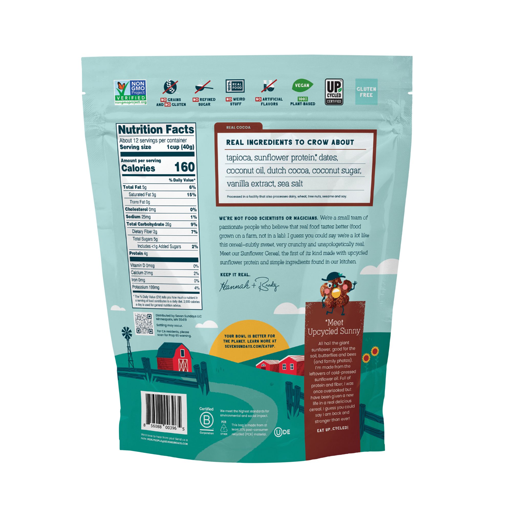 A chocolate cereal with only 1g of added sugar? 100%. Seven Sundays sunflower cereal has nothing but real food in it – no magic, no tricks, no cuckoo. It has a pretty cool story too that starts with up cycled sunflower seeds that are high in protein and fiber, so it’s not only good for you, it’s good for the darn whole planet. This crunchy cocoa sunflower cereal is made with real cocoa and lightly sweetened with coconut sugar and dates. It pairs perfectly with some sliced bananas and yes, it still makes your milk chocolate!