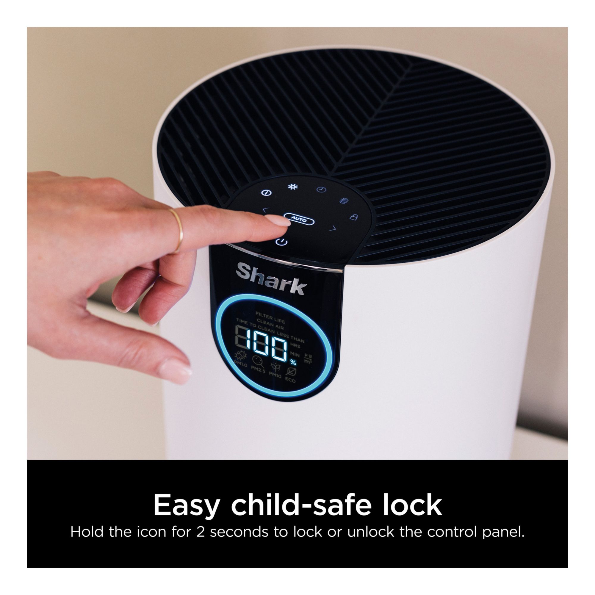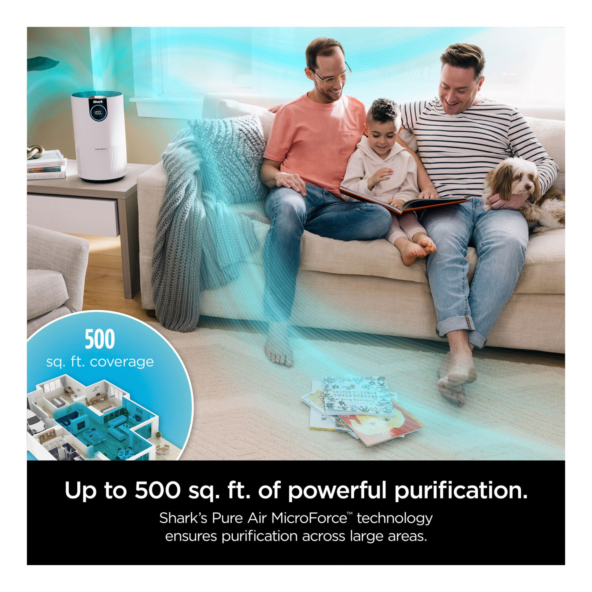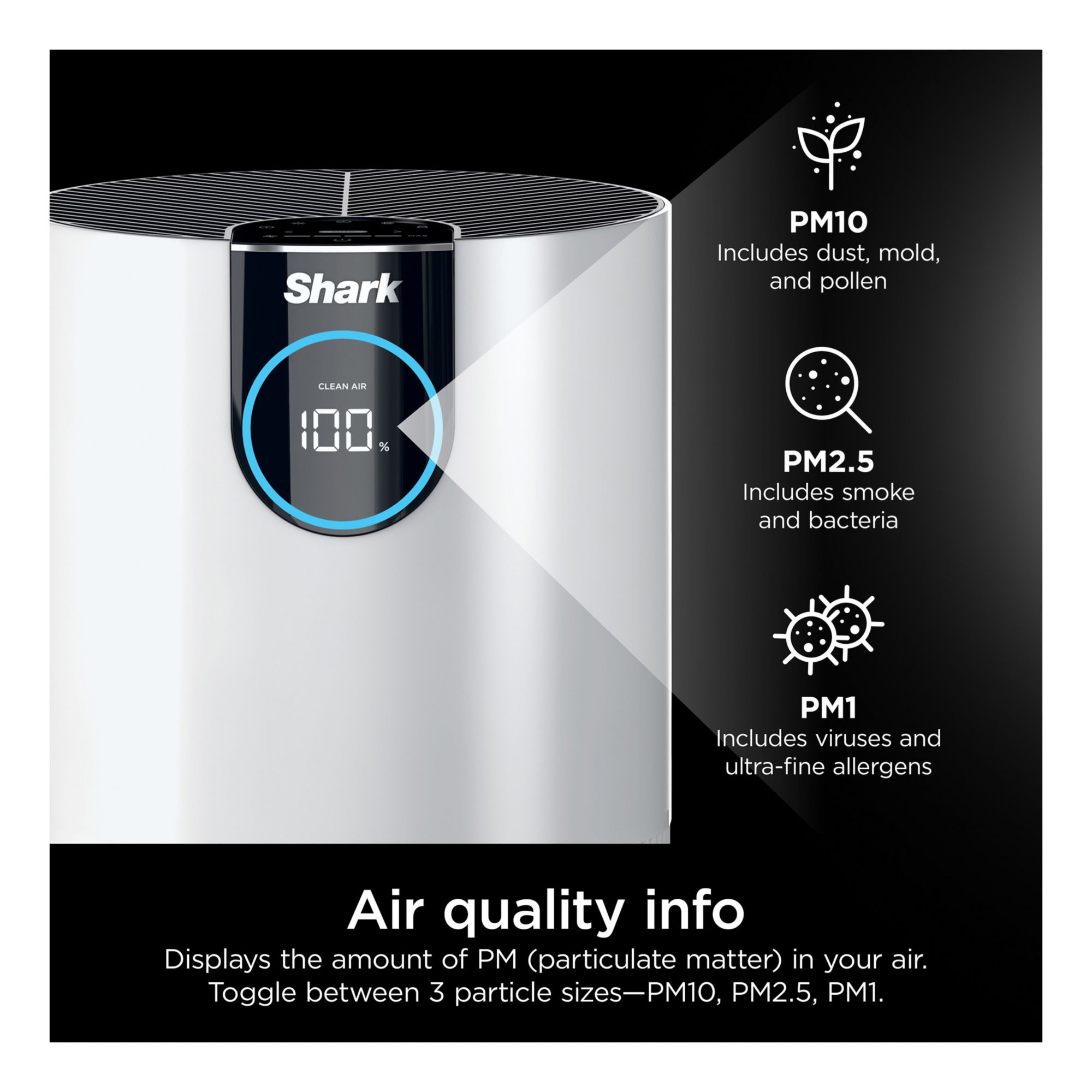 Pure Air Microforce uses a powerful fan to deliver fast, powerful, and quiet purification in small, compact canister design. Powerfully purifiers spaces up to 500 sq. ft., based on 1 air change per hour. Perfect for bedrooms, offices, nurseries and more. Shark’s Anti-Allergen* NANOSEAL Filter with true HEPA captures 99.98% of large, small and micro-sized particles (based on IEST-RP-CC007.3, 0.1–0.2 microns). Clean Sense IQ tracks air quality and auto-adjusts power to constantly maintain clean air in your home. The easy-to-use control panel displays data in real time. Purchase replacement filters every 6-12 months, based on continuous use. To purchase Shark Replacement filters, search for HE1FKPRO (on Shark's website). Genuine Shark Filters ensure your air purifier will function and filter properly—off-brand filters can lead to lower reliability and cause damage. Clean Sense IQ measures three particle sizes: PM1, PM2.5, and PM10.