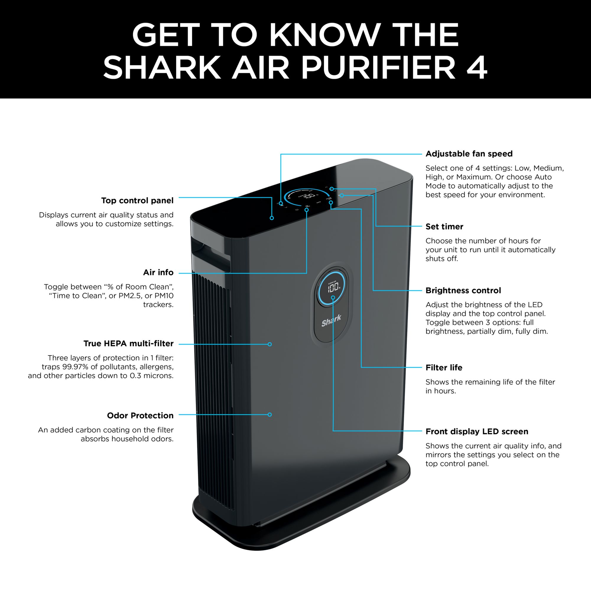 All-Day Clean Air Confidence: Shark’s revolutionary four-fan technology combines with a real-time feedback display to give you clarity and confidence in the air you breathe