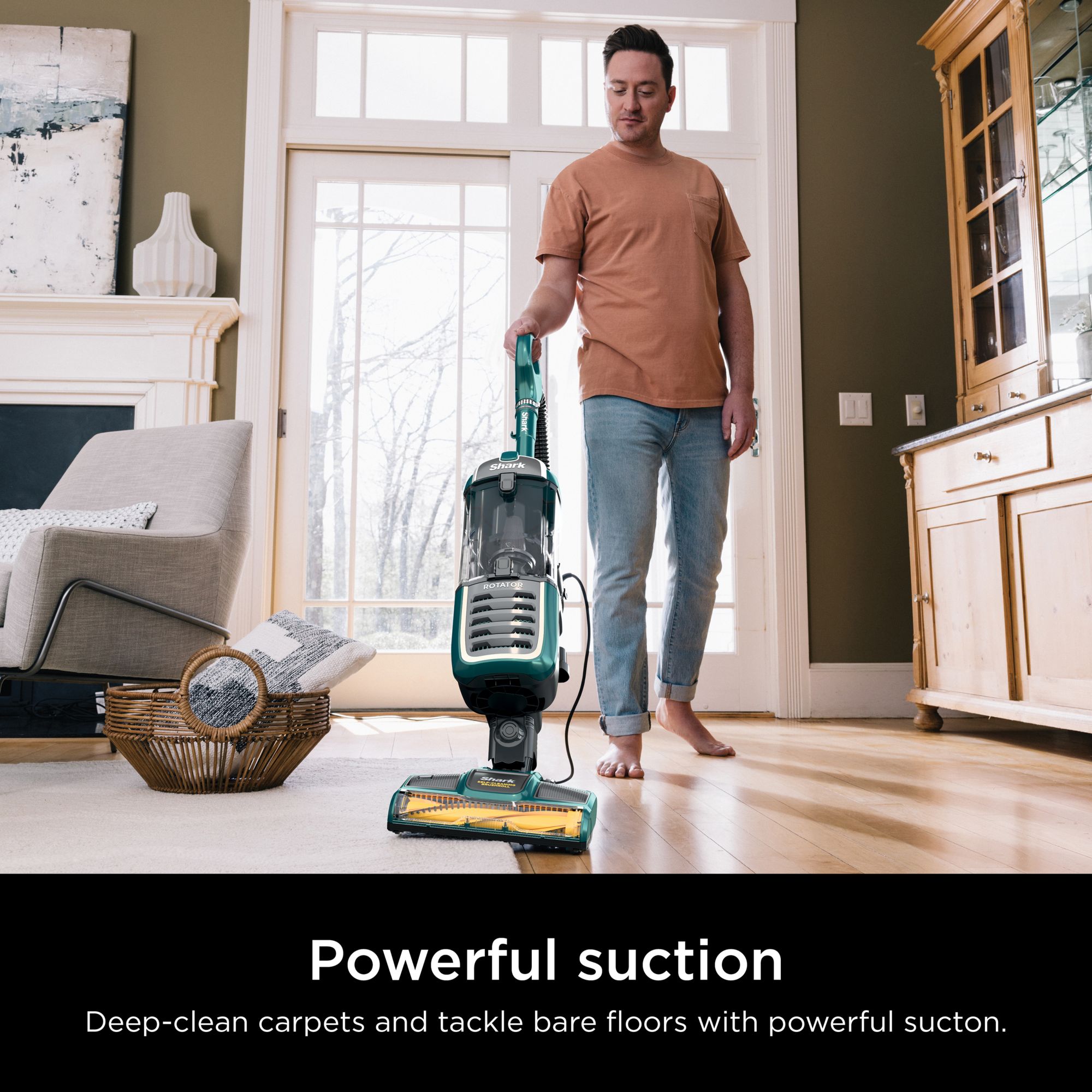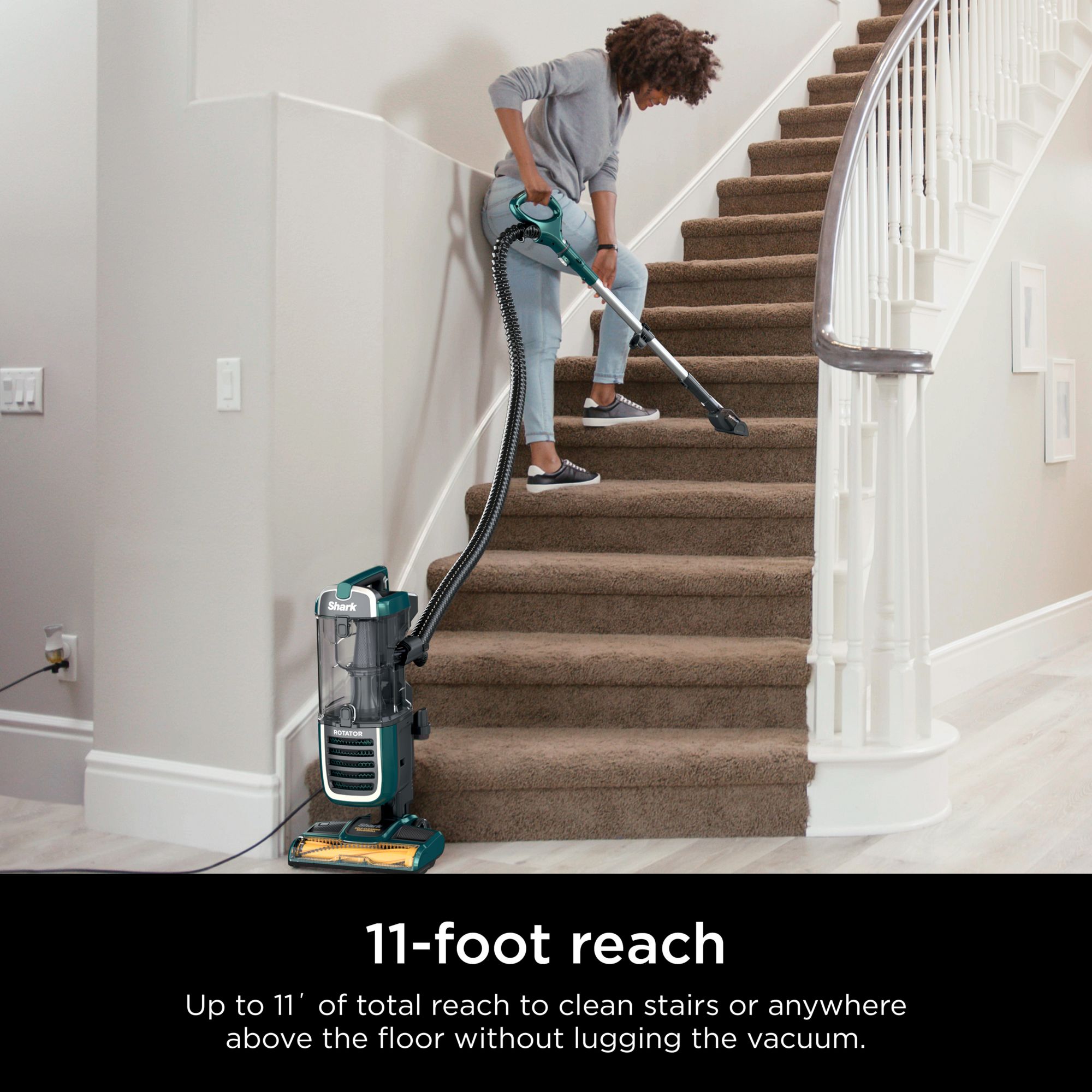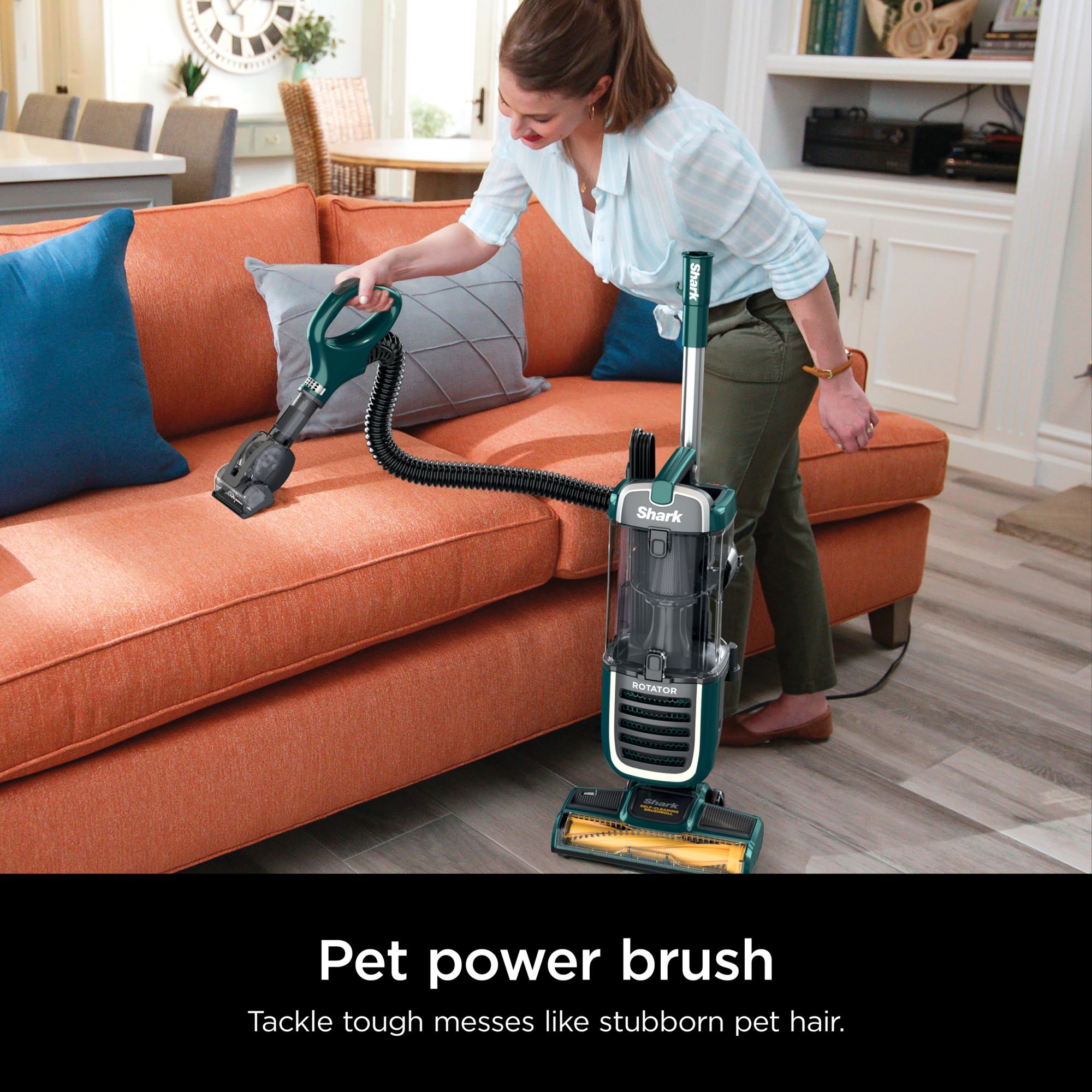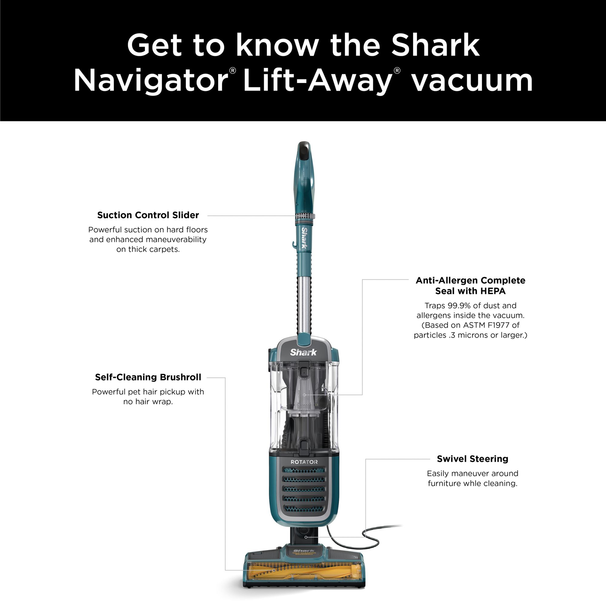 The Shark Rotator Anti-Allergen Pet Plus is designed with pets and their owners in mind. This powerful upright vacuum features Anti-Allergen Complete Seal Technology with a HEPA filter to trap pet hair, dust, dander, and allergens inside the vacuum, keeping them out of the air you breathe. Powerful Shark suction pulls in pet hair and debris, while the self-cleaning brush roll eliminates hair wrap as you clean. The suction control slider on the handle lets you throttle down the suction on carpets for more maneuverability while deep cleaning, and then crank the suction back up to clean hard floors. This vacuum’s large capacity means you won’t have to stop as often to empty the dust cup, so you can finish the job faster and easier. Need to clean up high, above the floor? The hose extends to help you access hard-to-clean spaces, giving you up to 11' of total reach. With Swivel Steering, you can maneuver around your home with ease. The Rotator Anti-Allergen Pet Plus comes with versatile cleaning accessories, including the Pet Power Brush for cleaning furniture, stairs, tabletops, and more, and the Crevice Tool to clean in tough-to-reach spaces. Anti-allergen protection, the suction power to handle pet hair, easy maneuverability, long reach, and the convenience of the brush roll that cleans itself—the Shark Rotator Anti-Allergen Pet Plus has it all.