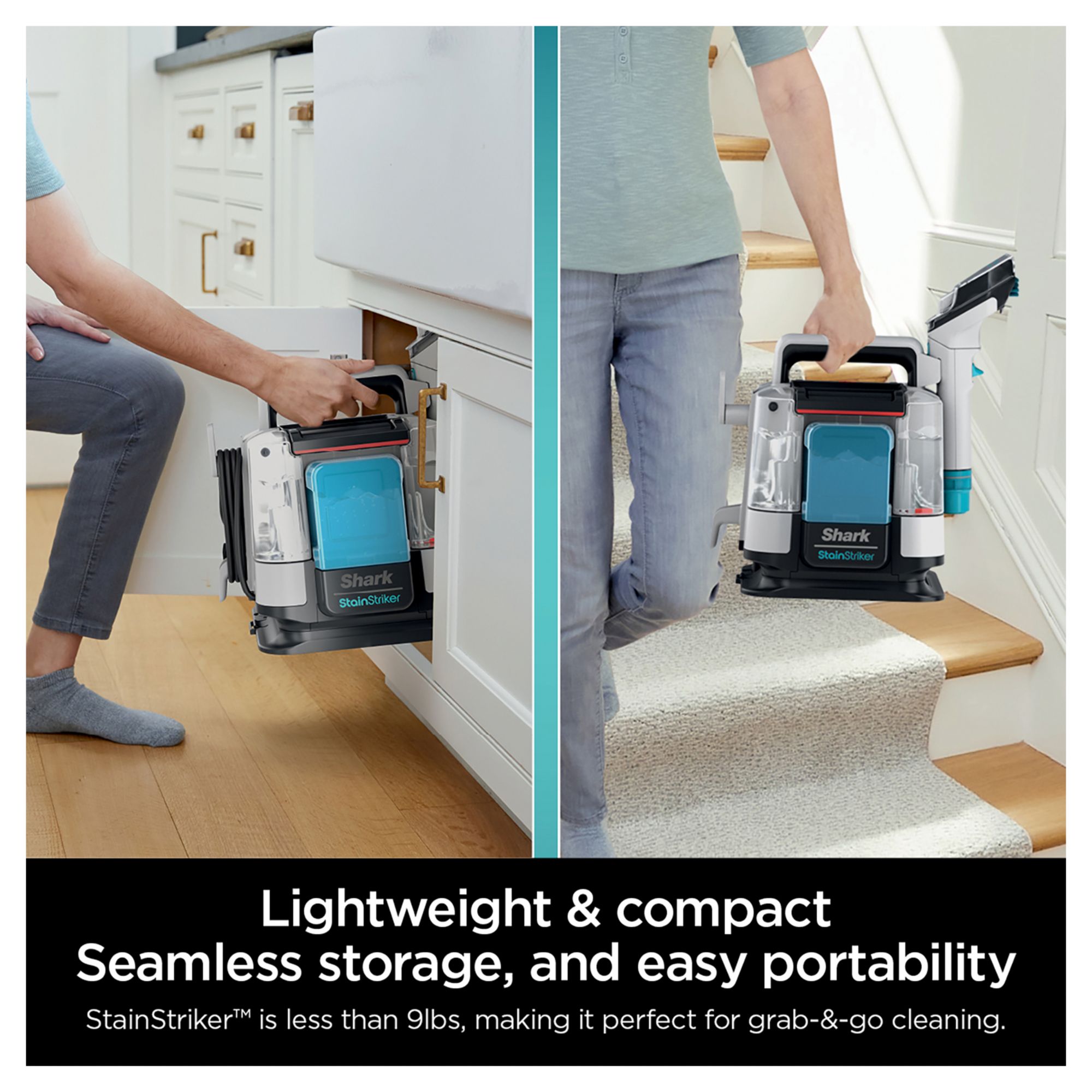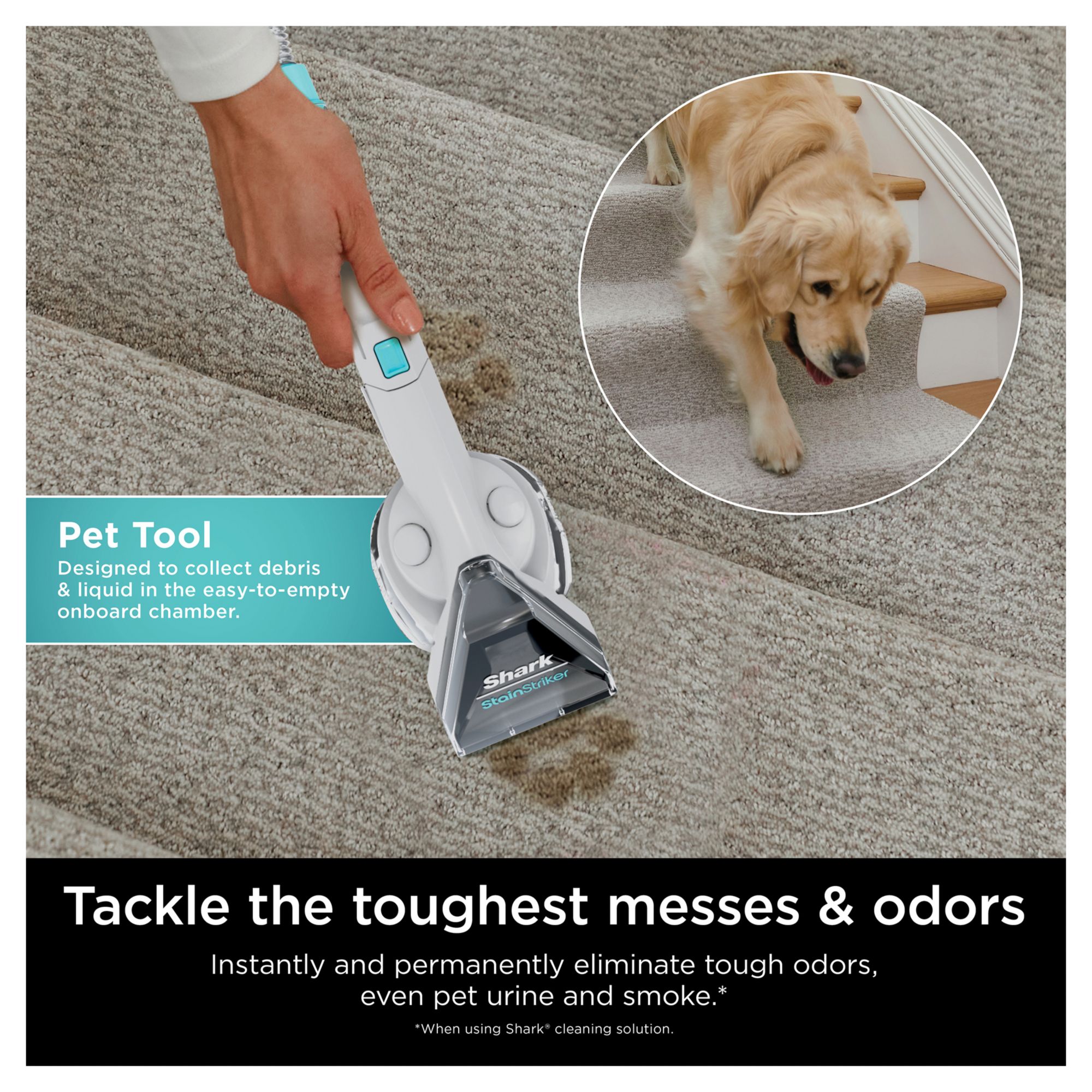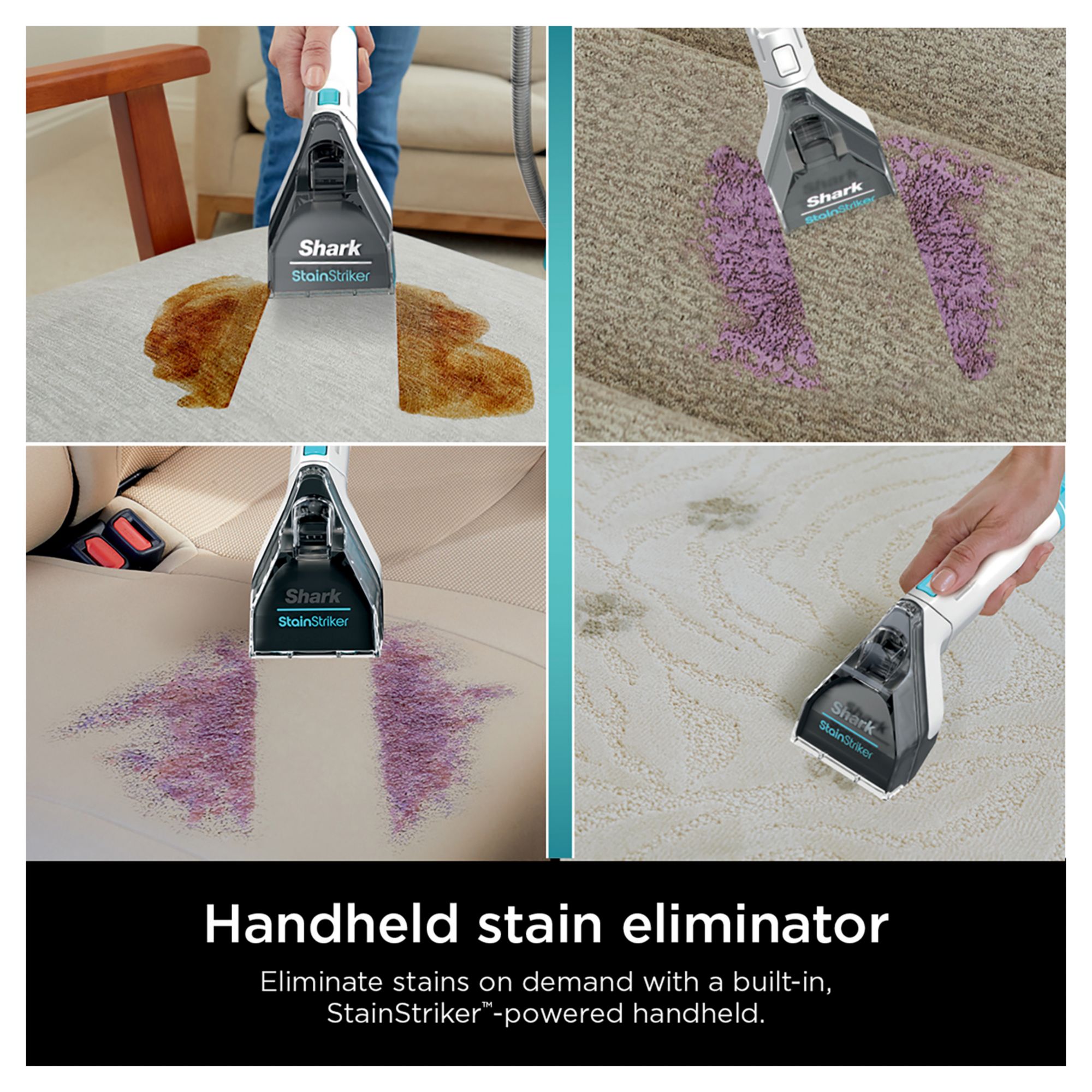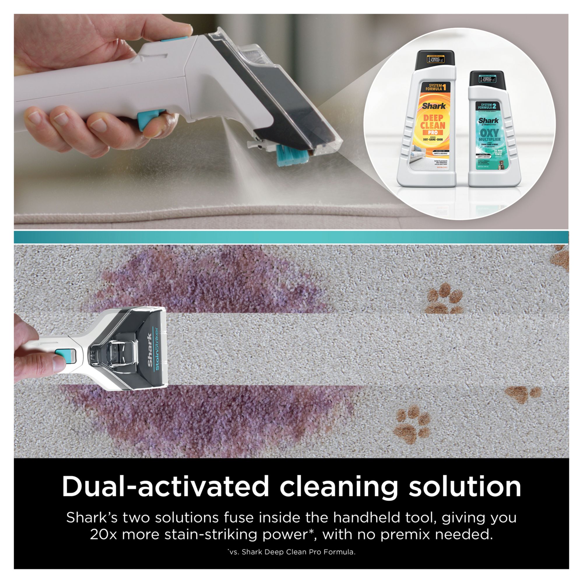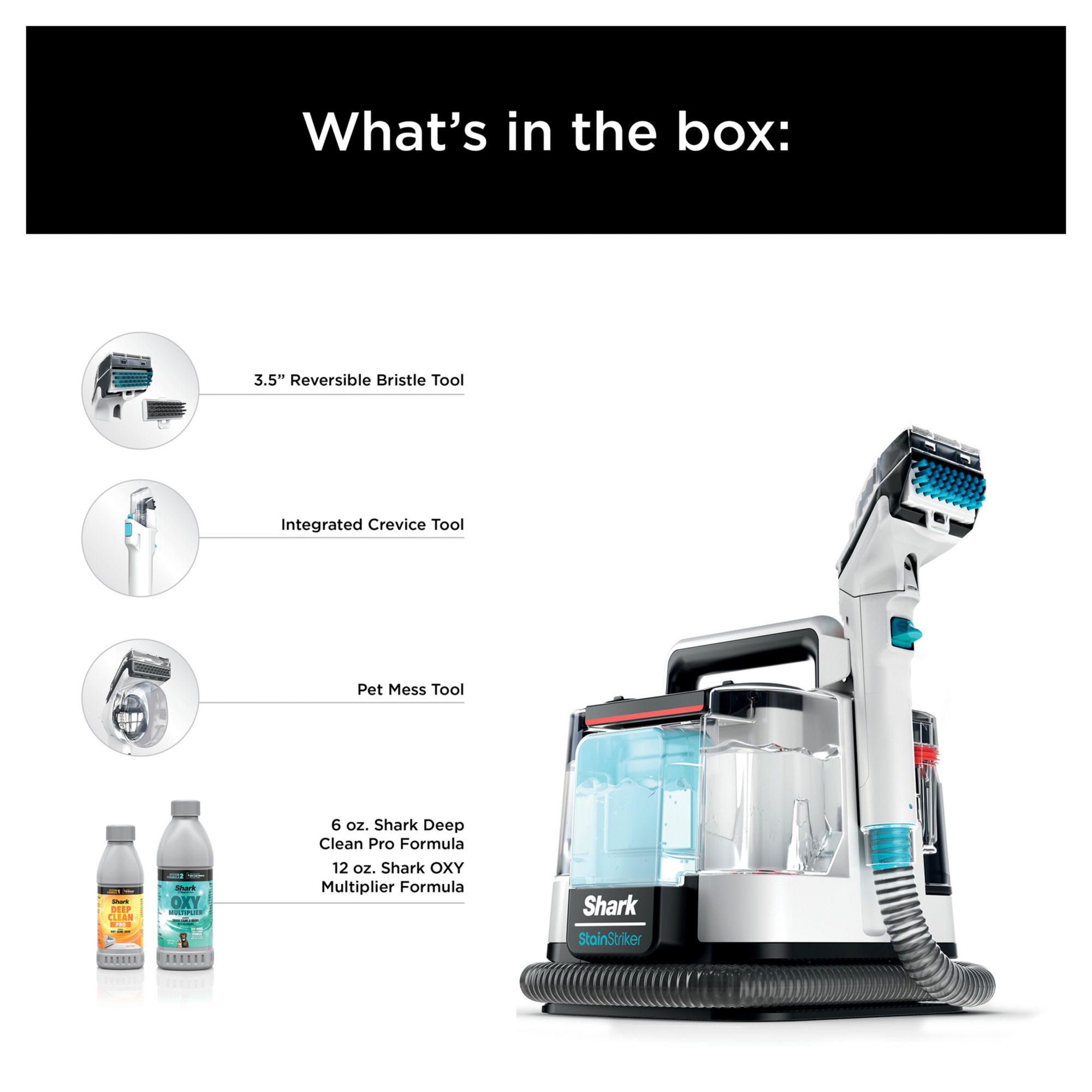 Powerful Tough Stain Eliminator: Dual-activated stain eliminator with no premix required‡, removes stains & odors throughout your home: carpets, area rugs, couches, upholstery, cars & more! 20X More Stain-Striking Power*: Shark's two unique solutions mix & activate inside the handheld stain & spot eliminator to unleash the power of OXY delivering unbeatable tough stain elimination, with no premix required‡ Powerful Suction†: Pulls out liquid and dirt embedded deep down to make carpets, area rugs, stairs, furniture, couches, and upholstery look like new again Perfect for Pets: Eliminates odors instantly and permanently, including pet urine and smoke^ Whole Home Cleaning: Lightweight & compact at under 9 lbs. Clean and remove stains anywhere and conveniently store when finished Only Dual-Activated Formula: Precisely fuses two unique formulas together creating an unstoppable cleaning solution unleashing the power of OXY for effective on-contact stain cleaning Includes Shark StainStriker, integrated crevice tool, 3.5" reversible bristle tool, pet tool, integrated crevice tool, 6 oz. Deep Clean Pro Formula, 12 oz. OXY Multiplier Formula
