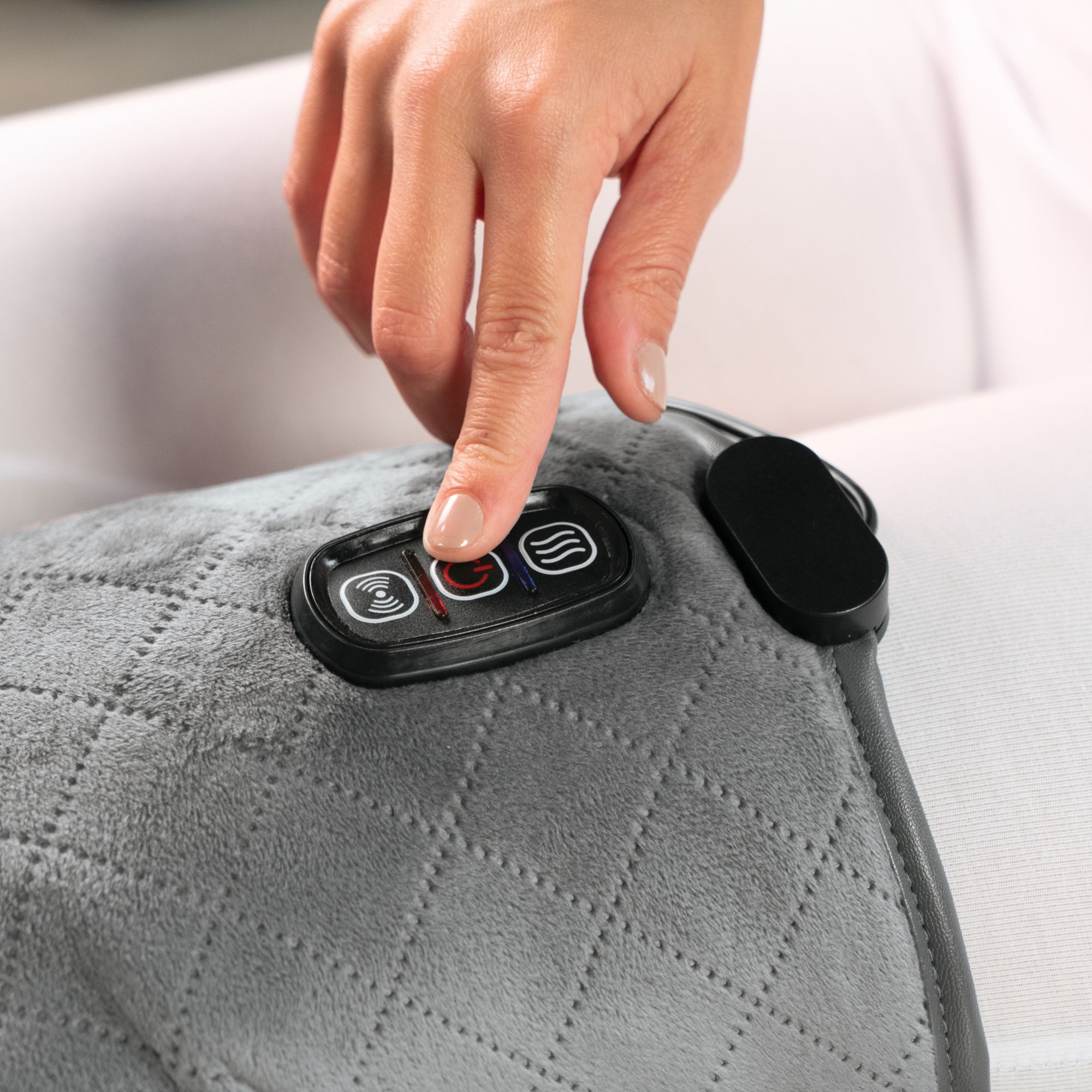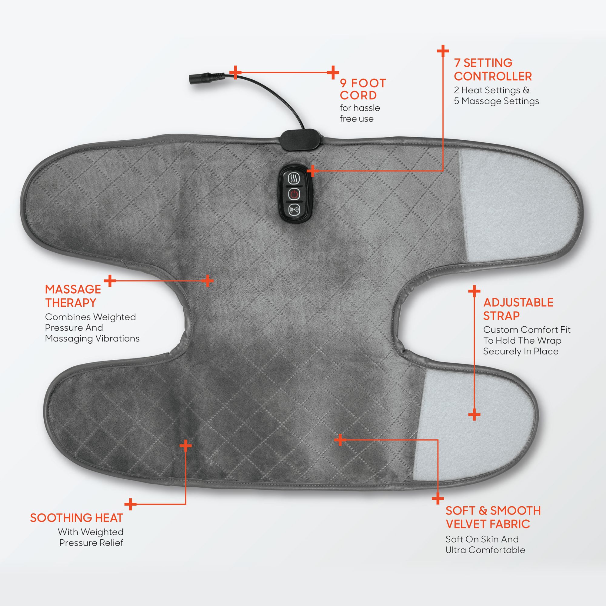 Combines therapeutic heat and relaxing massaging vibrations Soothing heat is absorbed into the weighted clay beads Delivers soothing pressure therapy to muscles and joints Two heat and five massage settings, so you can get the soothing, customized relief anytime you need it Velvet fabric is soft on the skin and ultra-comfortable Adjustable straps securely wrap in place around the knee, thighs, calves, arms and legs Includes Sharper Image Calming Heat Weighted Massaging Knee Wrap Deluxe - Gray, 9' cable, instruction manual