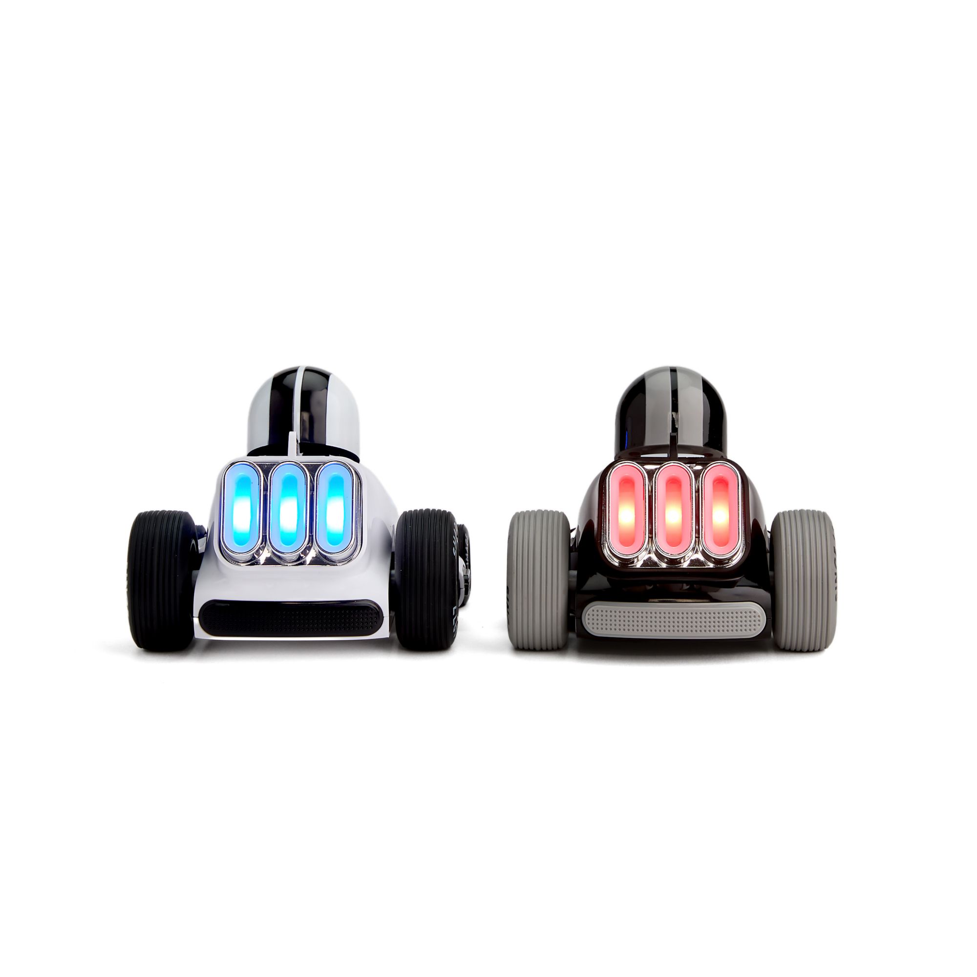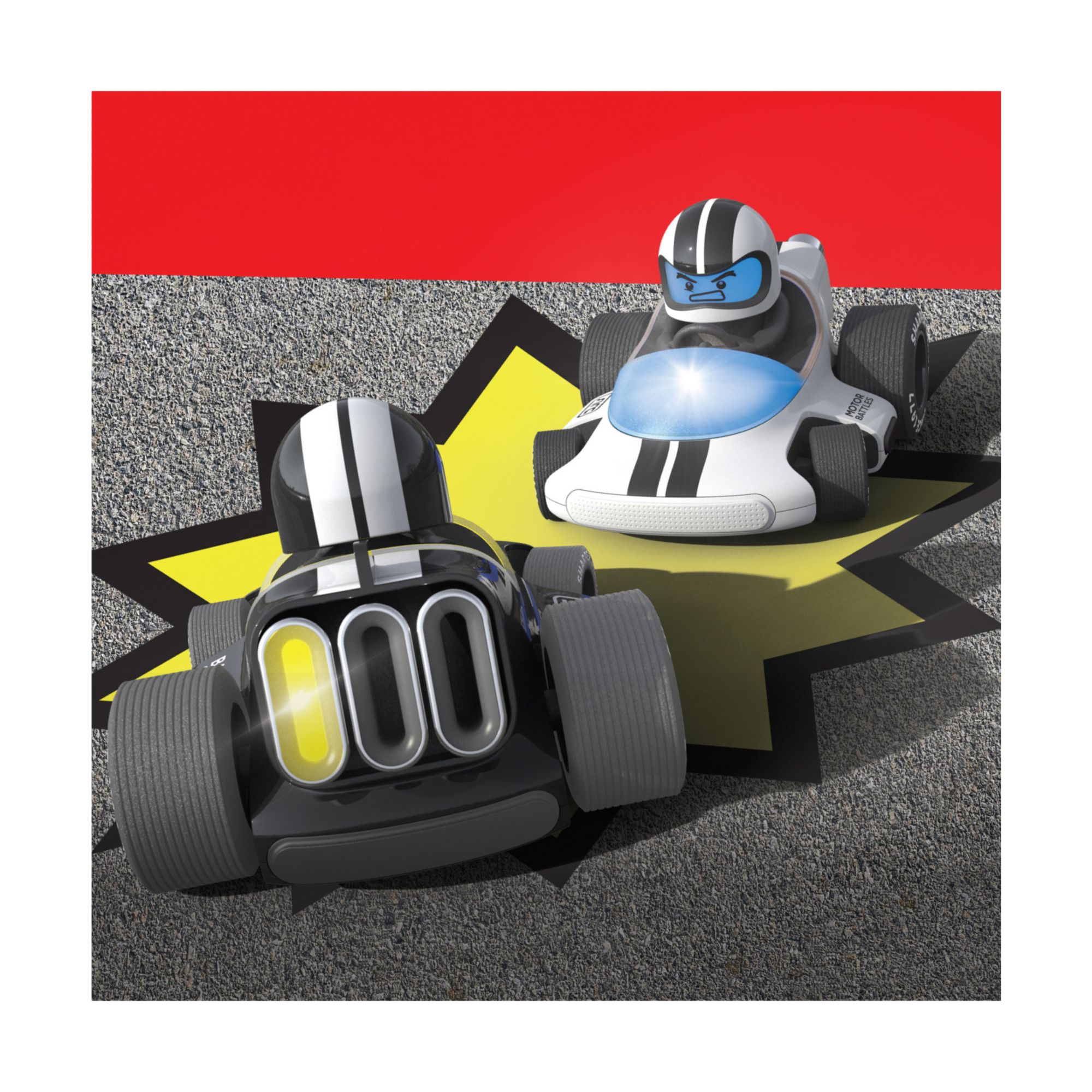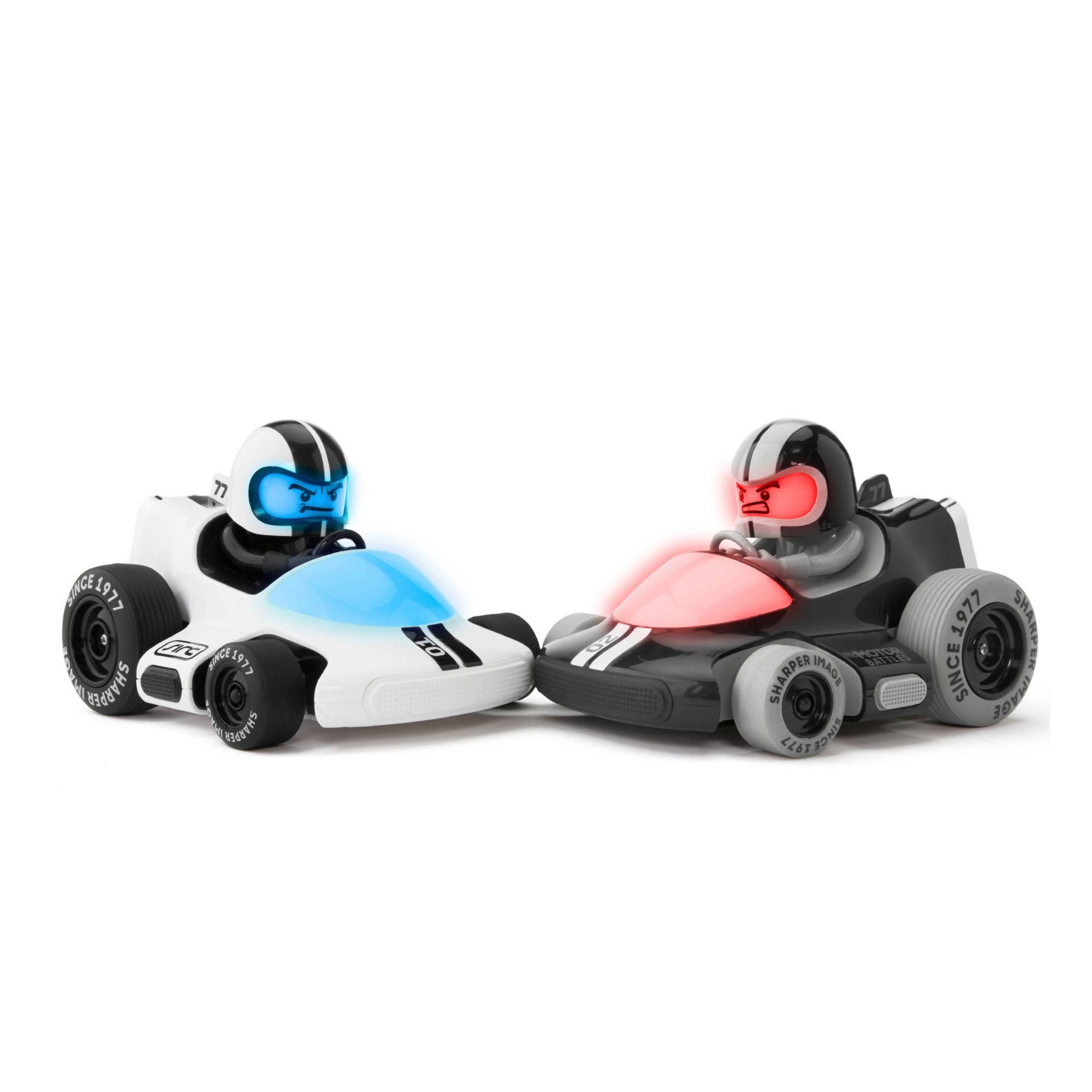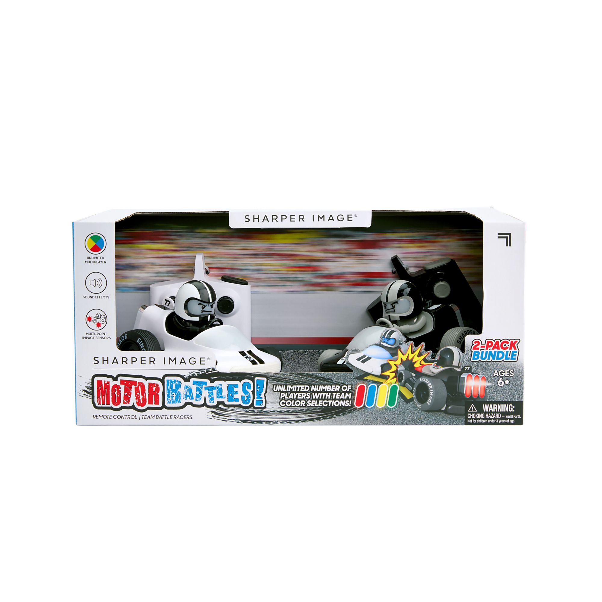 Get ready for high-octane excitement with the Sharper Image Motor Battles RC Team Battle Racers. These innovative remote-controlled cars are tailored for exhilarating head-to-head combat. Players strategically deactivate each other's vehicles by targeting the impact sensors, with each car enduring up to three hits before elimination. Hits are conveniently tracked via LED lights on each vehicle's rear, adding a visual thrill to the competition. Easily choose your team with the color-changing LED lights, enhancing team identification and unity. Expand the battlefield by combining sets to form up to four teams with an unlimited number of players, maximizing the strategic depth and engagement. Featuring intuitive controls and a robust design, these RC battle racers are the perfect choice for anyone eager to inject some competitive spirit and fun into their game sessions.