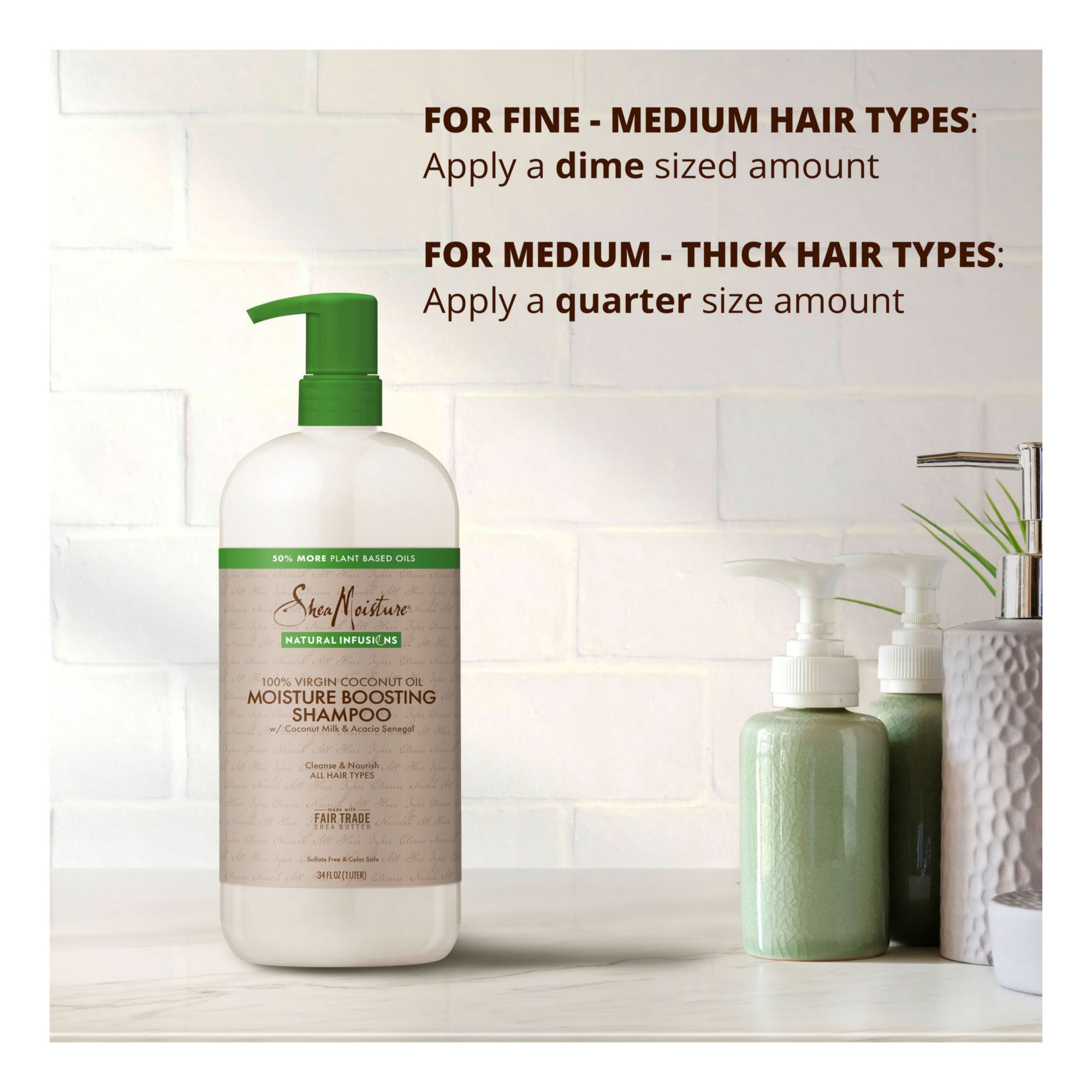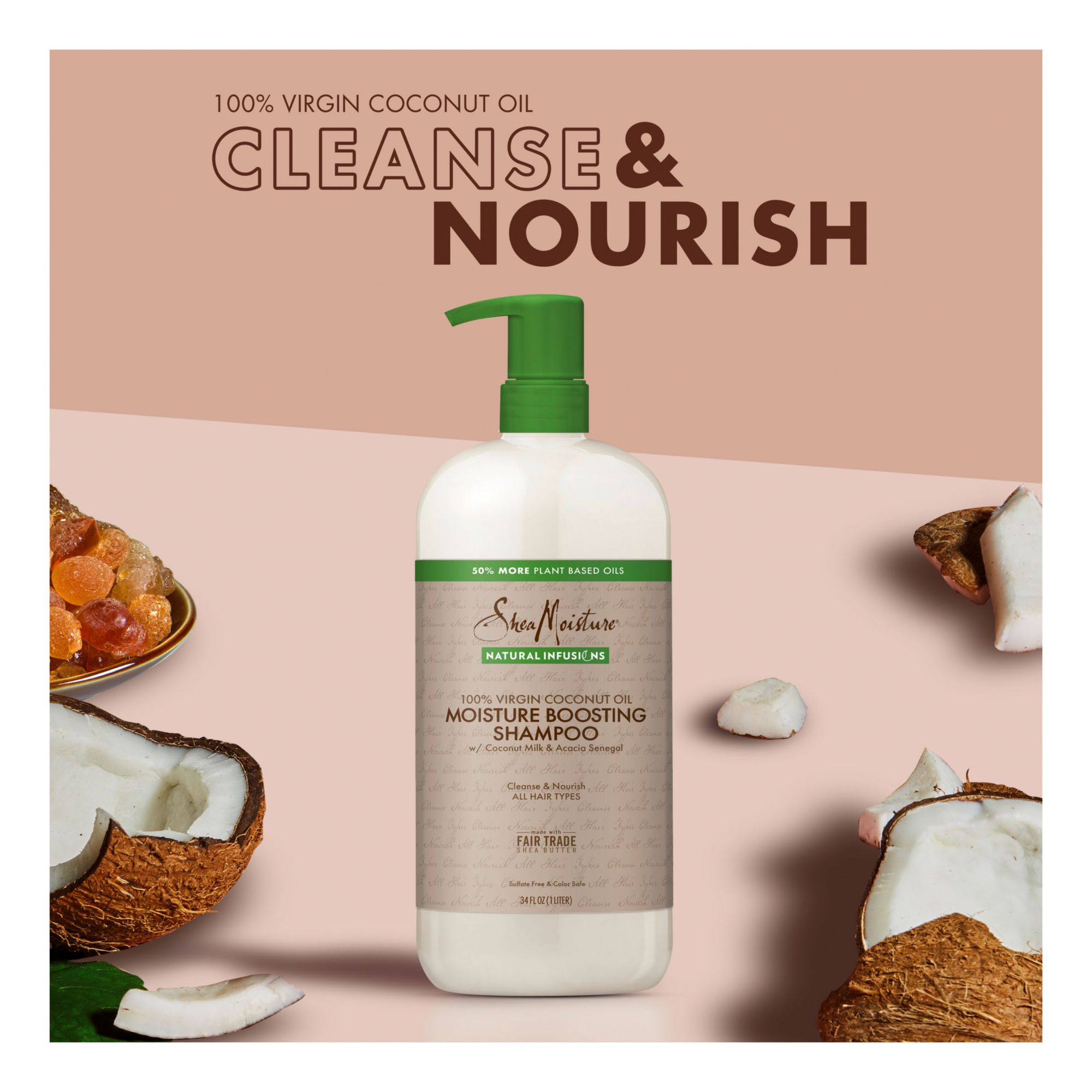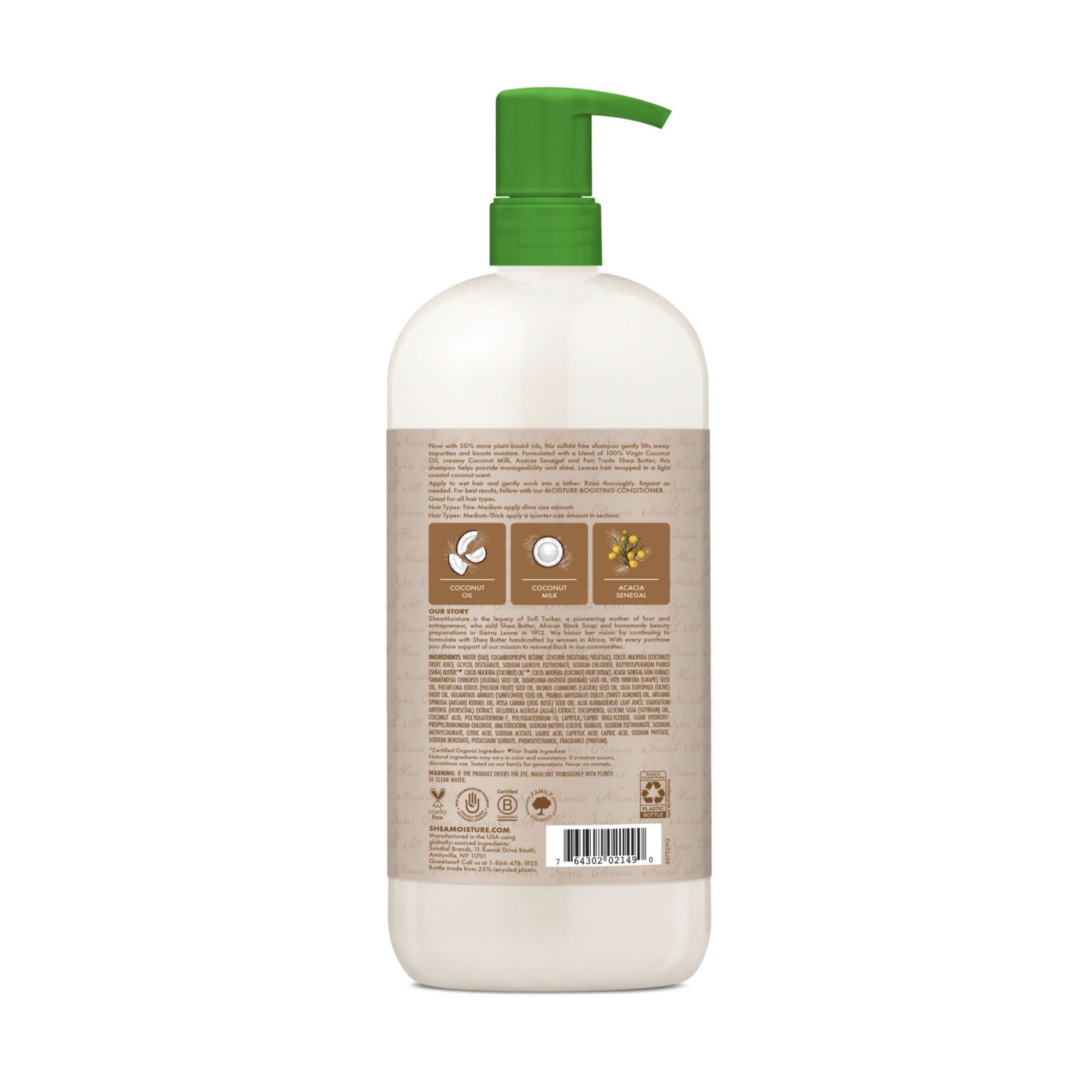 Lift away impurities and boost moisture with gentle SheaMoisture Natural Infusions Moisture Boosting Shampoo. Now with 50% more plant-based oils, this sulfate-free shampoo is formulated with a nourishing blend of 100% virgin coconut, Certified Fair-Trade shea butter and other natural moisturizing ingredients, like coconut milk and acacia senegal. This sulfate-free shampoo is designed for all hair types and is color-safe, and it's the one hair treatment you can count on for that wonderfully clean and moisturized feeling. The coconut oil that's blended into this moisturizing conditioner is great for hair growth because it contains nourishing and hydrating ingredients that keep hair detangled and shiny, while also helping you provide manageability to tame the frizz. Other key ingredients in this hair care product, like the Shea Butter, work nicely with coconut oil as well as the other natural moisturizers infused into this sulfate-free shampoo that leave your hair with a delightful, light, costal coconut scent. How to use? Apply to wet hair and work into a rich lather. Rinse thoroughly and repeat if needed. For best results, follow with SheaMoisture Natural Infusions Moisture Boosting Conditioner. SheaMoisture's Story: SheaMoisture is the legacy of Sofi Tucker, a pioneering mother of four and an entrepreneur, who sold Shea Butter, African Black Soap and homemade beauty preparations in Sierra Leone in 1912. SheaMoisture honors her vision by continuing to formulate with Raw Shea Butter handcrafted by women in Africa. With every purchase, you show support of SheaMoisture's mission to reinvest back in communities.