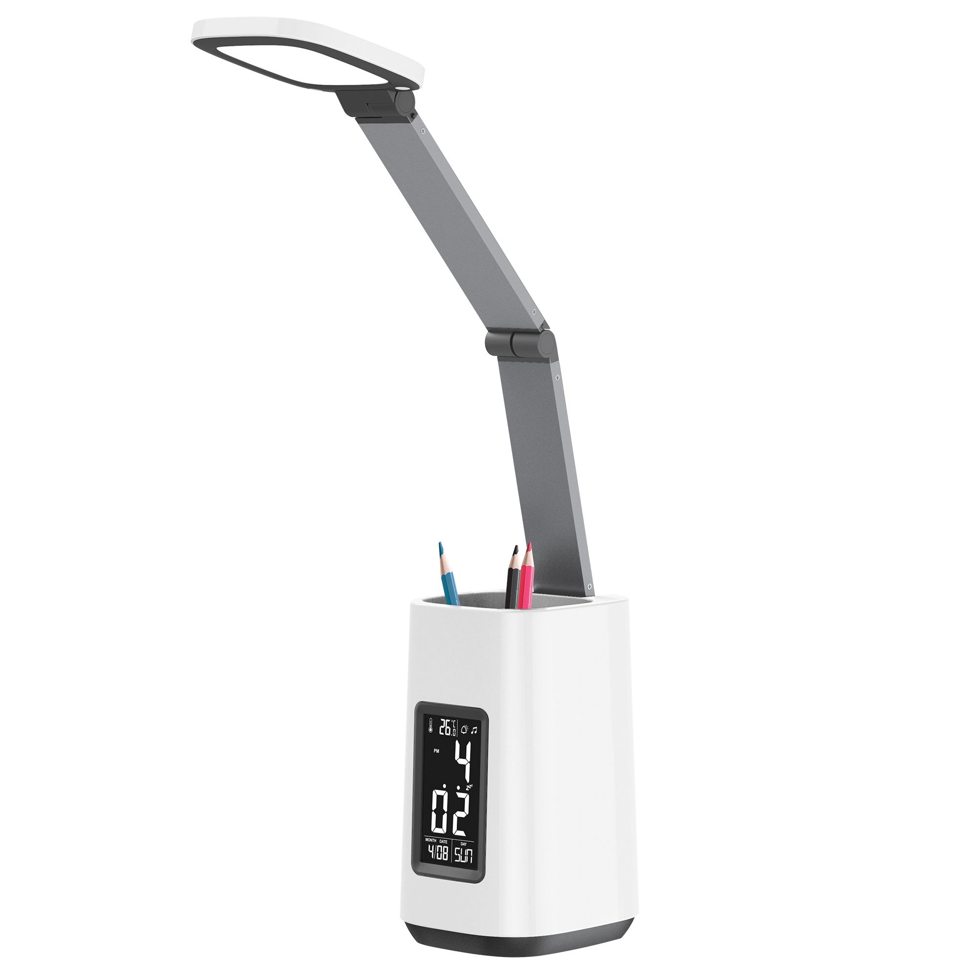 Blending function and aesthetic design, the FINN multifunction LED Desk Lamp by Sheffield Home combines all the necessary components for a pleasing lighting experience along with the convenience of storage and a practical easy-to-read LCD display. Subtle detailing, high-impact ABS and anodized aluminum construction are housed in a clean two-tone grey and white color scheme adding appealing symmetry, while the high-output, 200 lumen LED panel provides glare-free illumination through an oversized frosted diffuser and is equipped with a three-grade touch dimmer on the lamp head. The vertical high-contrast LCD panel showcases a day-date calendar, clock, alarm, and ambient temperature features. The aluminum lamp arm folds neatly into a recessed dock situated behind the lamp allowing for instant portability in smaller spaces, while the integrated storage compartment hides smaller office necessities. Built to last, the FINN lamp is an ideal desktop companion and instant upgrade to any dorm, office, or home workspace.