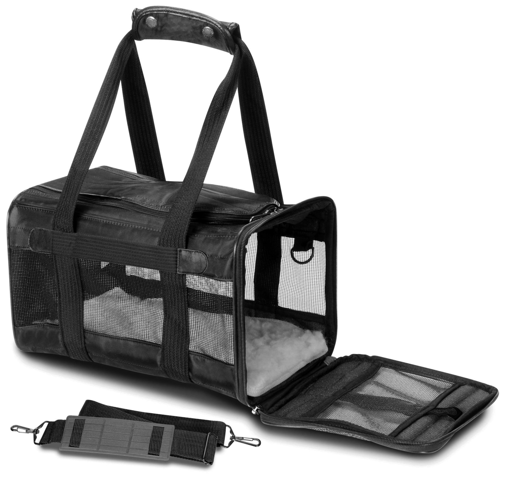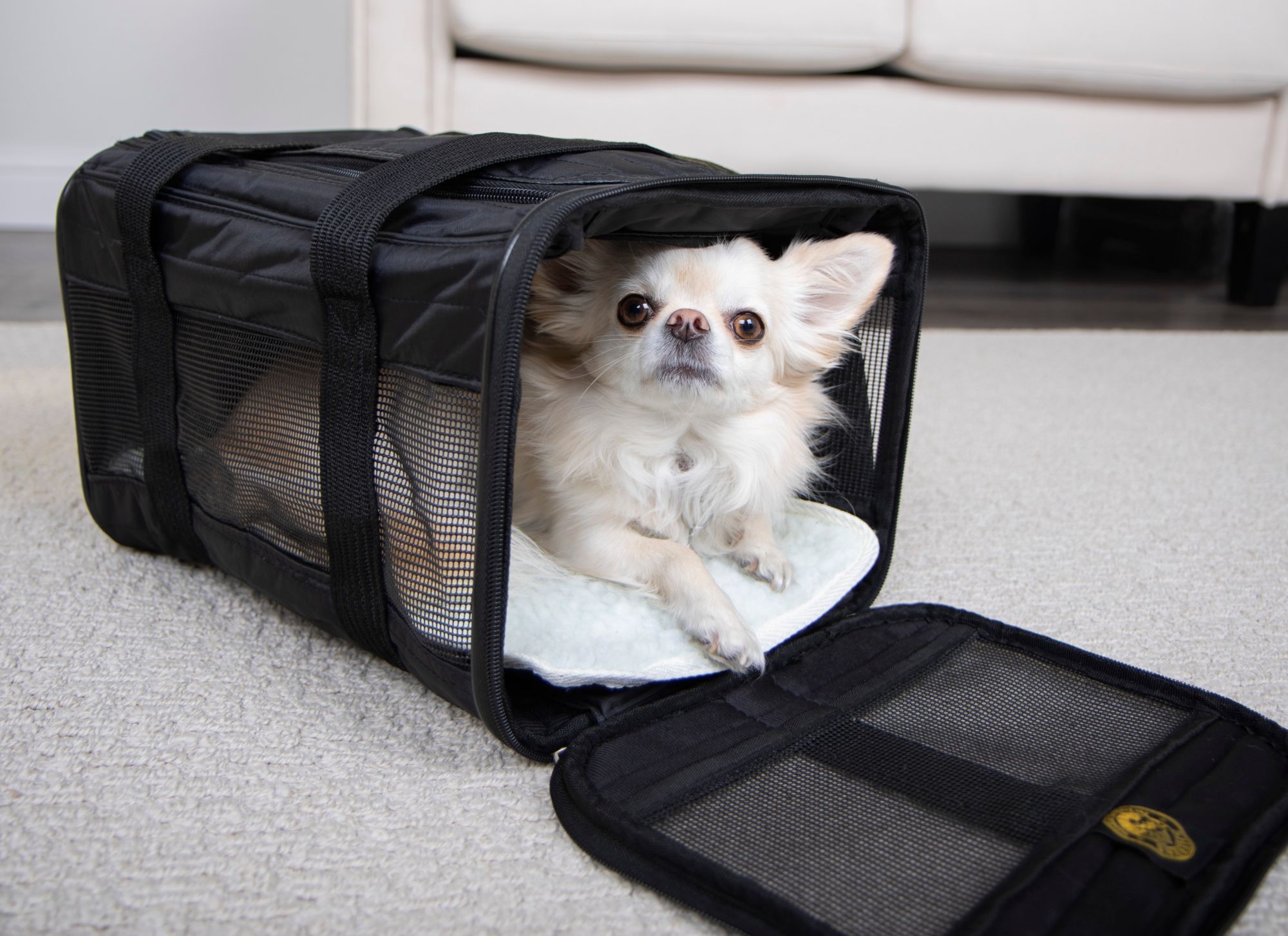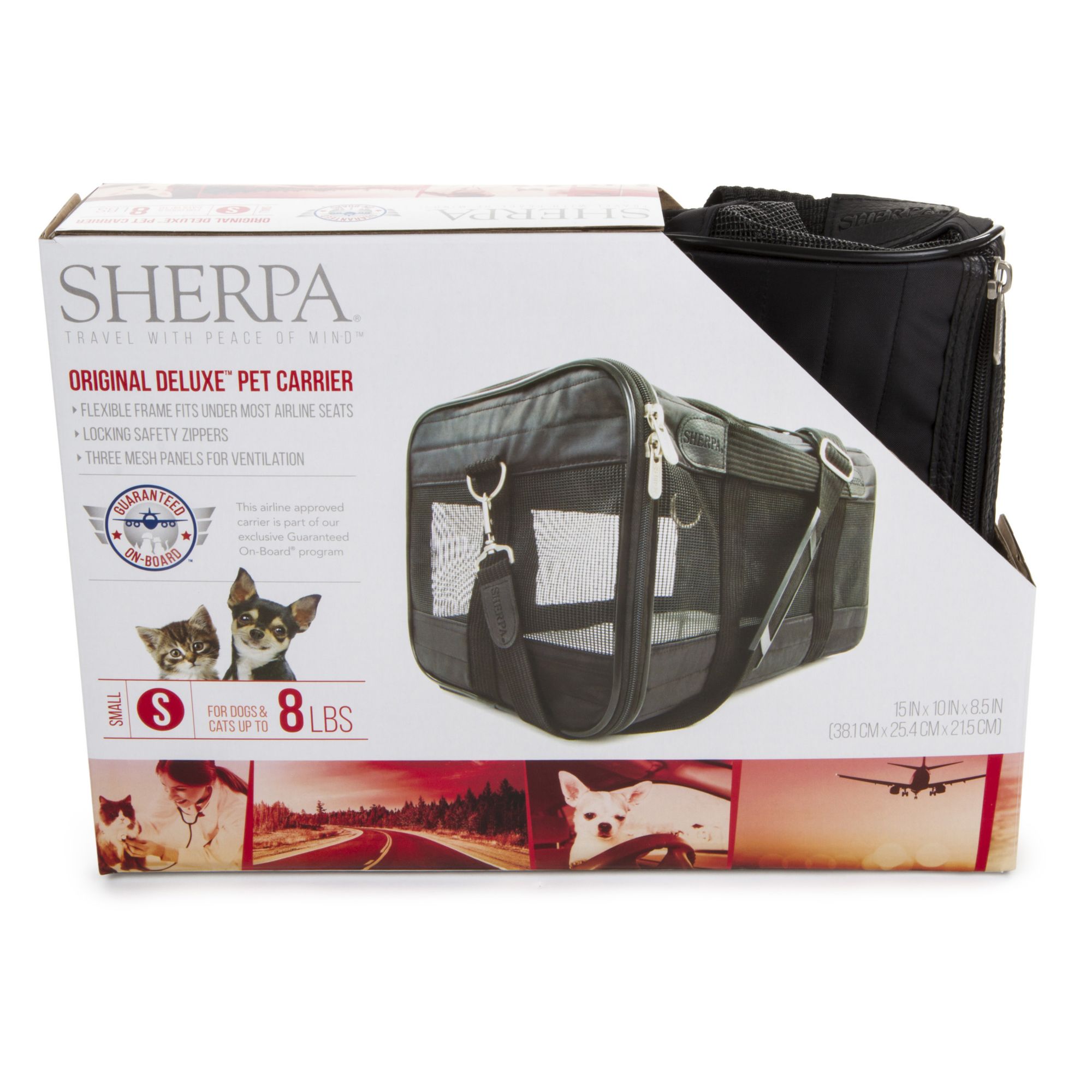 Travel in comfort and style with Sherpa Original Deluxe Small Carrier. Perfect for traveling by plane or car, for a trip or just to the vet. Patented spring wire frame allows the rear end of the carrier to be pushed down several inches to conform to underseat dimensions. Approved for use on most major airlines and small and medium sizes are included in Sherpa's Guaranteed On Board program.