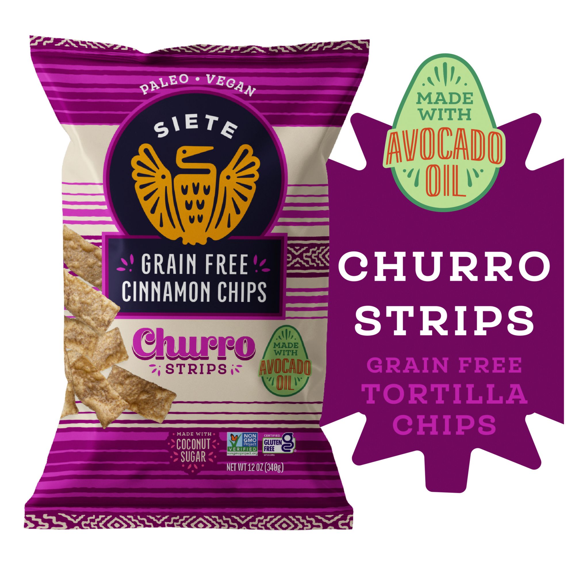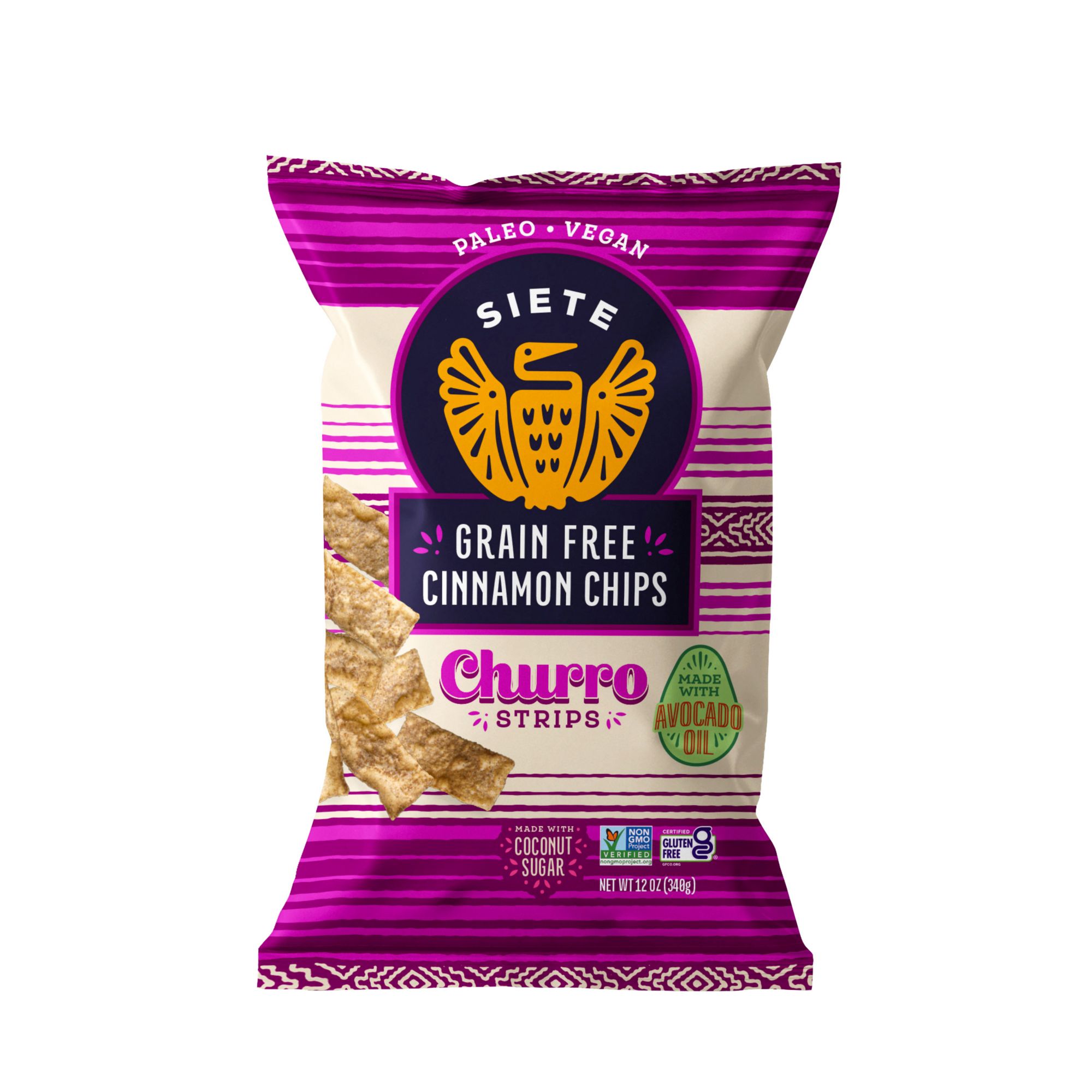 Churros, even the name melts in your mouth as we roll our tongues to say it. Inspired by trips to the plaza in Mexico on Saturday afternoons, walking from vendor to vendor under vibrant papel picado, with newspaper wrapped churros in hand, Siete made these Grain Free Churro Strips. Not only are they extremely delicious, but they are also made with simple ingredients like cassava flour, coconut sugar, cinnamon, and vanilla bean powder, so everyone can enjoy. All that is left for you to decide is whether or not to pair with cajeta, dip in hot chocolate, or savor straight from the bag. Grain Free, Gluten Free, Dairy Free, Soy Free, Vegan, Paleo, and Non GMO.
