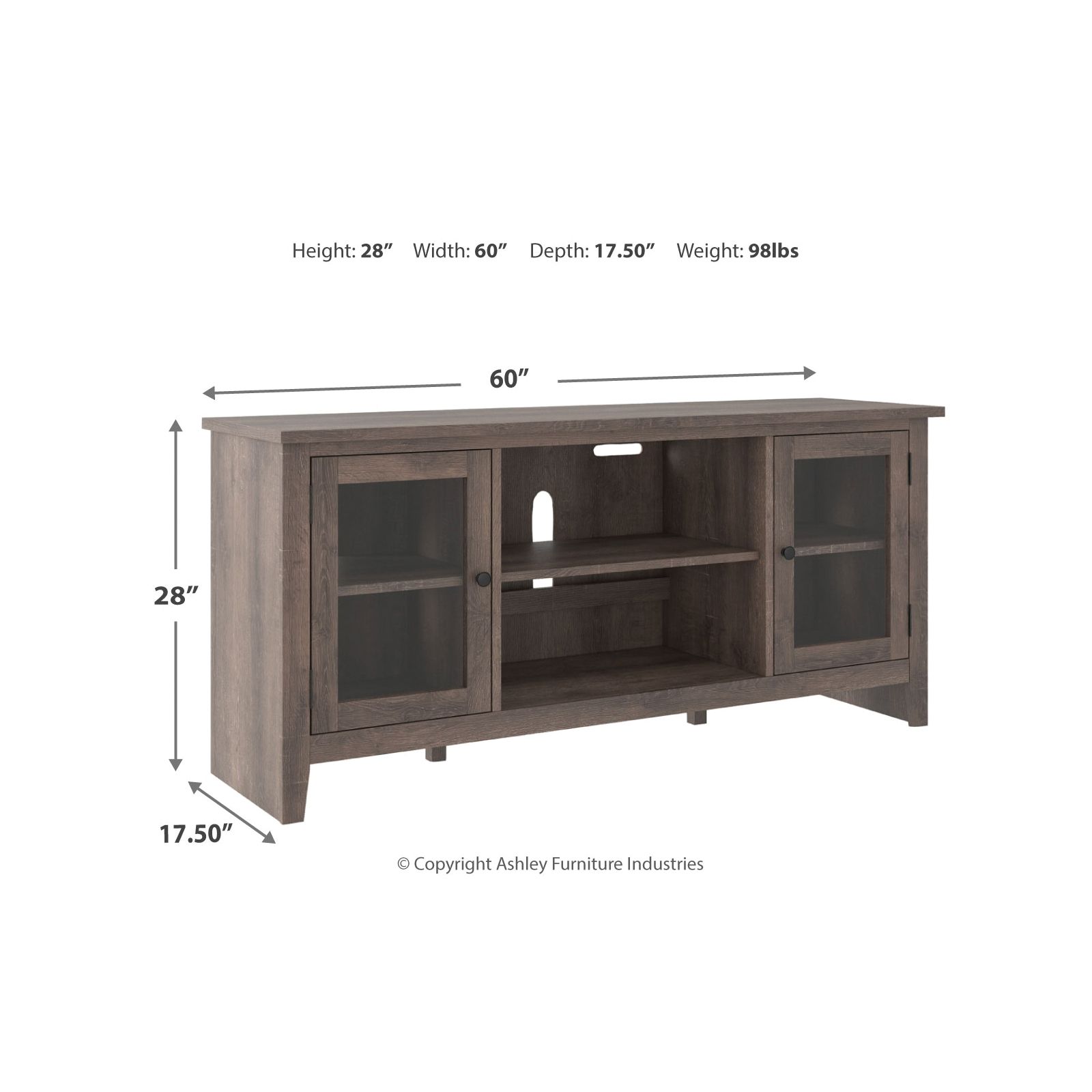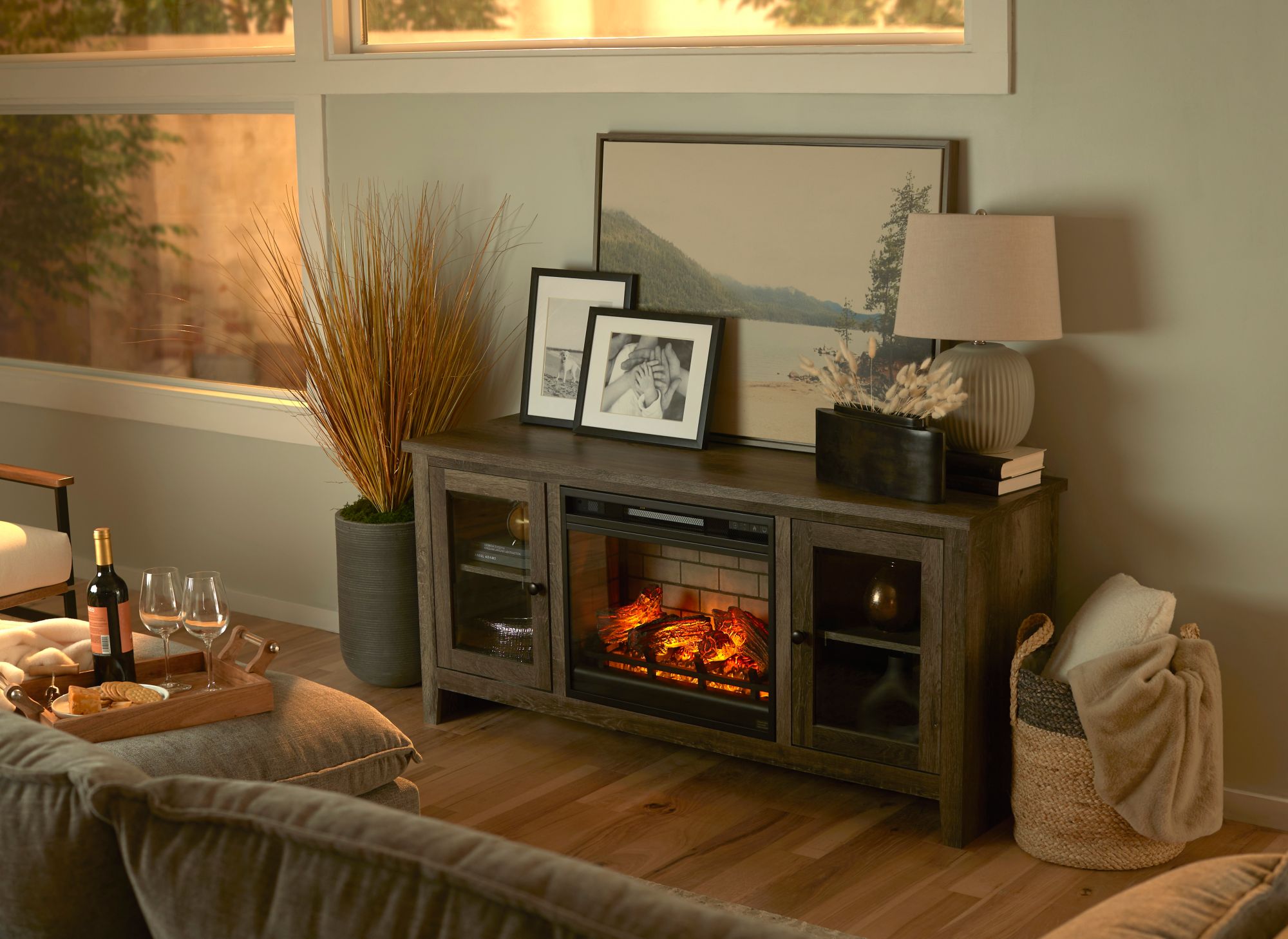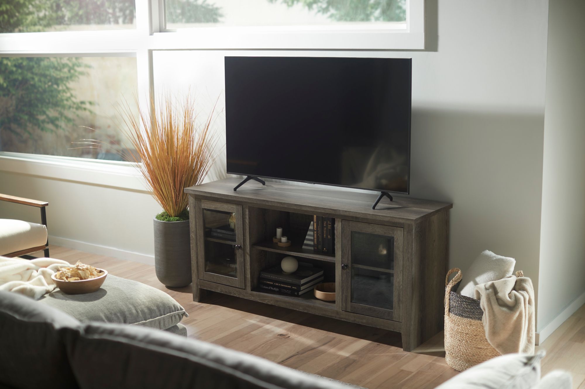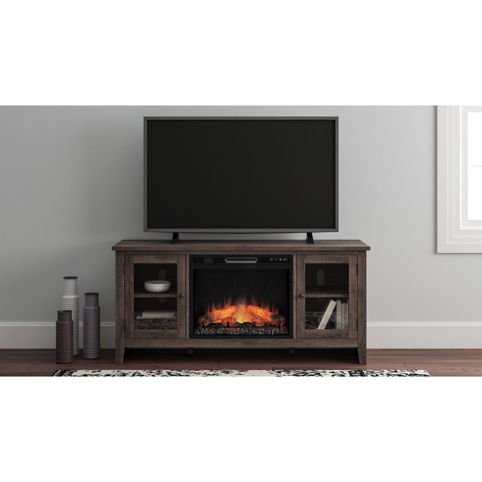 With its replicated weathered oak finish and minimalist charm, this TV stand with fireplace option is right in tune with your relaxed approach to high style. Beautifully made to accommodate your media equipment, it’s well equipped with adjustable shelving, cutouts for wire management and a pair of glass-front doors that enhance the clean-lined aesthetic. The look is ideal for modern farmhouse and contemporary settings.