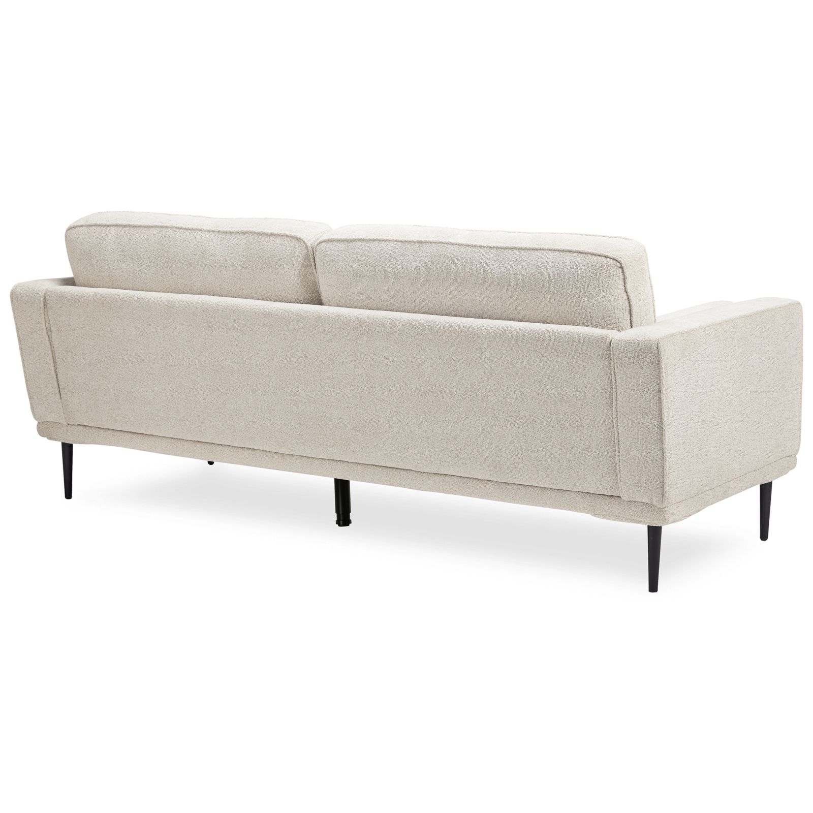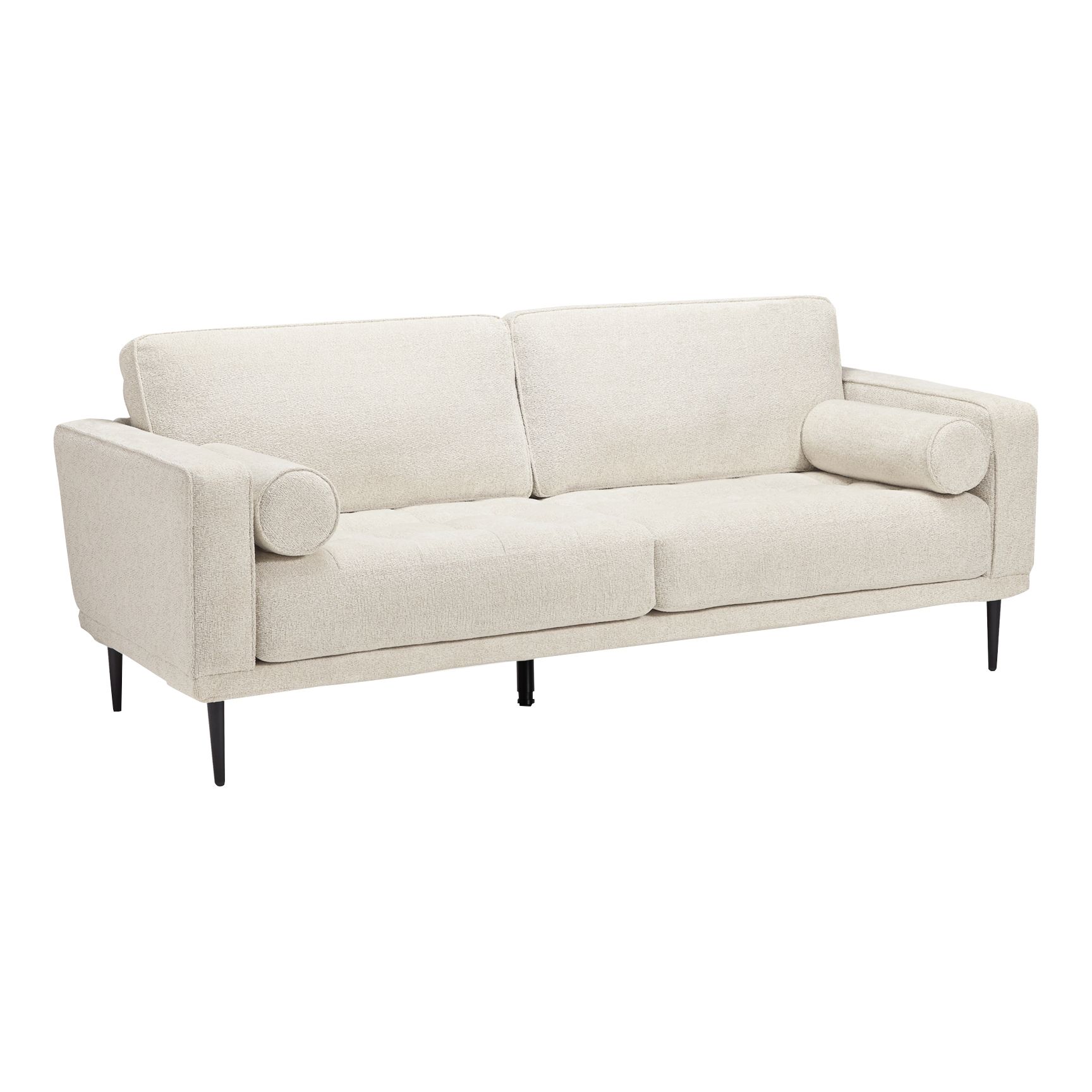 This designer sofa combines the clean lines of mid-century style with the cozy softness of your favorite blanket to create your favorite piece of furniture. The textured chenille upholstery evokes a feeling of comfort and security while the faint chevron pattern, bolster pillows, and exposed black metal legs add sophistication.