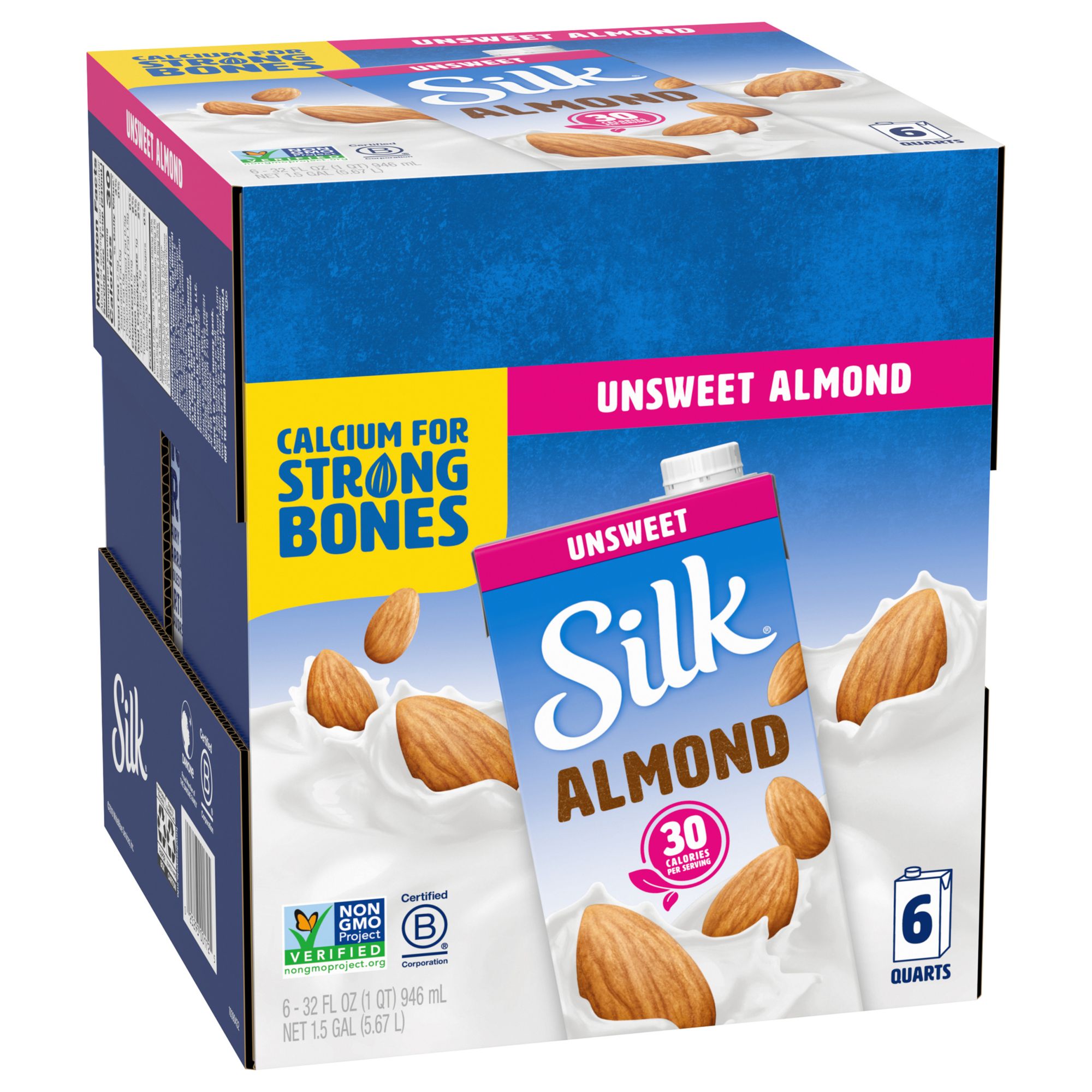 Bring the creamy goodness of almond milk to your pantry with Silk Shelf-Stable Unsweetened Almondmilk. Featuring a pure, silky smooth taste and just 30 calories per serving, this unsweetened almond milk is delicious whether it's poured over cereal, added to your favorite recipes, or enjoyed straight out of the glass. It makes a perfect non-dairy alternative to milk and is free of dairy, soy, lactose, gluten, casein, egg, and MSG. Silk Almondmilk provides vitamin E and contains 50% more calcium than dairy milk. And since it comes in special, shelf-stable packaging, this unsweetened nut milk will keep fresh at room temperature and unopened until the date code. No refrigeration is necessary. Silk Unsweetened Original Almondmilk has 450mg of calcium per cup compared to reduced-fat dairy milk which has 293mg of calcium per cup. USDA National Nutrient Database for Standard Reference. Data are consistent with typical reduced fat dairy milk.