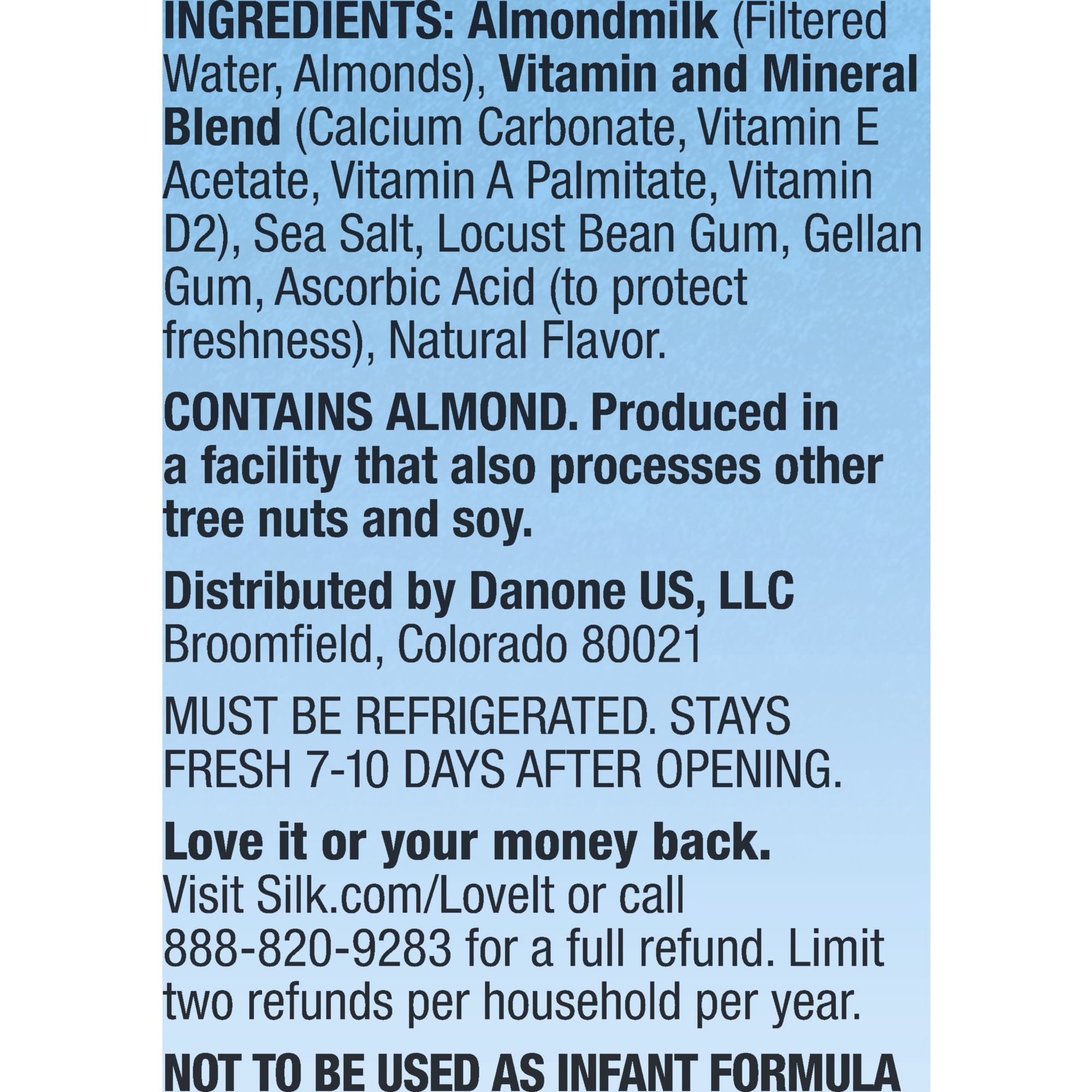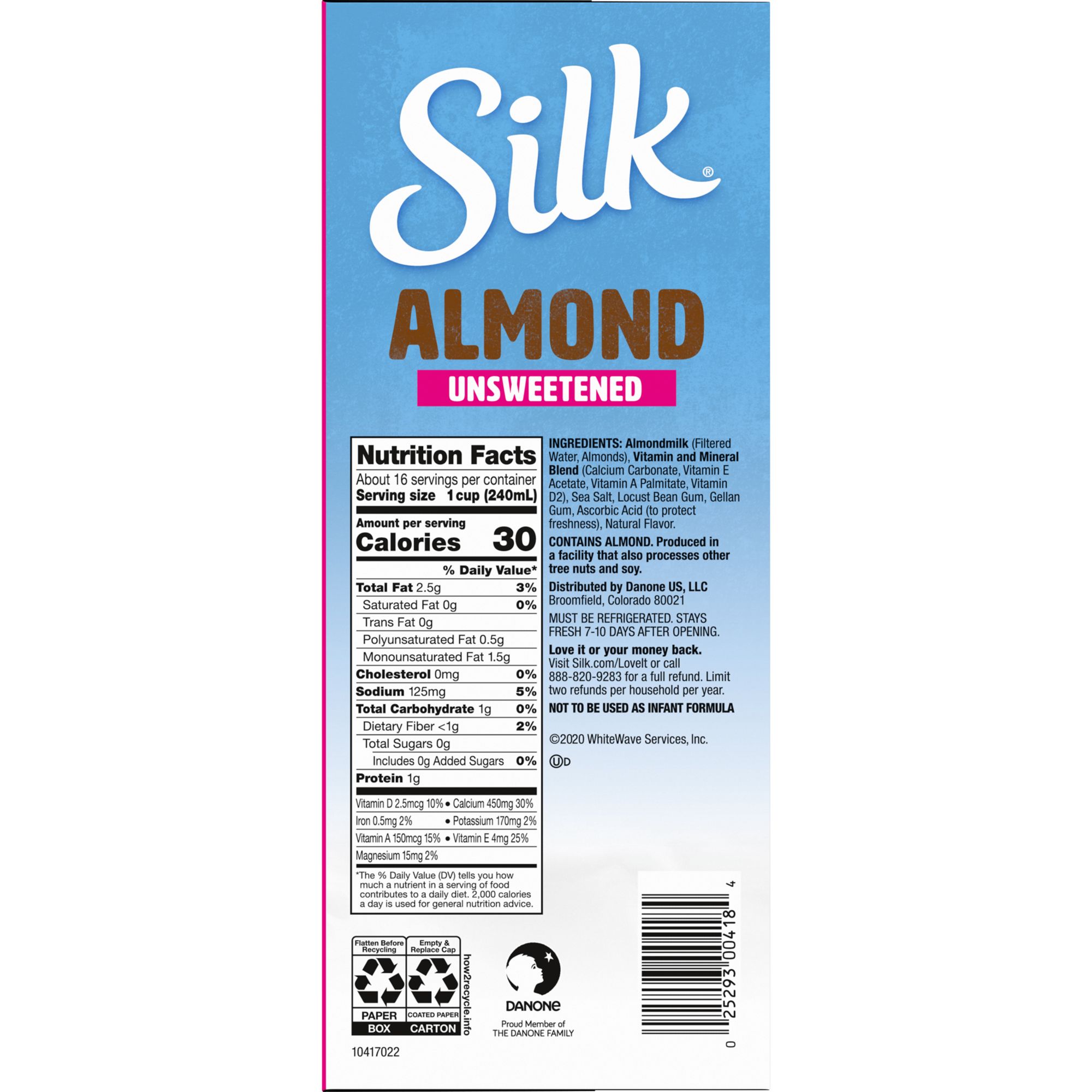 30 calories per serving No added sugar 50% more calcium than dairy milk Good source of Vitamin E No cholesterol or saturated fat No dairy, soy, lactose, gluten, casein, eggs or MSG Includes two pack of 64-oz. Silk Unsweetened Almond Milk