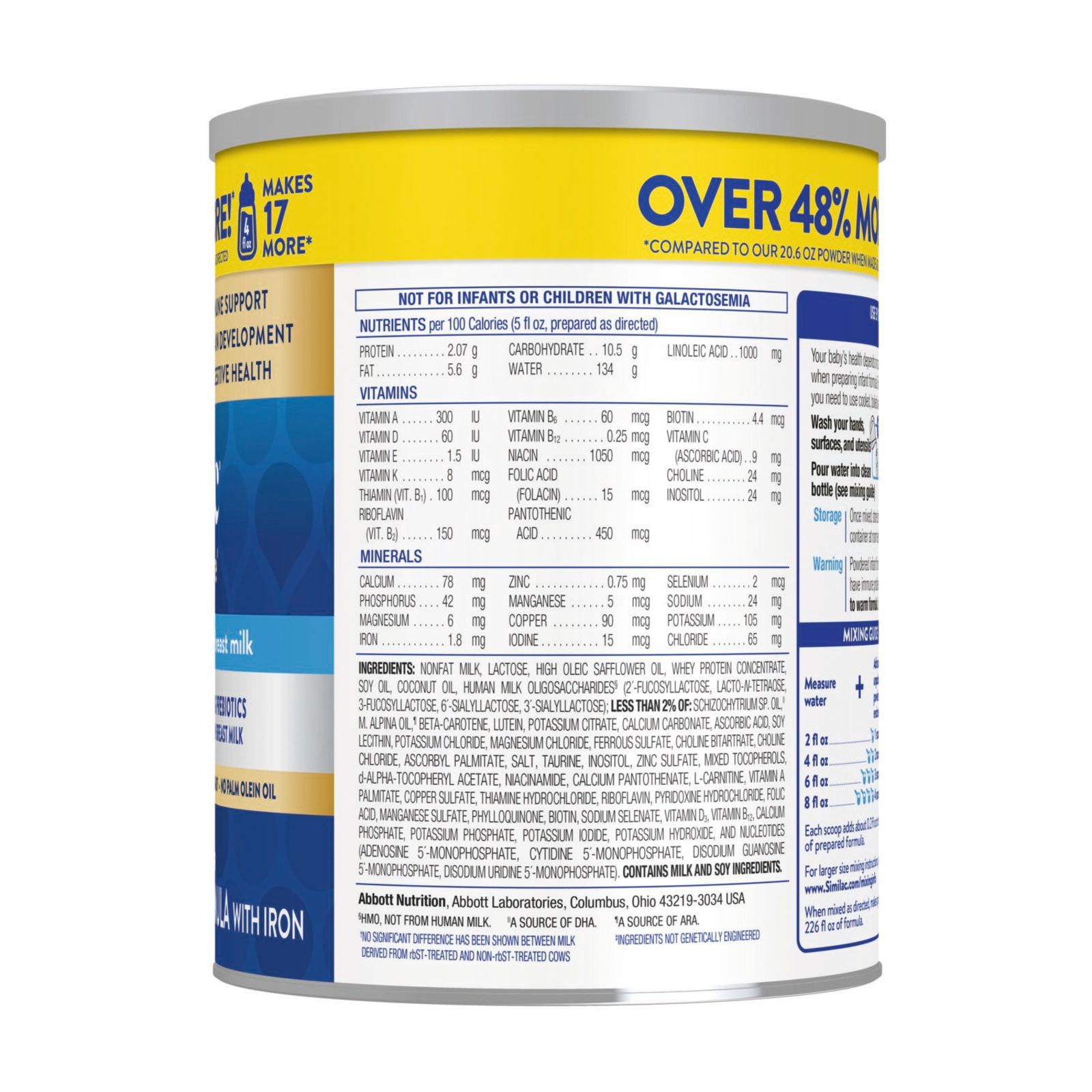 Similac 360 Total Care* infant formula is made with an exclusive blend of 5 HMO prebiotics structurally identical to those in breast milk. Total Care formula also has nutrition designed for immune support, brain development, and digestive health. Similac is the #1 brand fed in hospitals. Ingredients in Similac 360 Total Care have no artificial growth hormones† and are non-GMO.‡