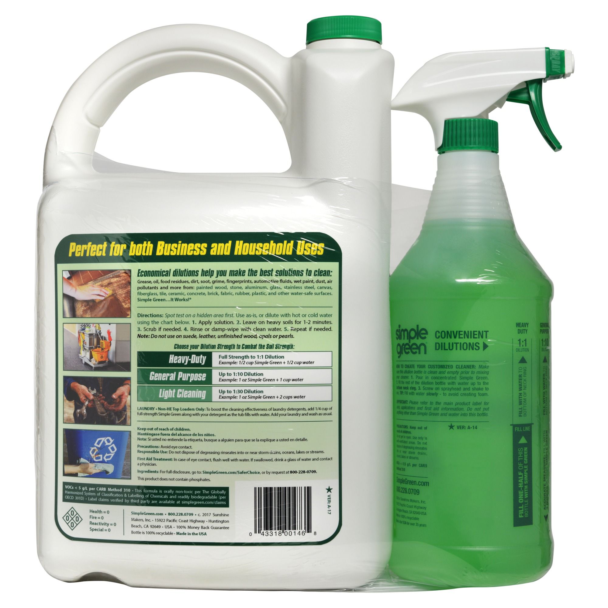 Bonus pack includes reusable spray bottle with Simple Green All-Purpose Cleaner pre-mixed for general cleaning All-purpose concentrated cleaner removes dirt, grease and stains Safer, orally non-toxic formula Readily biodegradable formula Cleans counters, carpet, floors, fabric, equipment and vehicles Can be used in manually or in equipment such as floor scrubbers, carpet cleaners, pressure washers and parts washers Use full strength on heavy messes or custom dilute for daily cleaning Deodorizes as it cleans with our original, refreshing sassafras scent Recognized by the U.S. EPA's Safer Choice Program as safer for people, pets, and the environment Non-abrasive, non-flammable and phosphate-free