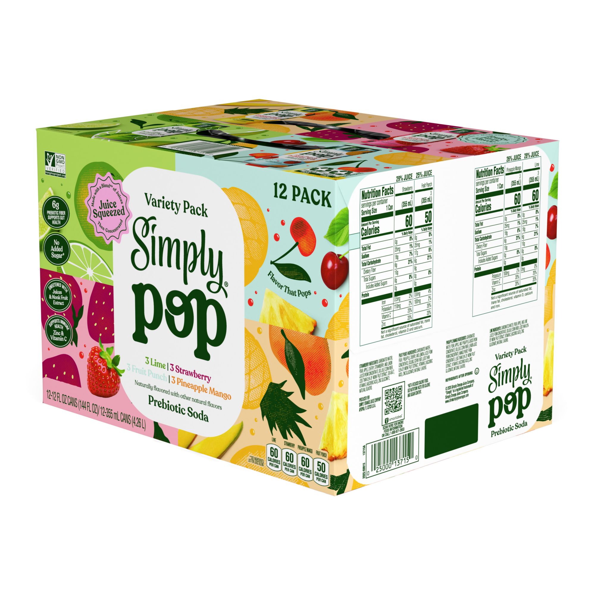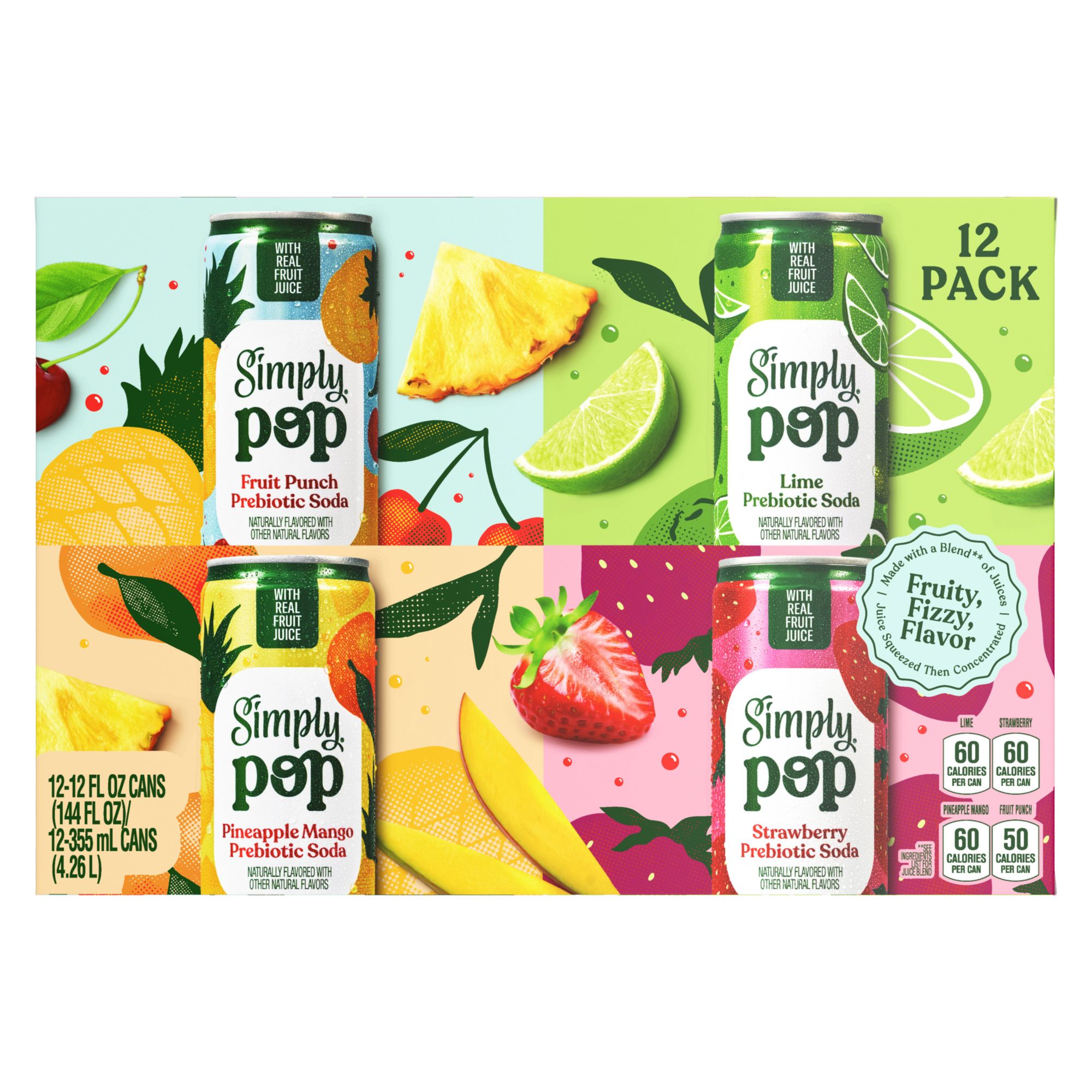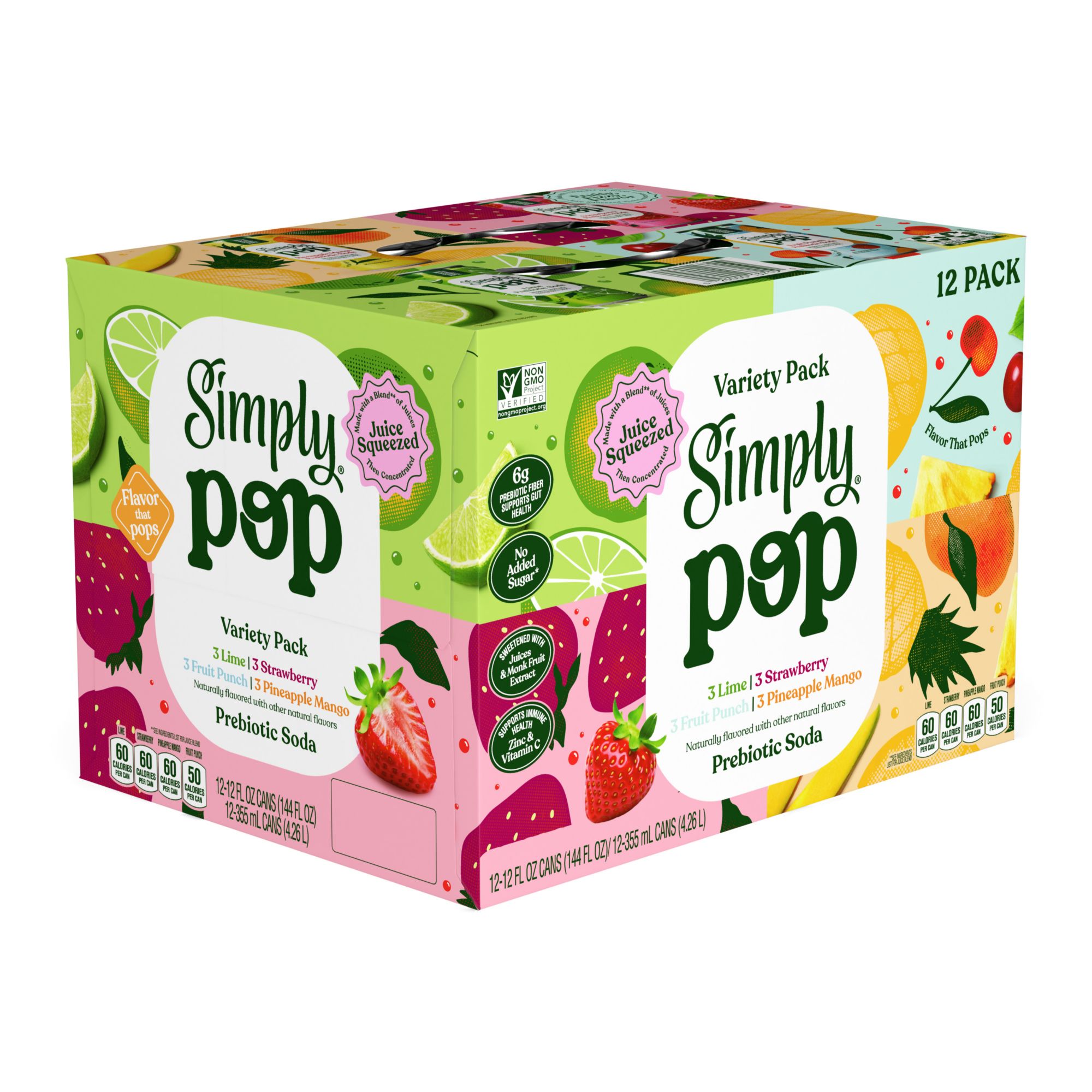 Simply Pop Prebiotic Soda Variety Pack, Strawberry, Fruit Punch, Pineapple Mango, Lime, 12 pk./12 oz.