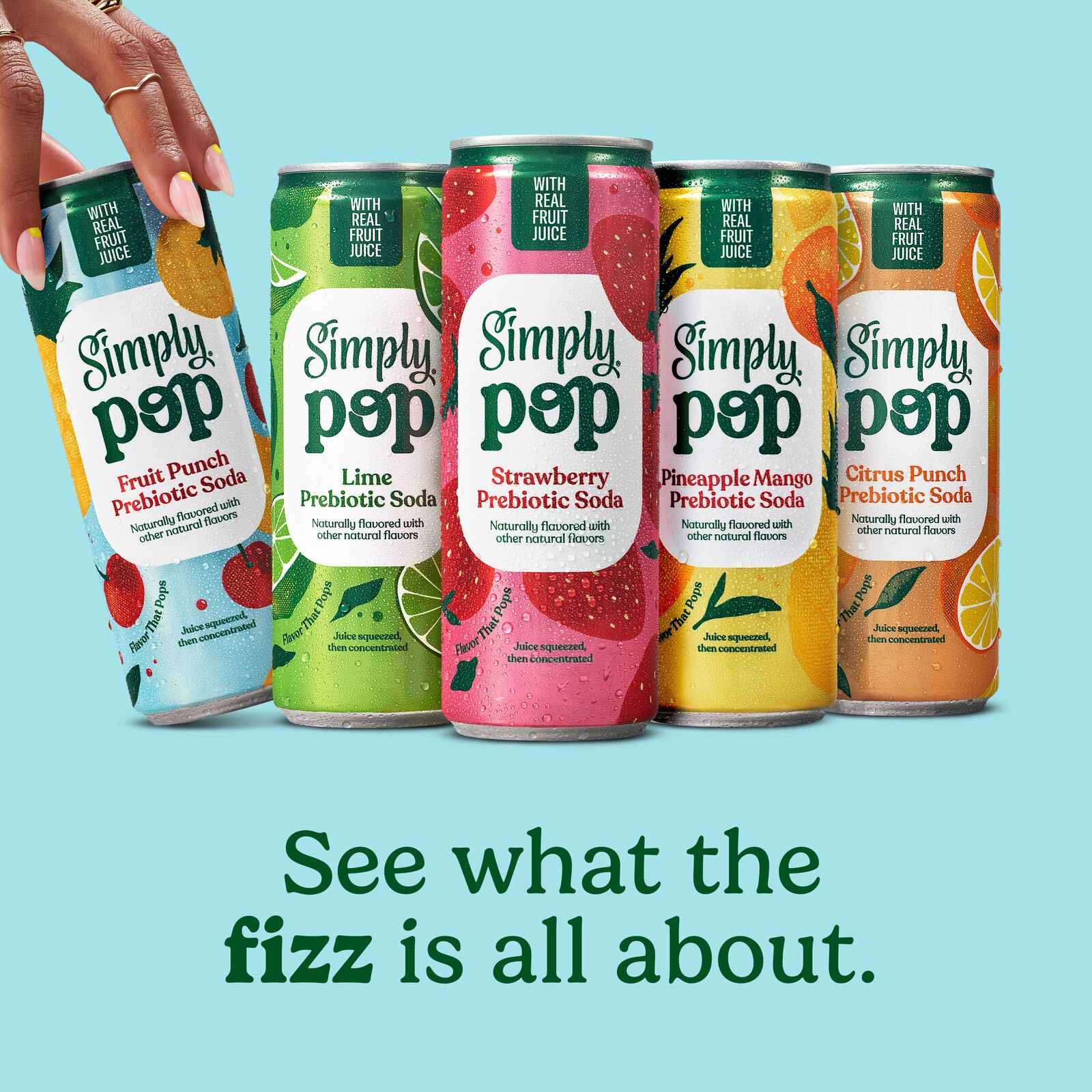 You’ve discovered it, the ultimate upgrade to your soda game. See what the fizz is all about with Simply Pop Prebiotic Soda. Made with real fruit juice from concentrate for a delicious bubbly beverage full of juicy flavor that really pops! This fruity, fizzy, flavorful, prebiotic drink contains prebiotic fiber to support gut health, zinc and vitamin C to support immune health, no added sugar, additional ingredients and 50-60 calories per can. It's also non-GMO and sweetened with real fruit juice and monk fruit extract. All this and packed with flavor too –– you're gonna love 'em! With a variety of flavors available, there's a Simply prebiotic drink for everyone.