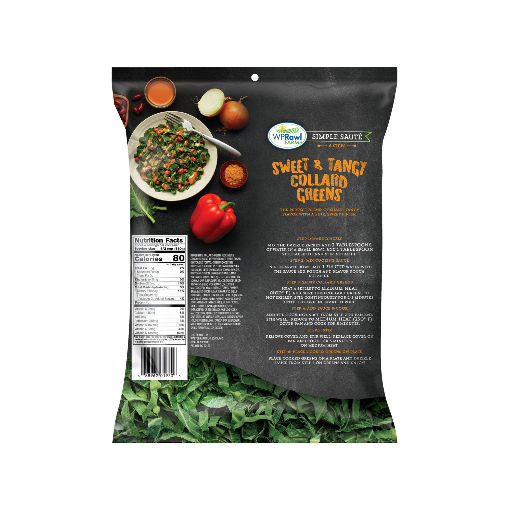 Simply Saute Sweet & Tangy Collard Greens include shredded collard greens, universal stock pouch, sweet and tangy flavor and vegetables pouch and sweet and tangy drizzle. Chef-inspired collard greens saute kits are quick and easy, packed with all the nutrients and flavor your need to make the most of you mealtime. This kit can be made into a restaurant quality entree or side dish in only 15 minutes.
