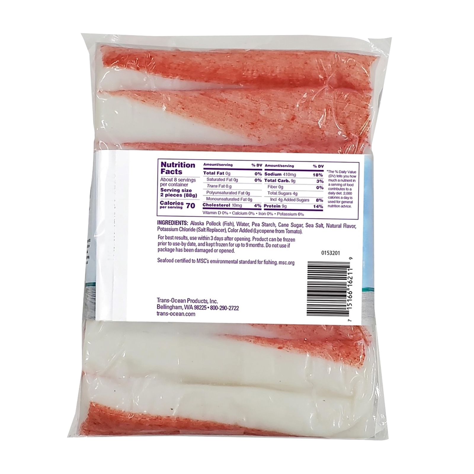 Trans-Ocean Simply Surimi Stick Style is a high-quality, fully cooked seafood product crafted from sustainable, wild-caught Alaska Pollock. These sticks are made with just eight natural ingredients and are free from GMOs, added phosphates, and artificial colors or flavors. Designed for convenience, the "stick style" variety features a tender texture and a subtly sweet, mild flavor that mimics real crab. This versatile option is ideal for snacking "cocktail style" with a dipping sauce or as a primary ingredient in California sushi rolls, salads, and chowders. Nutritionally, it is a heart-healthy choice that is fat-free, gluten-free, and a good source of protein. To ensure the best quality, the product should be kept refrigerated and used within three days of opening.