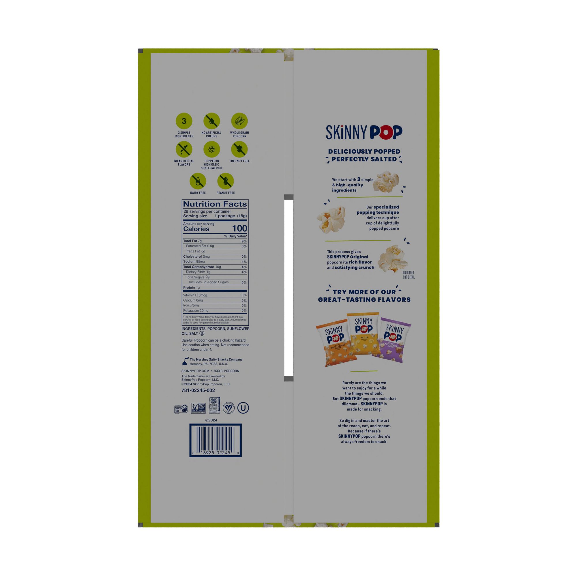 SkinnyPop Original flavor popped popcorn is a gluten-free, dairy-free, non-GMO snack with no artificial ingredients. SkinnyPop Original Popcorn family sharing size bag has zero trans fat, and is a good source of whole grain and fiber. This product is peanut-free, tree nut-free, preservative-free and a good source of whole grain and fiber.