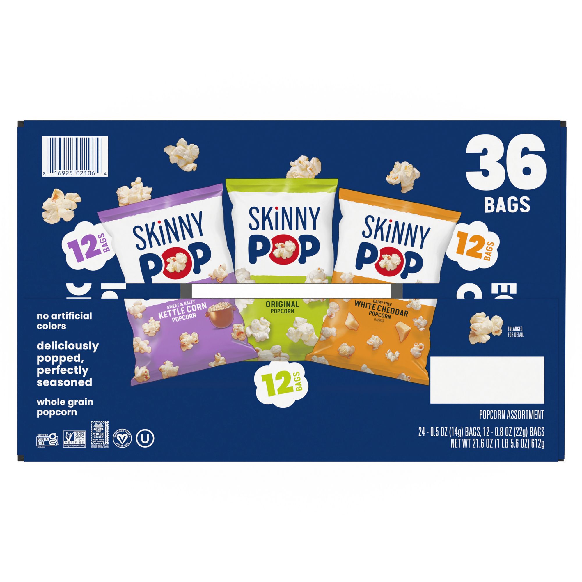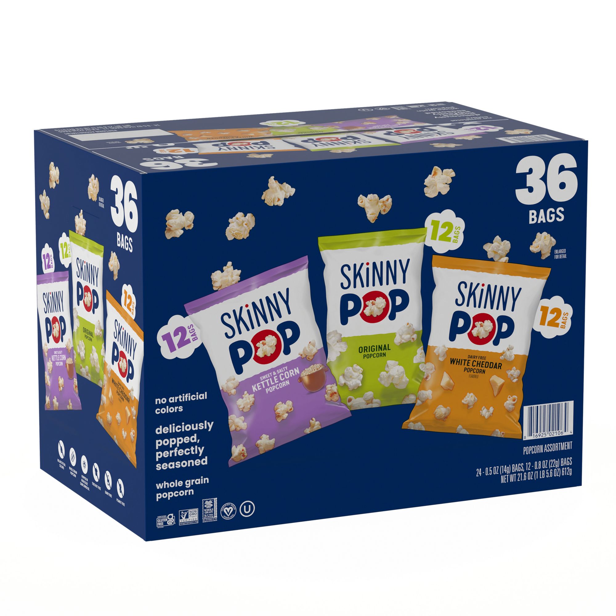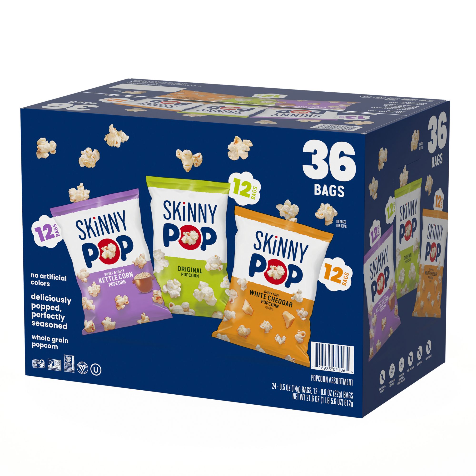This SkinnyPop variety pack contains 12 bags of SkinnyPop Original 0.5 oz., 12 bags of SkinnyPop Cheddar 0.5 oz., and 12 bags of SkinnyPop Kettle Corn 0.8 oz. Like all SkinnyPop products, these bags of popcorn are non-go, gluten free, have zero trans fat, and contain no artificial preservatives or flavors. Also, SkinnyPop is dairy-free, peanut-free, and tree nut-free, making the each bag school friendly and perfect for children's lunches.