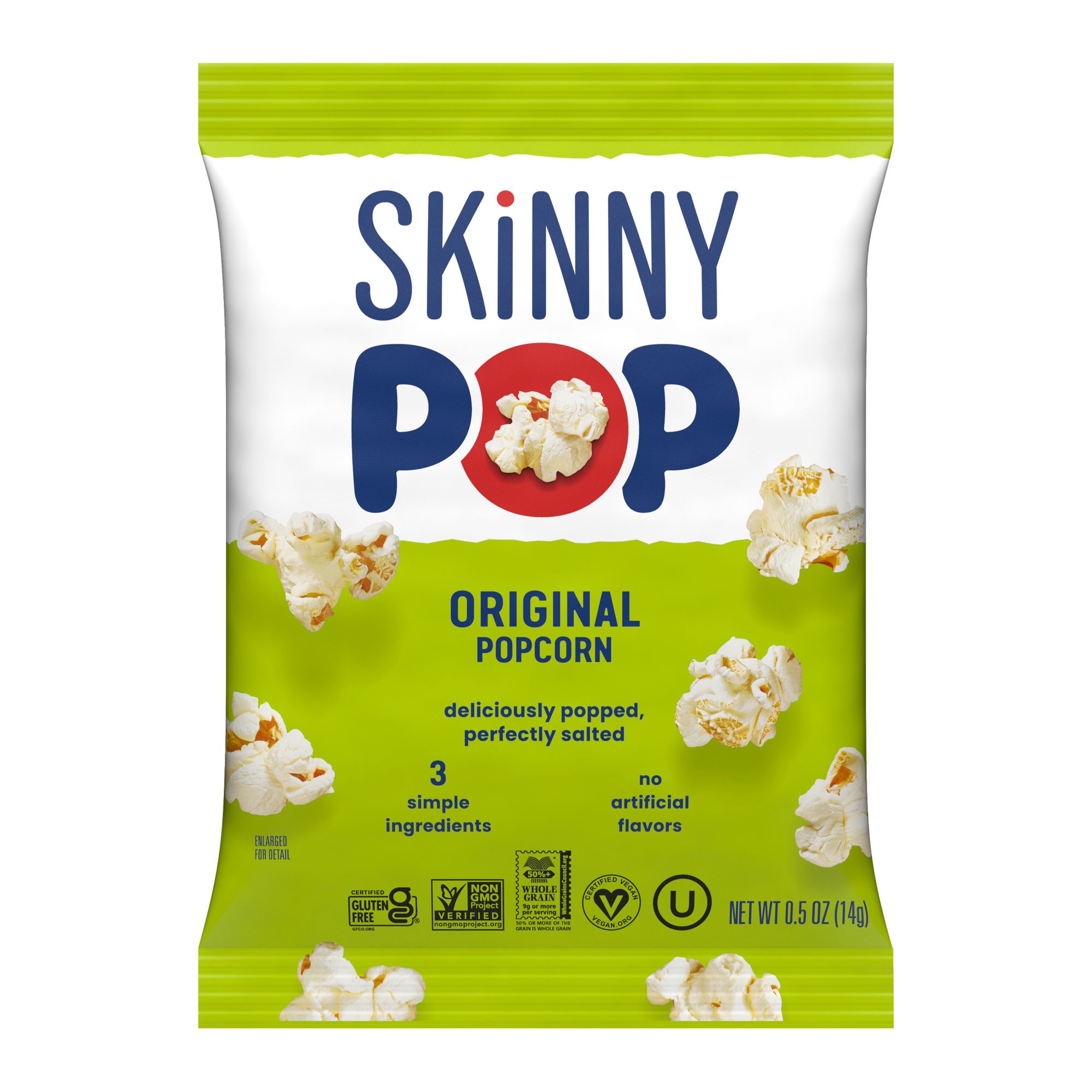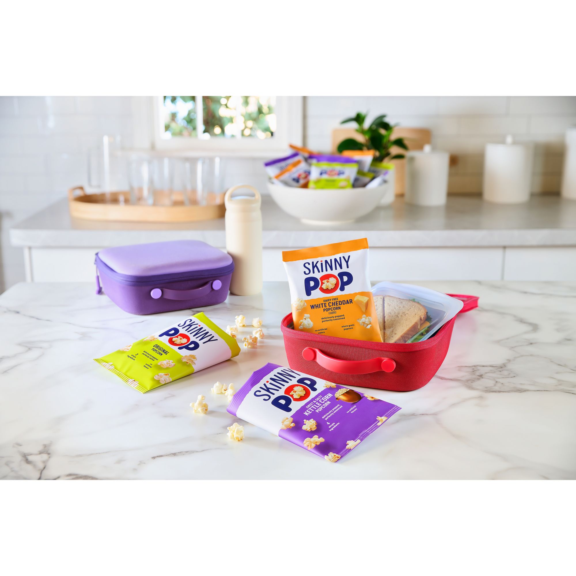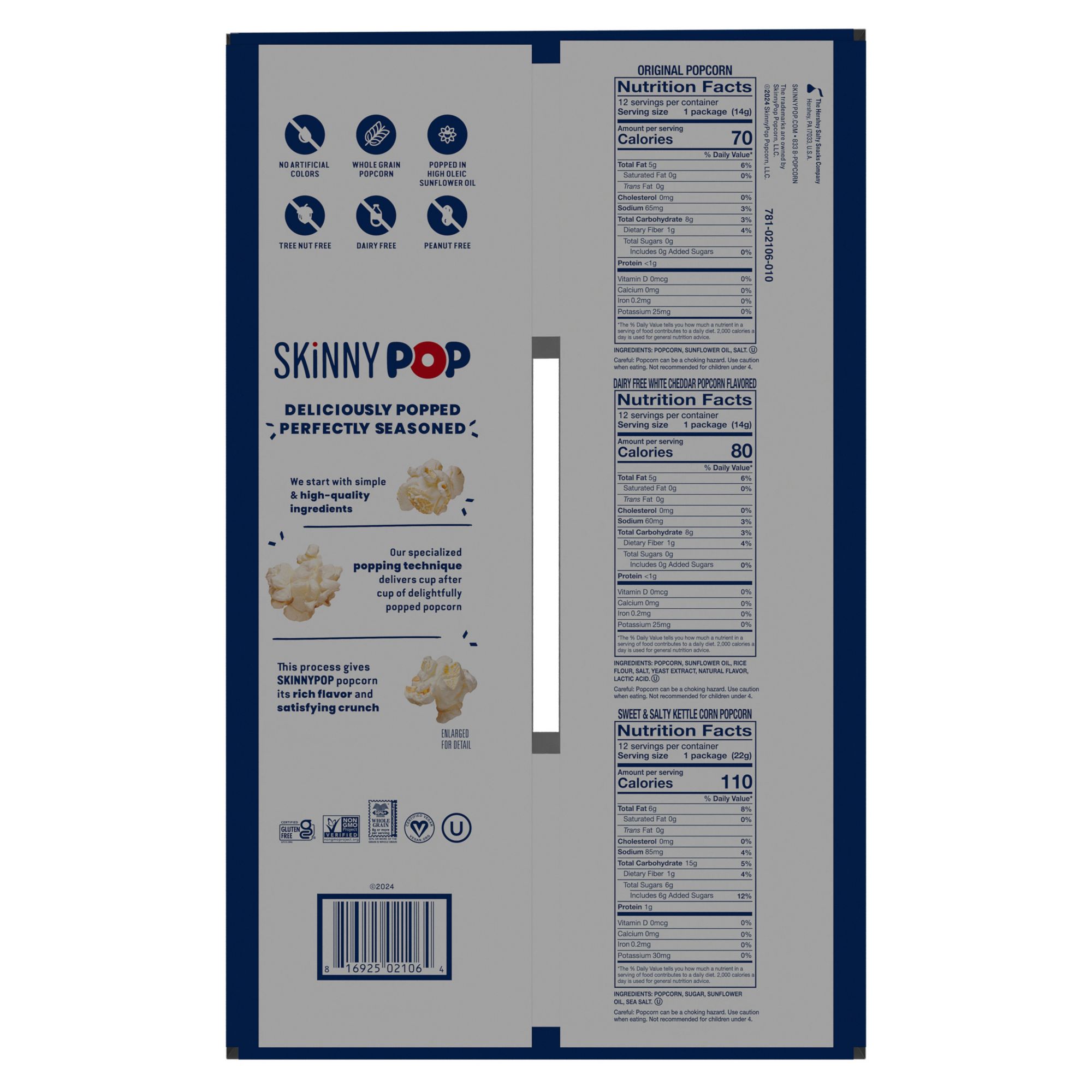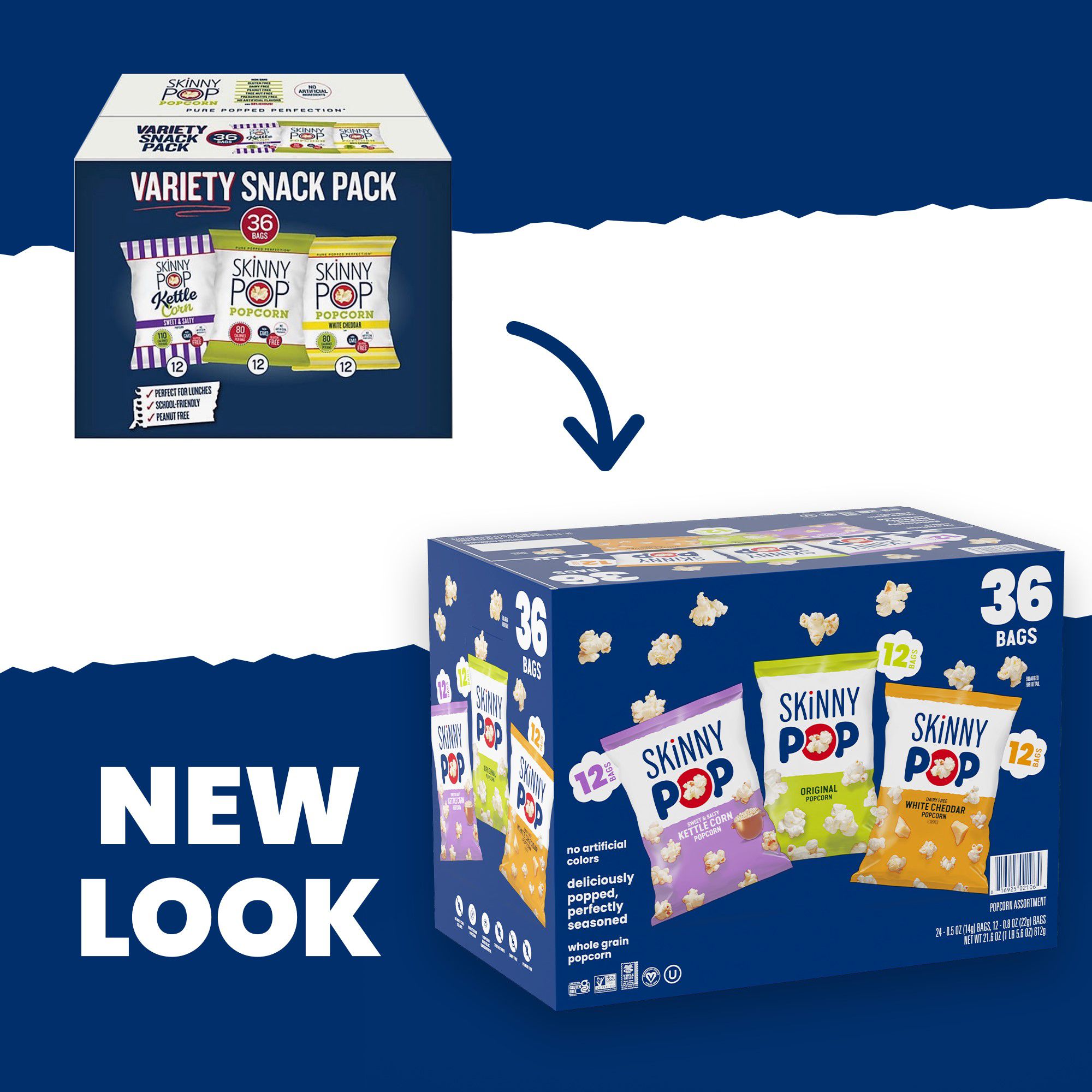 This SkinnyPop variety pack contains 12 bags of SkinnyPop Original 0.5 oz., 12 bags of SkinnyPop Cheddar 0.5 oz., and 12 bags of SkinnyPop Kettle Corn 0.8 oz. Like all SkinnyPop products, these bags of popcorn are non-go, gluten free, have zero trans fat, and contain no artificial preservatives or flavors. Also, SkinnyPop is dairy-free, peanut-free, and tree nut-free, making the each bag school friendly and perfect for children's lunches.