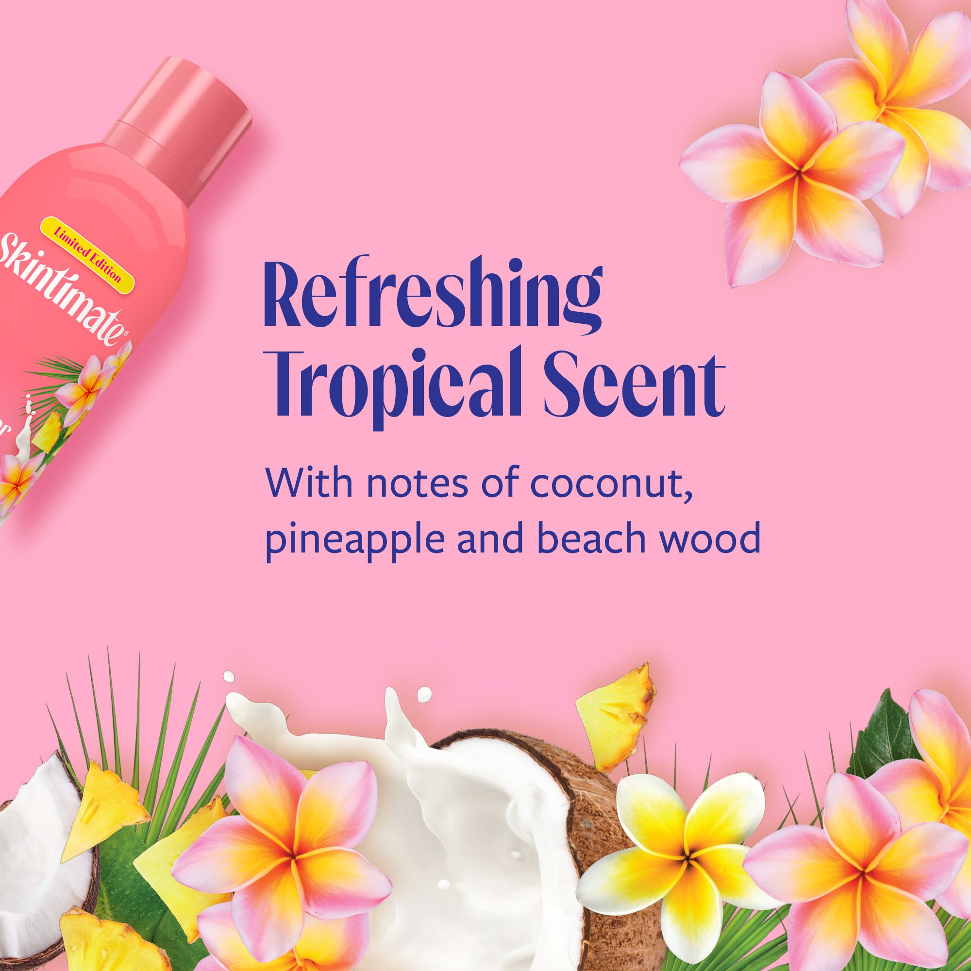 Indulge your senses with Limited Edition Skintimate Summer Splash Women's Shave Gel. The moisturizing shaving gel delivers a refreshing tropical scent with notes of coconut, pineapple and beach wood for a sense-drenching shave experience. The luxurious formula transforms into a rich creamy lather, ensuring your razor glides effortlessly and offering ultimate protection against nicks and irritation. Infused with hydrating moisturizers, including vitamin E and coconut water, this women’s shaving cream helps to replenish your skin's natural moisture, leaving it healthy-looking and smooth. The Skintimate shaving gel for women is dermatologist-tested and boasts a vegan formula, free from parabens, silicone, and sulfites, ensuring your skin receives the gentle care it deserves. For best results, pair with Skintimate Disposable Razors.