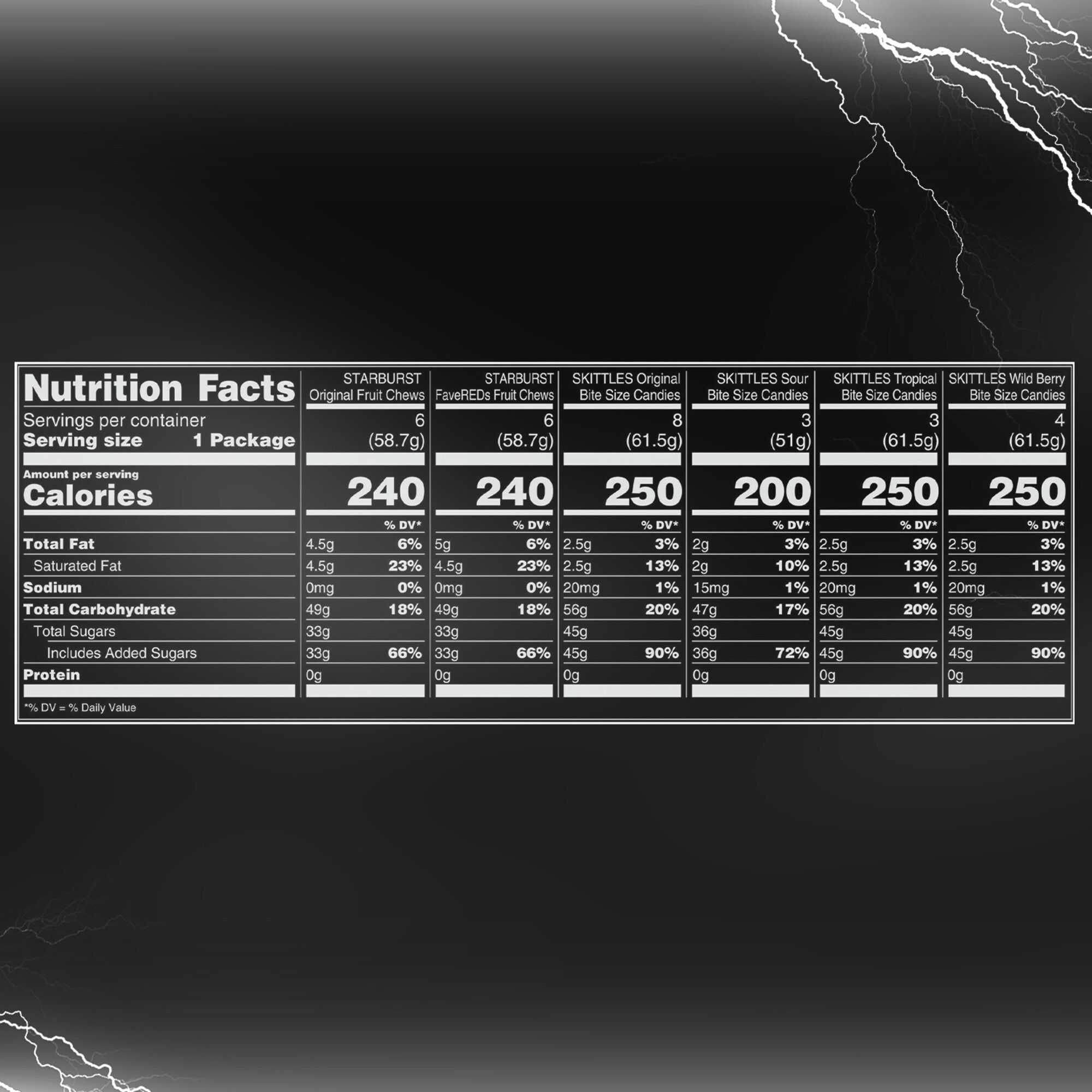 Ingredients: Starburst Original Fruit Chews: Sugar, Corn Syrup, Hydrogenated Palm Kernel Oil; Less than 2% of Citric Acid, Tapioca Dextrin, Gelatin, Apple Juice from Concentrate, Modified Corn Starch, Natural and Artificial Flavors, Colors (Red 40, Yellow 5, Yellow 6, Blue 1). Starburst Favereds Fruit Chews: Sugar, Corn Syrup, Hydrogenated Palm Kernel Oil; Less than 2% of Citric Acid, Tapioca Dextrin, Gelatin, Apple Juice from Concentrate, Modified Corn Starch, Natural and Artificial Flavors, Color (Red 30, Blue 1). Skittles Original Bite Size Candies: Sugar, Corn Syrup, Hydrogenated Palm Kernel Oil; Less than 2% of Citric Acid, Tapioca Dextrin, Modified Corn Starch, Natural and Artificial Flavors, Colors (Titanium Dioxide, Red 40 Lake, Yellow 6 Lake, Yellow 5 Lake, Blue 2 Lake, Blue 1 Lake, Yellow 5, Red 40, Yellow 6, Blue 1), Sodium Citrate, Carnauba Wax. Skittles Sour Bite Size Candies: Sugar, Corn Syrup, Citric Acid, Hydrogenated Palm Kernel Oil; Less than 2% of Tapioca Dextrin, Modified Corn Starch, Natural and Artificial Flavors, Colors (Titanium Dioxide, Yellow 5 Lake, Red 40, Yellow 6, Blue 1), Sodium Citrate, Carnauba Wax. Skittles Tropical: Sugar, Corn Syrup, Hydrogenated Palm Kernel Oil; Less than 2% of Citric Acid, Tapioca Dextrin, Modified Corn Starch, Natural and Artificial Flavors, Colors (Titanium Dioxide, Yellow 5 Lake, Yellow 6 Lake, Blue 1 Lake, Red 40 Lake, Yellow 5, Yellow 6, Blue 1, Red 40), Sodium Citrate, Carnauba Wax. Skittles Wild Berry Bite Size Candies: Sugar, Corn Syrup, Hydrogenated Palm Kernel Oil; Less than 2% of Citric Acid, Tapioca Dextrin, Modified Corn Starch, Natural and Artificial Flavors, Colors (Titanium Dioxide, Red 40 Lake, Blue 2 Lake, Yellow 5 Lake, Blue 1 Lake, Red 40, Yellow 5, Blue 1, Yellow 6), Sodium Citrate, Carnauba Wax.