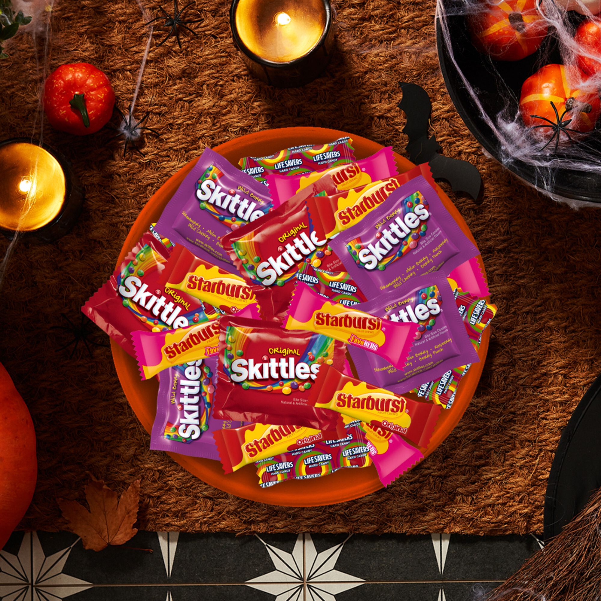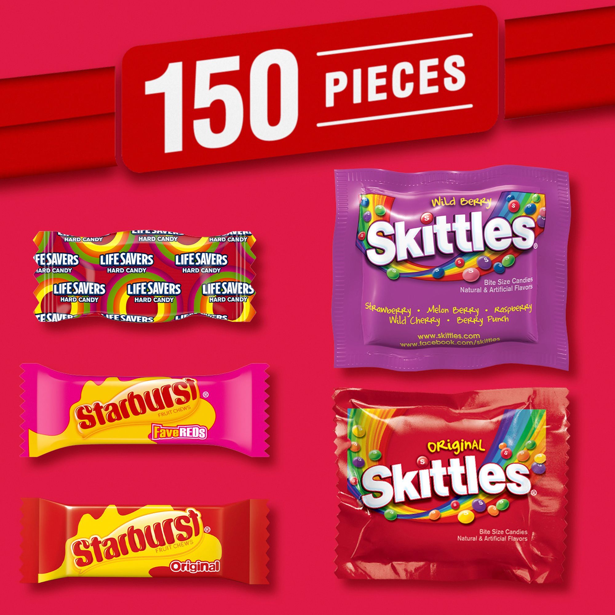 Get your taste buds grooving with this fruity assortment of Skittles Original, Skittles Wild Berry, Starburst Original, Starburst FavRed, and Life Savers Hard Candy