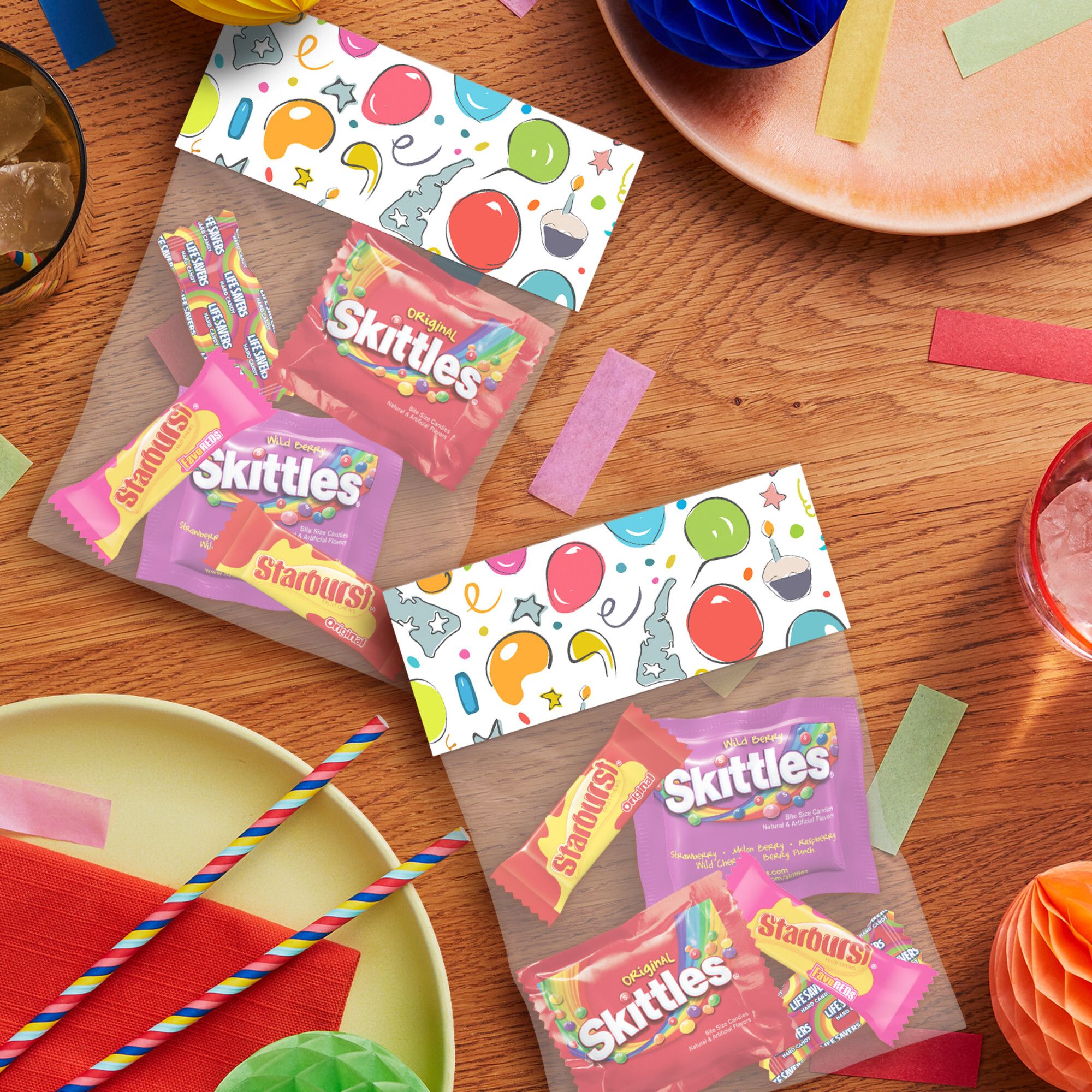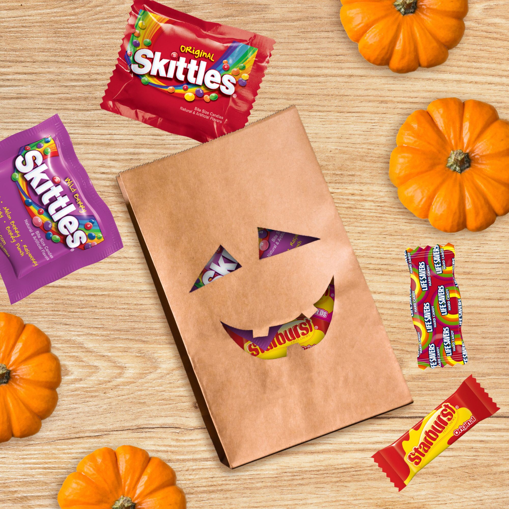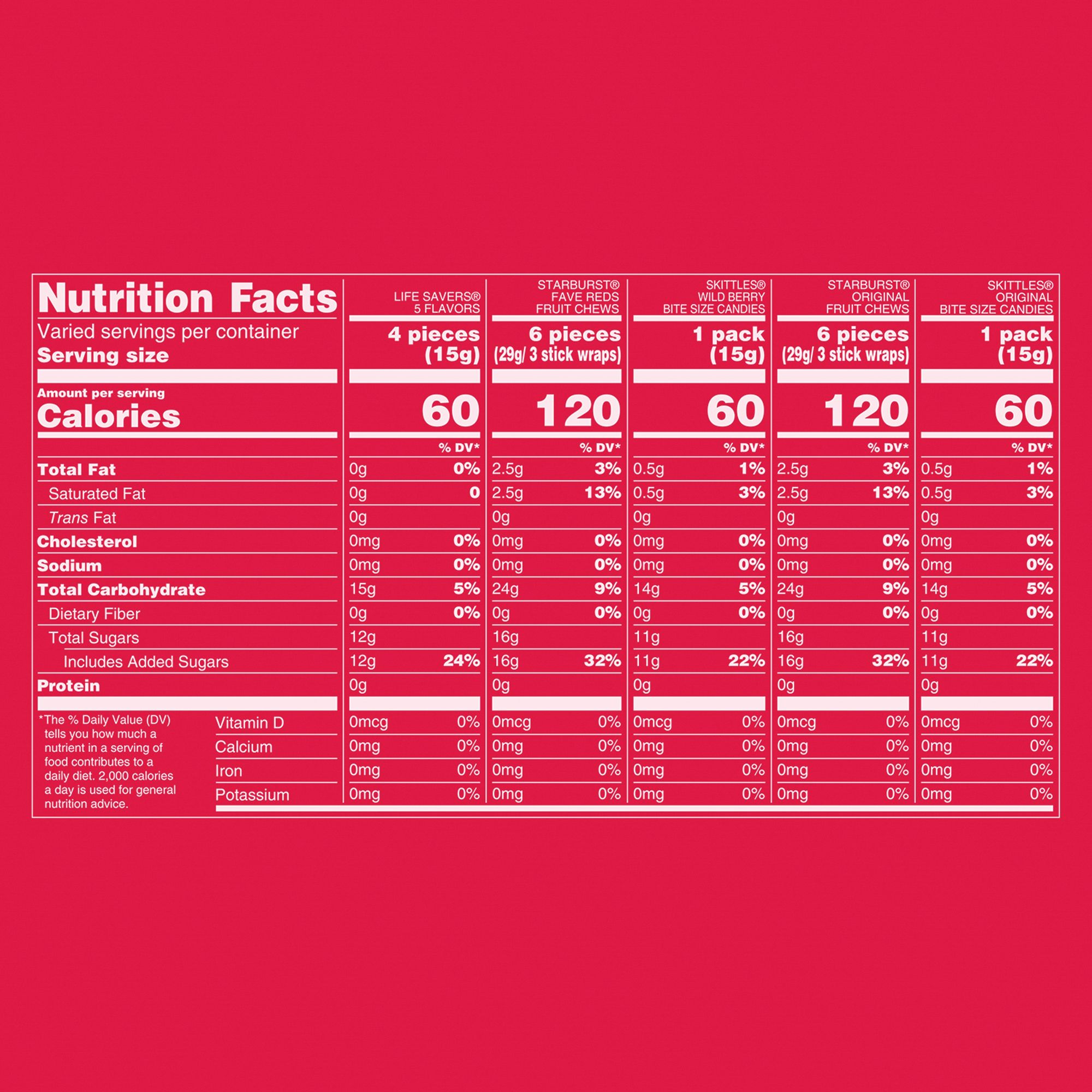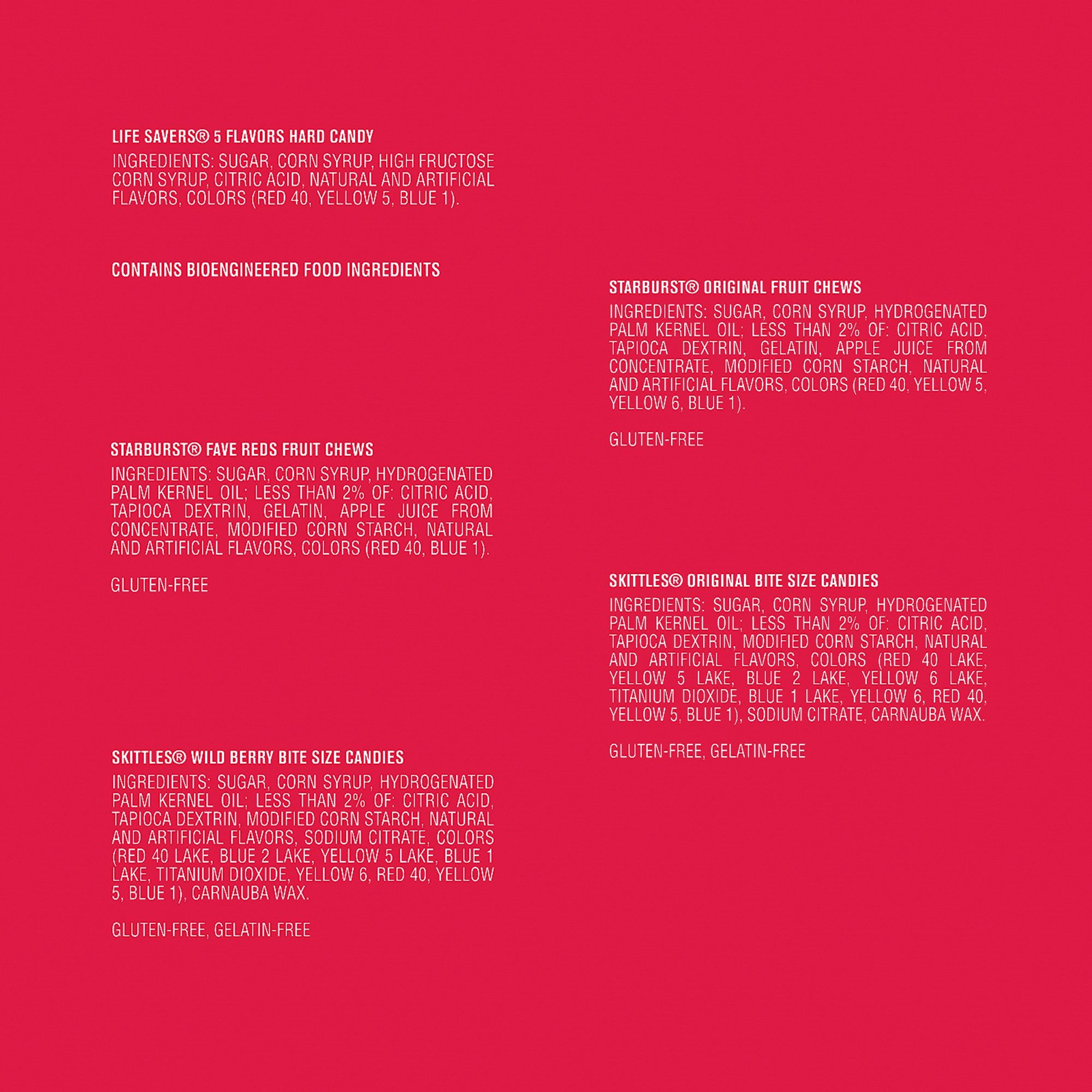 Ingredients: 1: Life Savers® 5 Flavors Hard Candy Ingredients: Sugar, Corn Syrup, High Fructose Corn Syrup, Citric Acid, Natural And Artificial Flavors, Colors (Red 40, Yellow 5, Blue 1). 2: Starburst® Fave Reds Fruit Chews Ingredients: Sugar, Corn Syrup, Hydrogenated Palm Kernel Oil; Less Than 2% Of: Citric Acid, Tapioca Dextrin, Gelatin, Apple Juice From Concentrate, Modified Corn Starch, Natural And Artificial Flavors, Colors (Red 40, Blue 1). 3: Skittles® Wild Berry Bite Size Candies Ingredients: Sugar, Corn Syrup, Hydrogenated Palm Kernel Oil; Less Than 2% Of: Citric Acid, Tapioca Dextrin, Modified Corn Starch, Natural And Artificial Flavors, Sodium Citrate, Colors (Red 40 Lake, Blue 2 Lake, Yellow 5 Lake, Blue 1 Lake, Titanium Dioxide, Yellow 6, Red 40, Yellow 5, Blue 1), Carnauba Wax. 4: Starburst® Original Fruit Chews Ingredients: Sugar, Corn Syrup, Hydrogenated Palm Kernel Oil; Less Than 2% Of: Citric Acid, Tapioca Dextrin, Gelatin, Apple Juice From Concentrate, Modified Corn Starch, Natural And Artificial Flavors, Colors (Red 40, Yellow 5, Yellow 6, Blue 1). 5: Skittles® Original Bite Size Candies Ingredients: Sugar, Corn Syrup, Hydrogenated Palm Kernel Oil; Less Than 2% Of: Citric Acid, Tapioca Dextrin, Modified Corn Starch, Natural And Artificial Flavors, Colors (Red 40 Lake, Yellow 5 Lake, Blue 2 Lake, Yellow 6 Lake, Titanium Dioxide, Blue 1 Lake, Yellow 6, Red 40, Yellow 5, Blue 1), Sodium Citrate, Carnauba Wax.