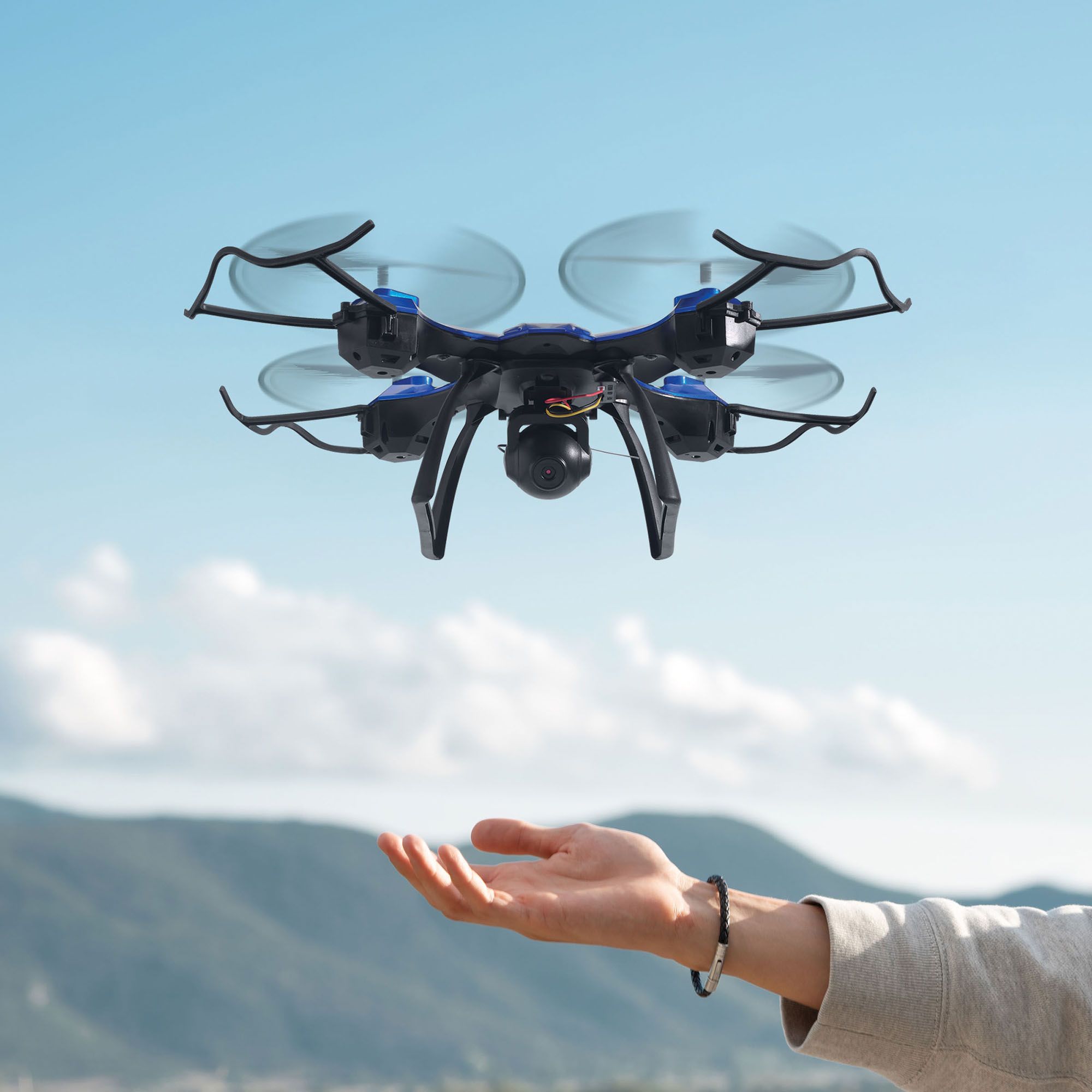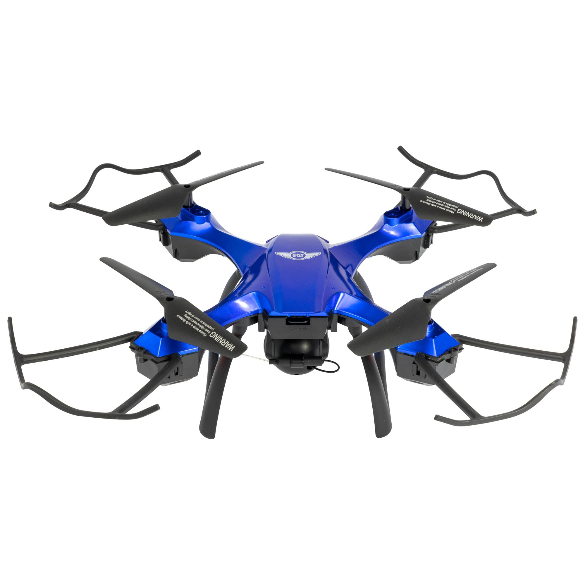 Sky Rider Helios Quadcopter Drone with Wi-Fi Camera and VR Goggle Value Pack, Black and Blue, 360° flips and tricks allow you to create an awe-inspiring air show, 6-axis gyroscope for stable hovering and flying, Control distance: up to 328'.