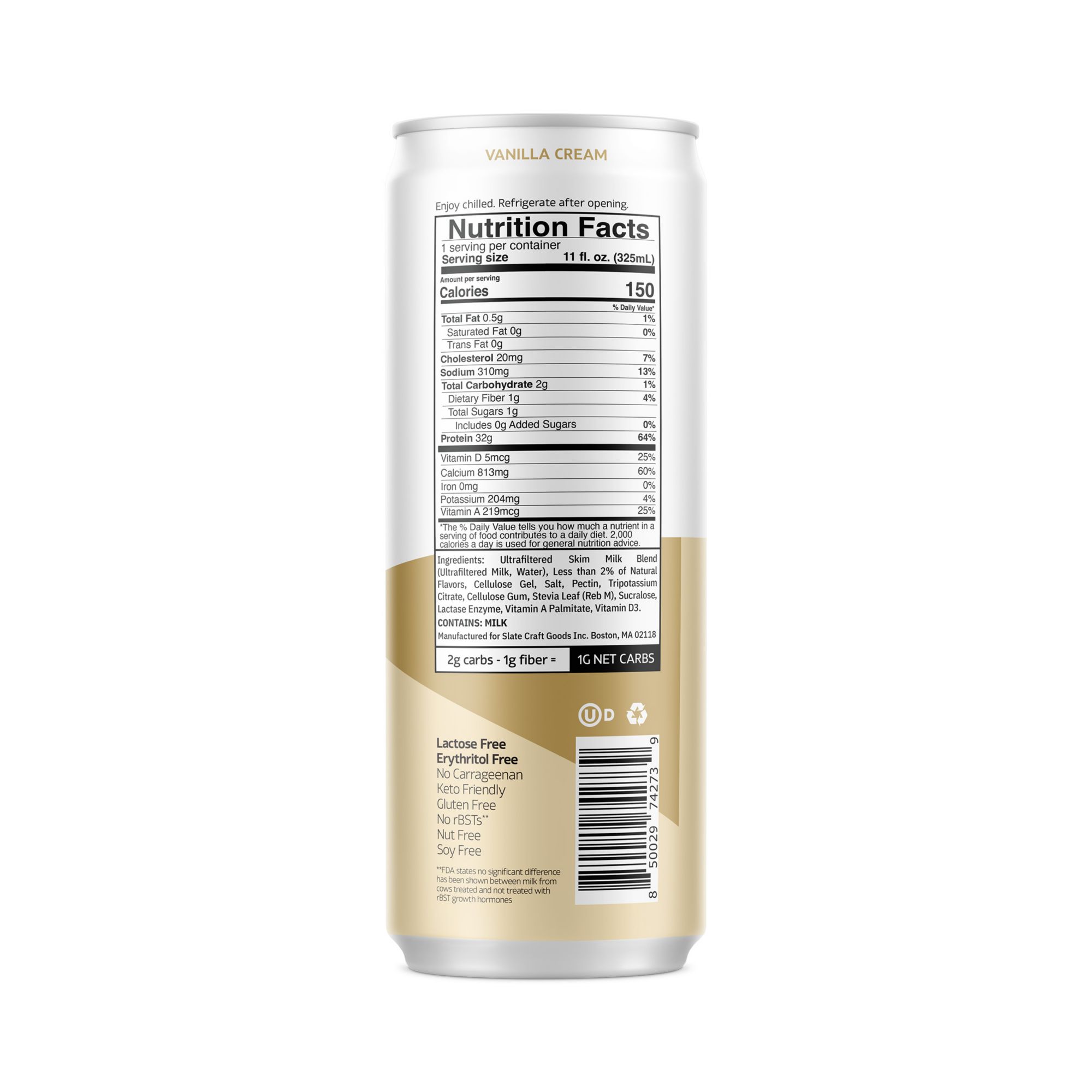 Slate's High Protein Nutrition Shake is smooth, creamy, and delicious. With 32g protein and only 1g of sugar, it gives you the fuel you need at home or on the go. Made from real ultra-filtered milk, Slate Vanilla Cream Nutrition Shake doesn't use any added protein powder and is lactose free. Containing essential vitamins and minerals, while staying nut free, soy free, and gluten free. It’s the perfect drink for the whole family. Packaged in 100% recyclable aluminum cans, Slate is good for you and the planet.