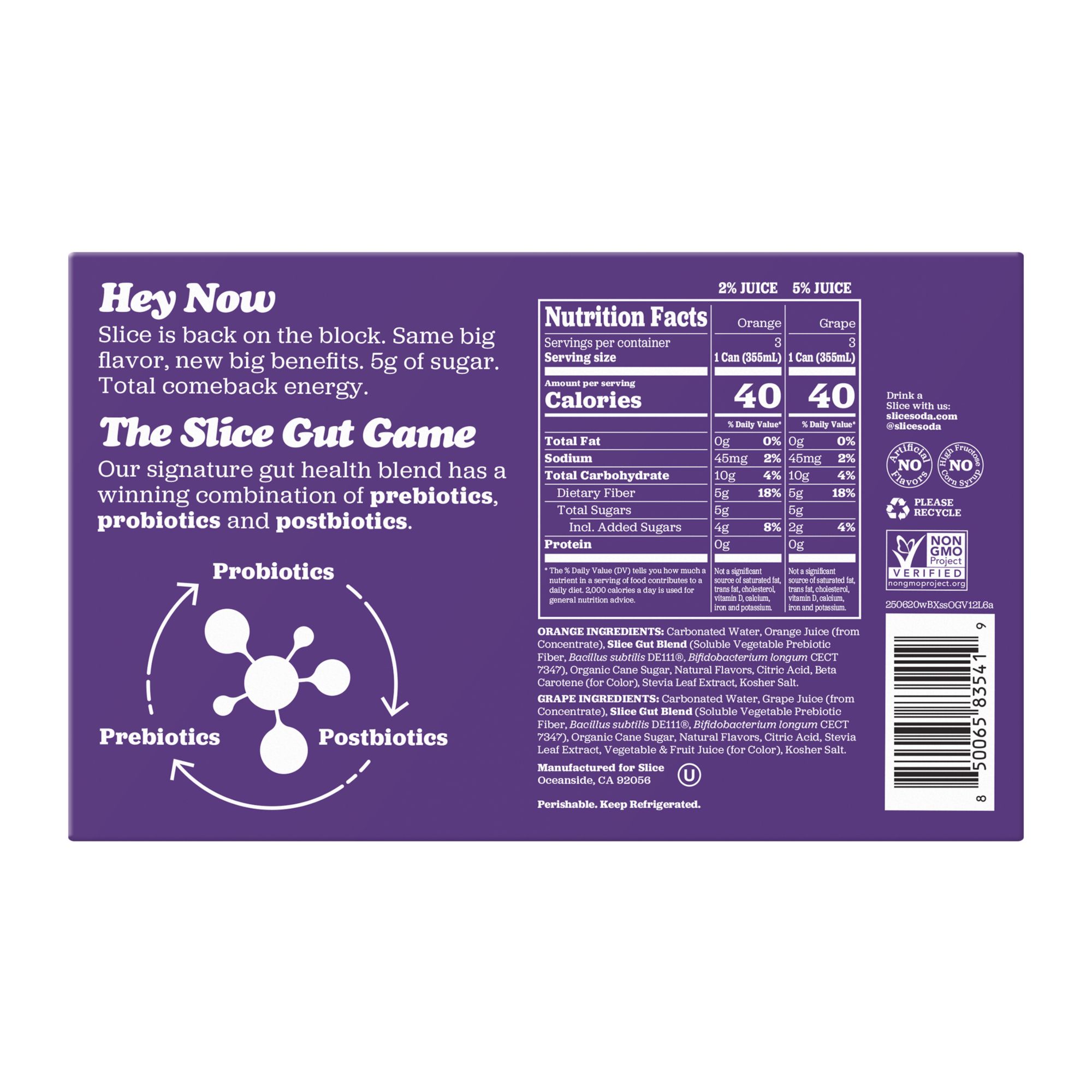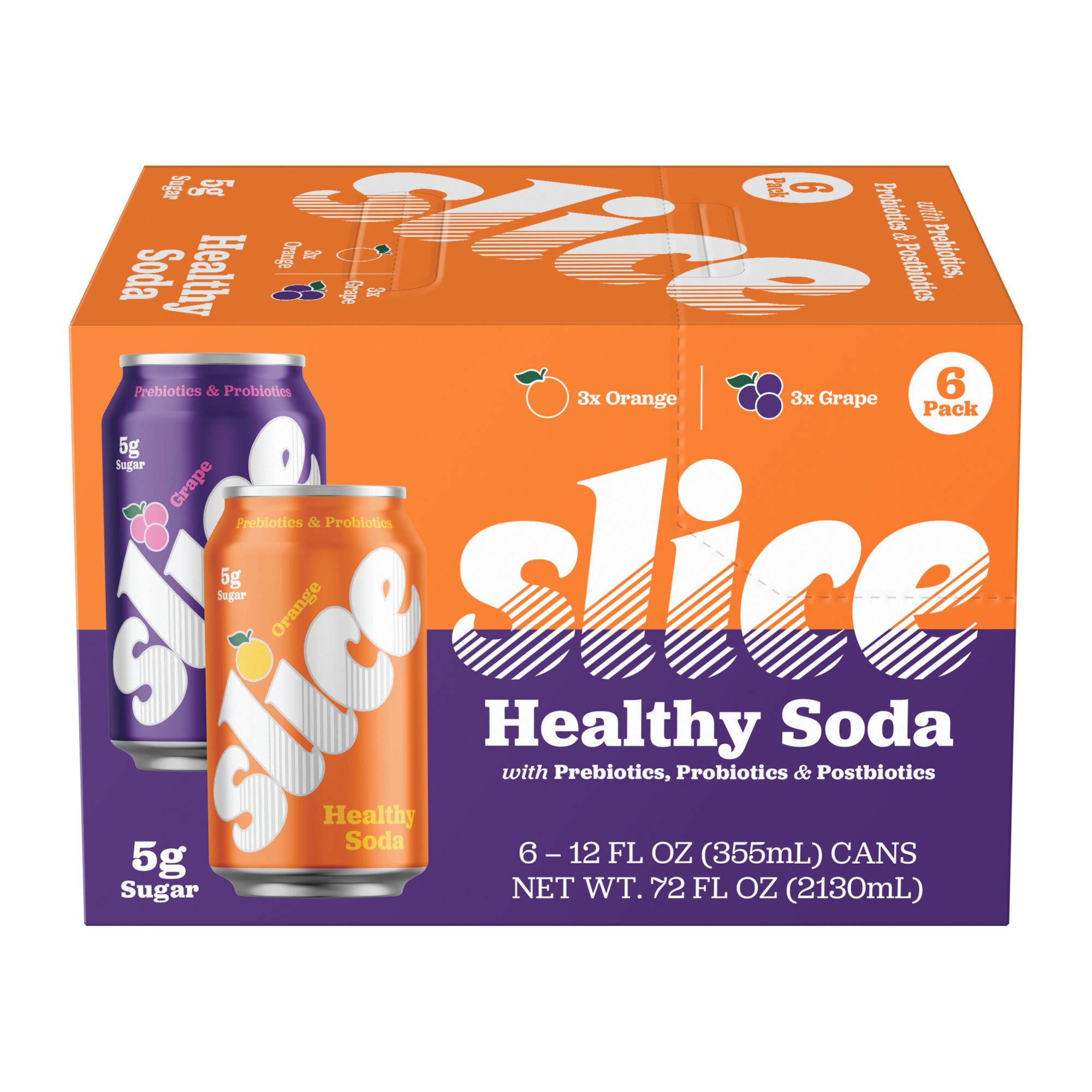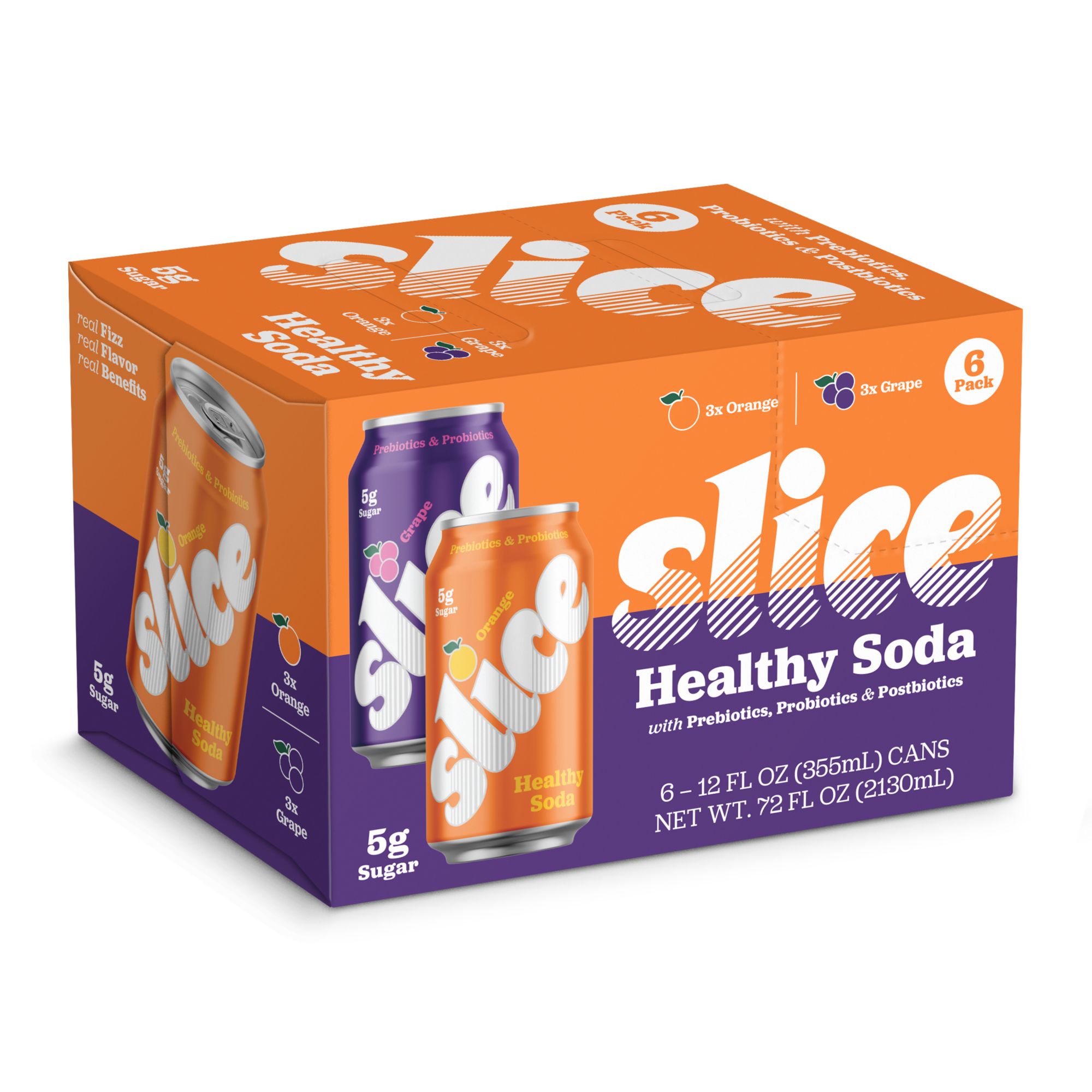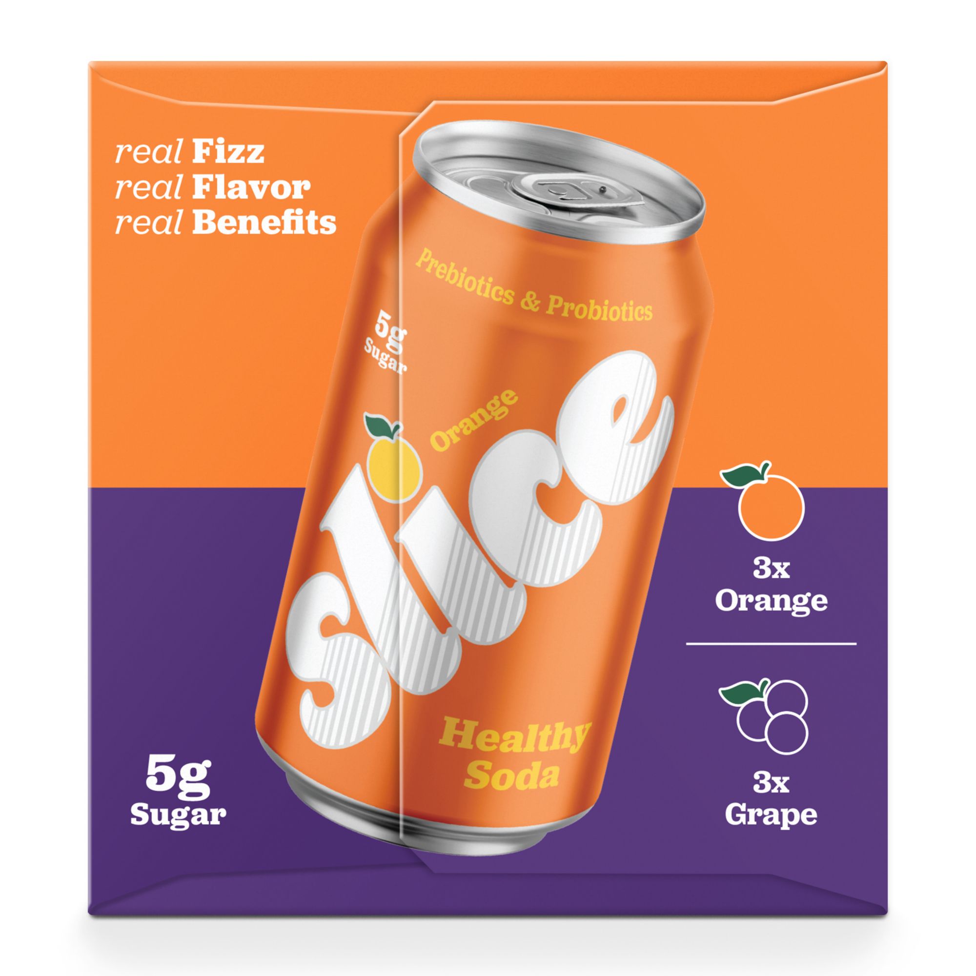 Slice is the spunky, full-flavored soda you loved as a kid, but now with grown-up benefits. This variety pack includes 3 Orange and 3 Grape soda cans in each 6-pack. These soft drinks contain probiotics, postbiotics and 5 grams of prebiotic fiber to support digestive health. Slice Healthy Soda is ultra-bubbly with a classic soda taste and experience.