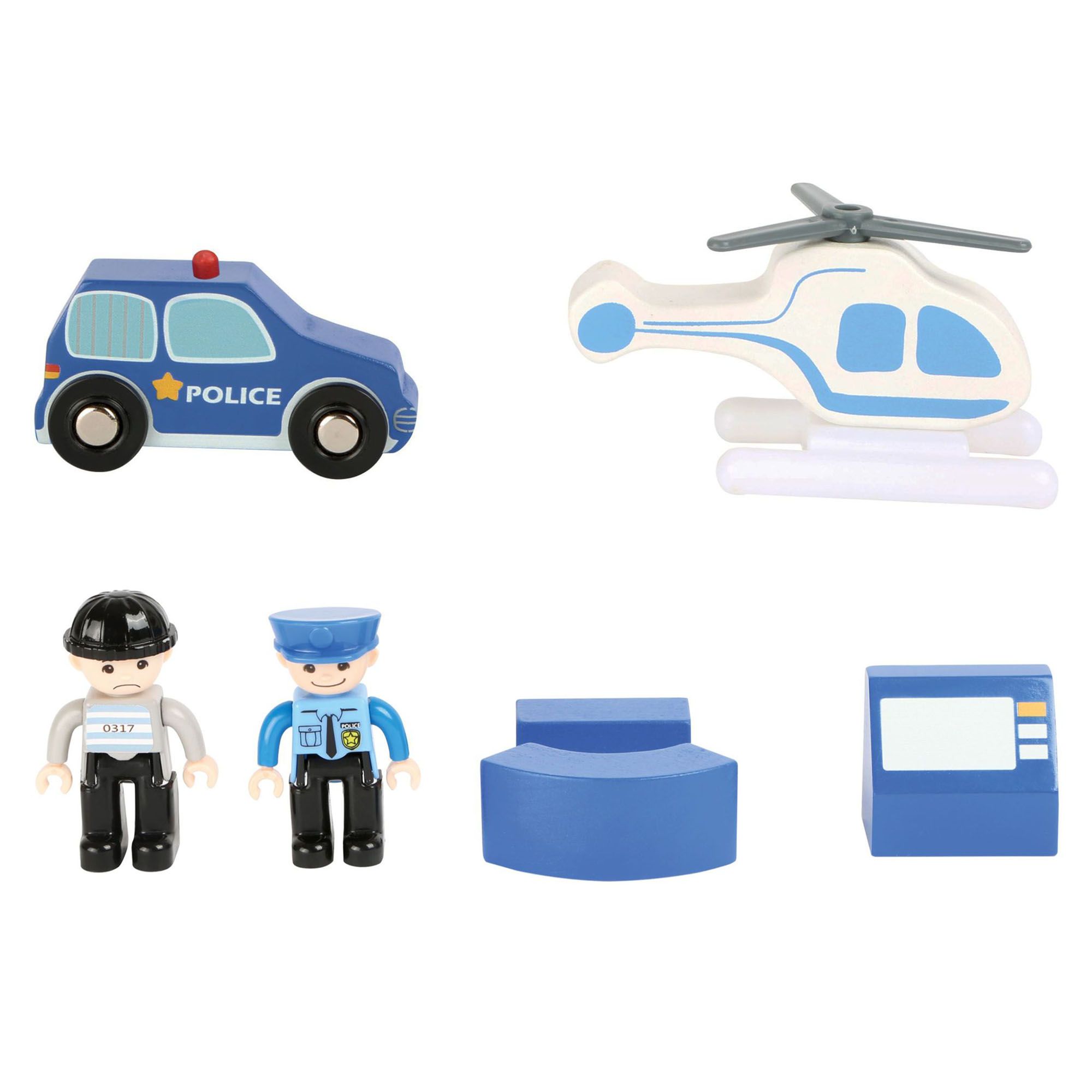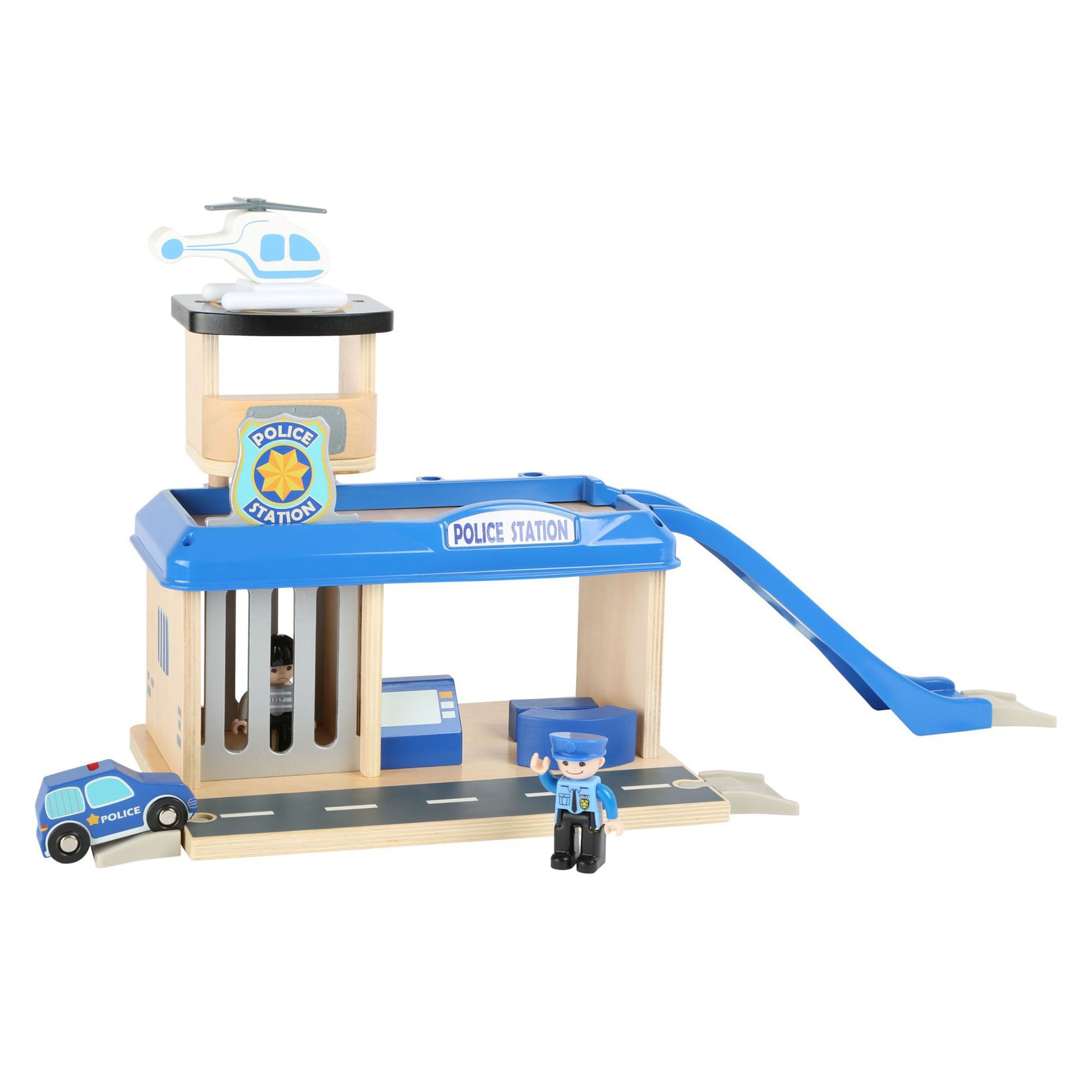 Police station equipped with helipad and car ramp, parking deck, prison cell, and all wooden toys Creative fun for role playing exciting adventures of police offices in everyday life Can be combined with all other small foot wooden toy playworld playsets Ages 3+ Made entirely of wood from FSC certified forests, consisting of high quality wood with rounded edges and painted with kids safe non-toxic water based paint Comes in an attractive colorful packaging for gifting Includes police station equipped with helipad and car ramp, parking deck, prison cell, and all wooden toys