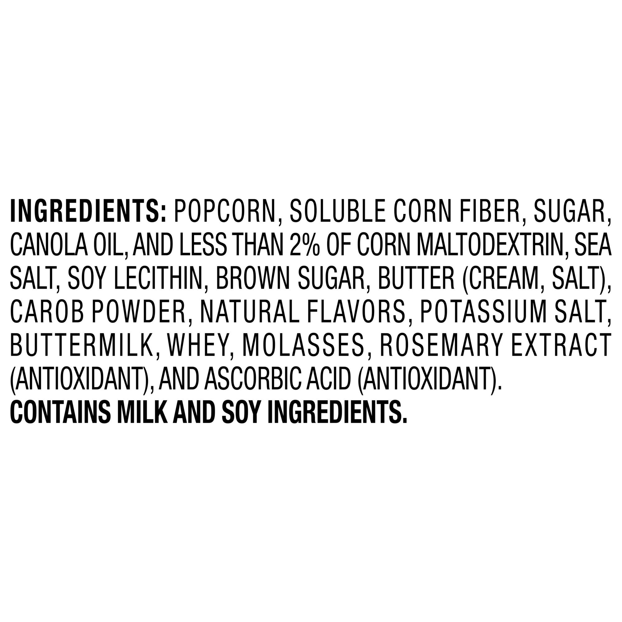Ingredients: Popcorn, Soluble Corn Fiber, Sugar, Canola Oil, And Less Than 2% Of Corn Maltodextrin, Sea Salt, Soy Lecithin, Brown Sugar, Butter (Cream, Salt), Carob Powder, Natural Flavors, Potassium Salt, Buttermilk, Whey, Molasses, Rosemary Extract (Antioxidant), And Ascorbic Acid (Antioxidant). Contains Milk And Soy Ingredients.