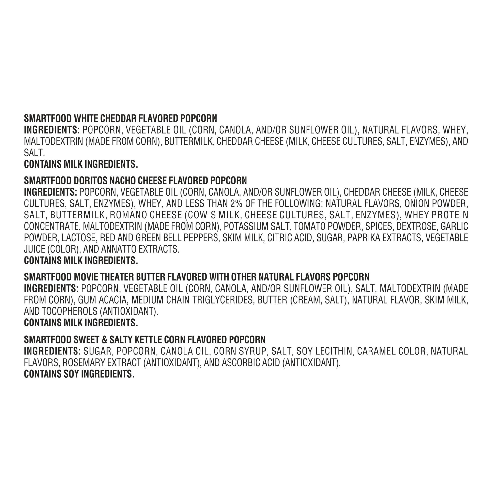 Ingredients: Smartfood White Cheddar Flavored Popcorn Ingredients: Popcorn, Vegetable Oil (Corn, Canola, And/or Sunflower Oil), Natural Flavors, Whey, Maltodextrin (Made From Corn), Buttermilk, Cheddar Cheese(milk, Cheese Cultures, Salt, Enzymes), And Salt. Contains Milk Ingredients. Smartfood Doritos Nacho Cheese Flavored Popcorn Ingredients: Popcorn, Vegetable Oil (Corn, Canola, And/or Sunflower Oil), Cheddar Cheese (Milk, Cheese Cultures, Salt, Enzymes), Whey, And Less Than 2% Of The Following: Natural Flavors, Onion Powder, Salt, Buttermilk, Romano Cheese (Cow's Milk, Cheese Cultures, Salt, Enzymes), Whey Protein Concentrate, Maltodextrin (Made From Corn), Potassium Salt, Tomato Powder, Spices, Dextrose, Garlic Powder, Lactose, Red And Green Bell Peppers, Skim Milk, Citric Acid, Sugar, Paprika Extracts, Vegetable Juice (Color), And Annatto Extracts. Contains Milk Ingredients. Smartfood Movie Theater Butter Flavored With Other Natural Flavors Popcorn Ingredients: Popcorn, Vegetable Oil (Corn, Canola, And/or Sunflower Oil), Salt, Maltodextrin (Made From Corn), Gum Acacia, Medium Chain Triglycerides, Butter (Cream, Salt), Natural Flavor, Skim Milk, And Tocopherols (Antioxidant) Contains Milk Ingredients. Smartfood Sweet & Salty Kettle Corn Flavored Popcorn Ingredients: Sugar, Popcorn, Canola Oil, Corn Syrup, Salt, Soy Lecithin, Caramel Color, Natural Flavors, Rosemary Extract (Antioxidant), And Ascorbic Acid (Antioxidant) Contains Soy Ingredients.