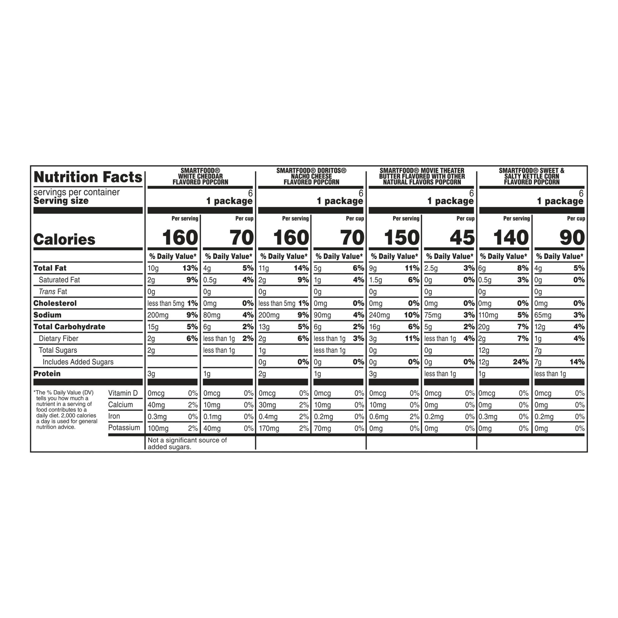 Six 1 oz. bags of Smartfood White Cheddar flavor popcorn, six 1 oz. bags of Doritos Nacho Cheese flavored popcorn, six 1 oz. bags of Smartfood Movie Theater Butter flavored popcorn, and six 1 oz. bags of Smartfood Sweet and Salty Kettle Corn flavored popcorn