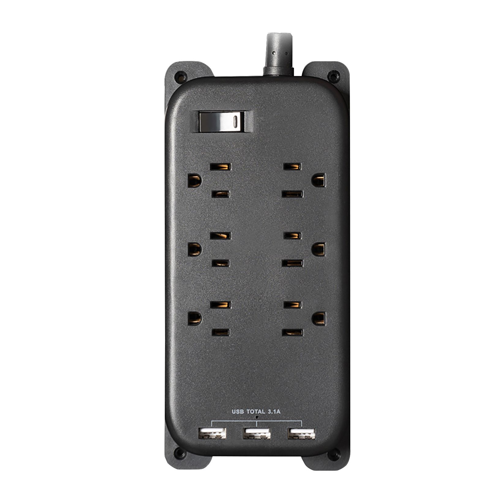 Six outlets Three USB ports Flat, angled plug Surge protection 3' braided heavy-duty cord Mountable on wall Includes one power strip with USB ports Warranty: 1 year limited