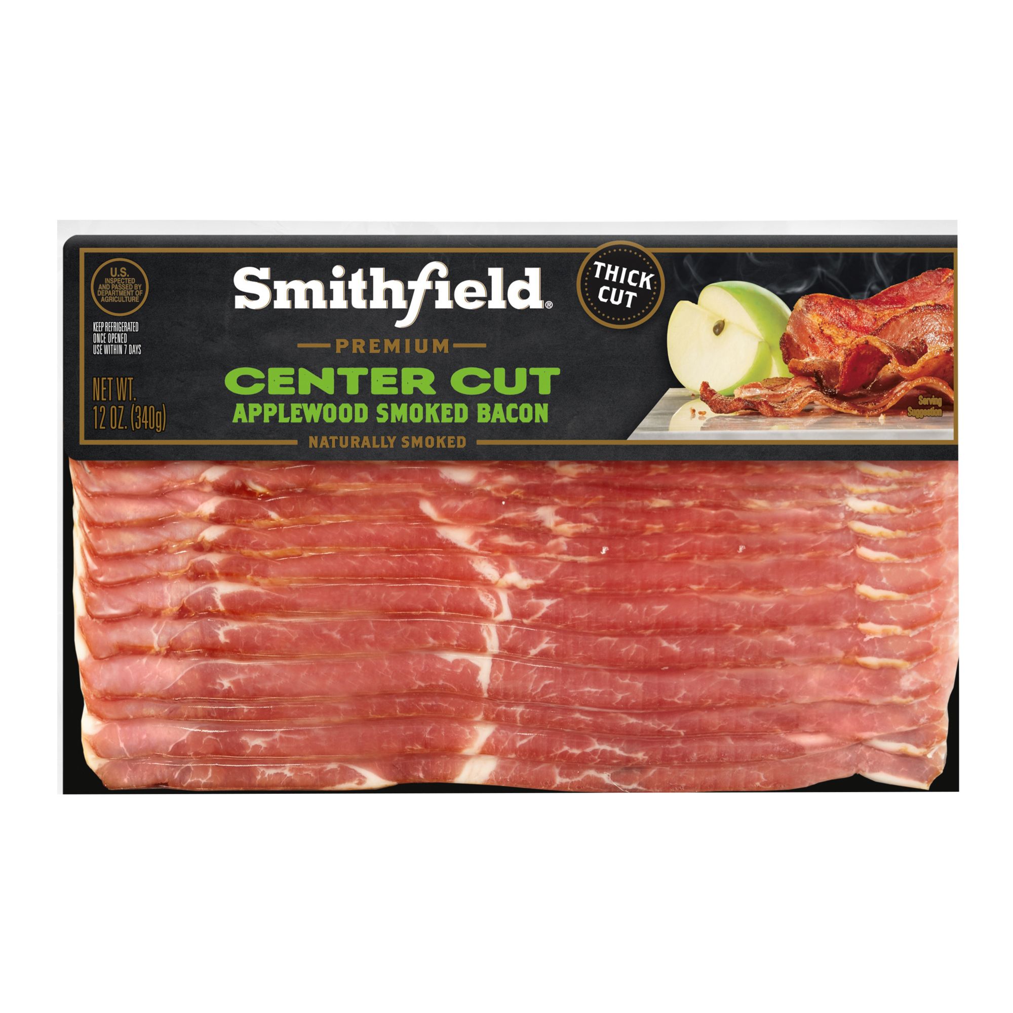 New Smithfield Center Cut Applewood Smoked Thick Cut Bacon will bring the all-natural applewood smoke you love to any meal, any time. Smithfield hand selects and hand trims only the finest cuts of pork – which is then center cut to ensure you'll get high-quality and leaner crispiness in every bite – from mealtime to snack time. For food quality and safety, refrigerate or freeze Smithfield Center Cut Applewood Smoked Bacon until ready to use, and promptly refrigerate leftovers. Available in 12 oz.