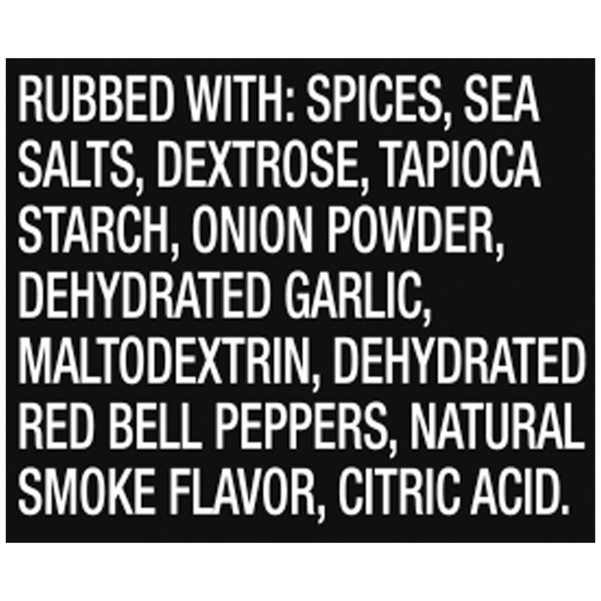 Ingredients: Marinated With Up To A 20% Solution Of Water, Vinegar, And Salt Rubbed With: Spices, Sea Salts, Dextrose, Tapioca Starch, Onion Powder, Dehydrated Garlic, Maltodextrin, Dehydrated Red Bell Peppers, Natural Smoke Flavor, Citric Acid