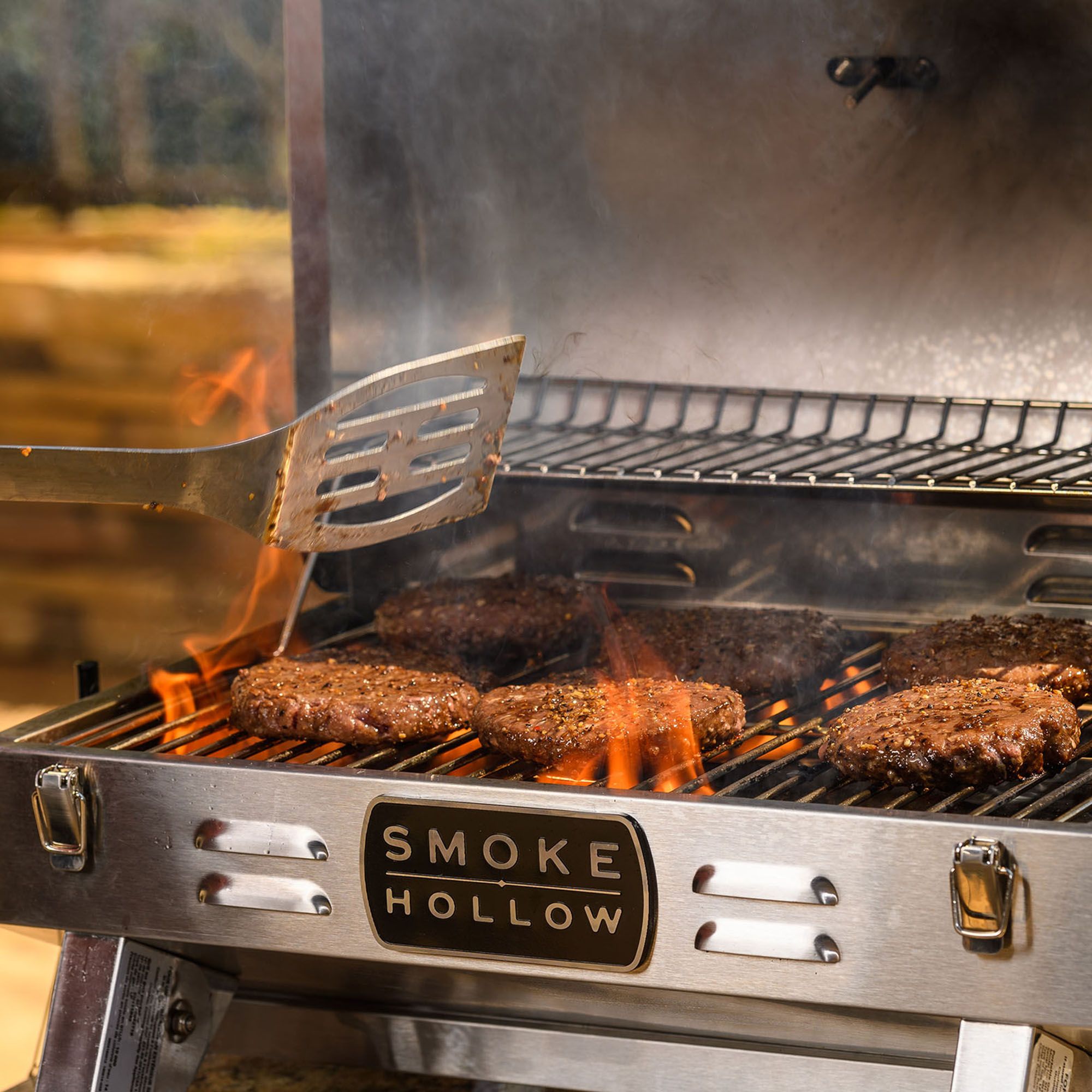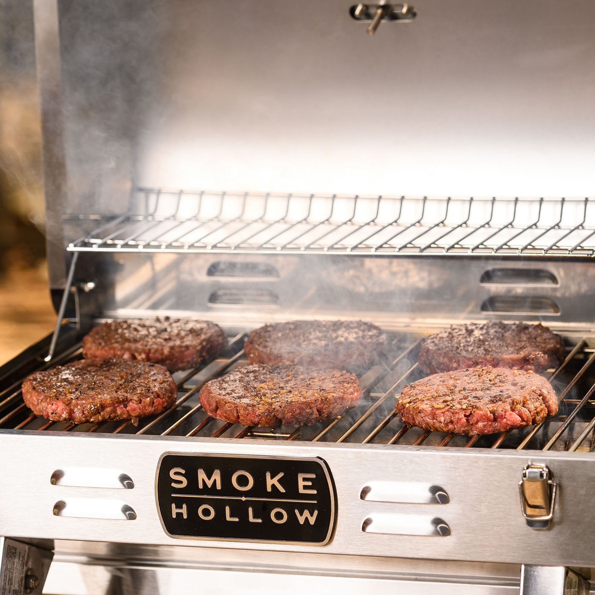 The Smoke Hollow Tabletop Gas Grill is perfect for camping, tailgating, picnics or any outdoor use. This grill boasts 310-sq.-in. of cooking surface with a 11.25"x 18.5" and warming rack. Built for the BBQ-grillers on the go, the long-lasting stainless steel construction allows you to enjoy outdoor cooking wherever you enjoy it most. The compact design, with locking lid, folding legs and large front carry handle, makes this grill very portable and easy to transport or store. The grill operates on a small, disposable one-pound propane cylinders (not included), which are available nationwide as a common camping accessory item.