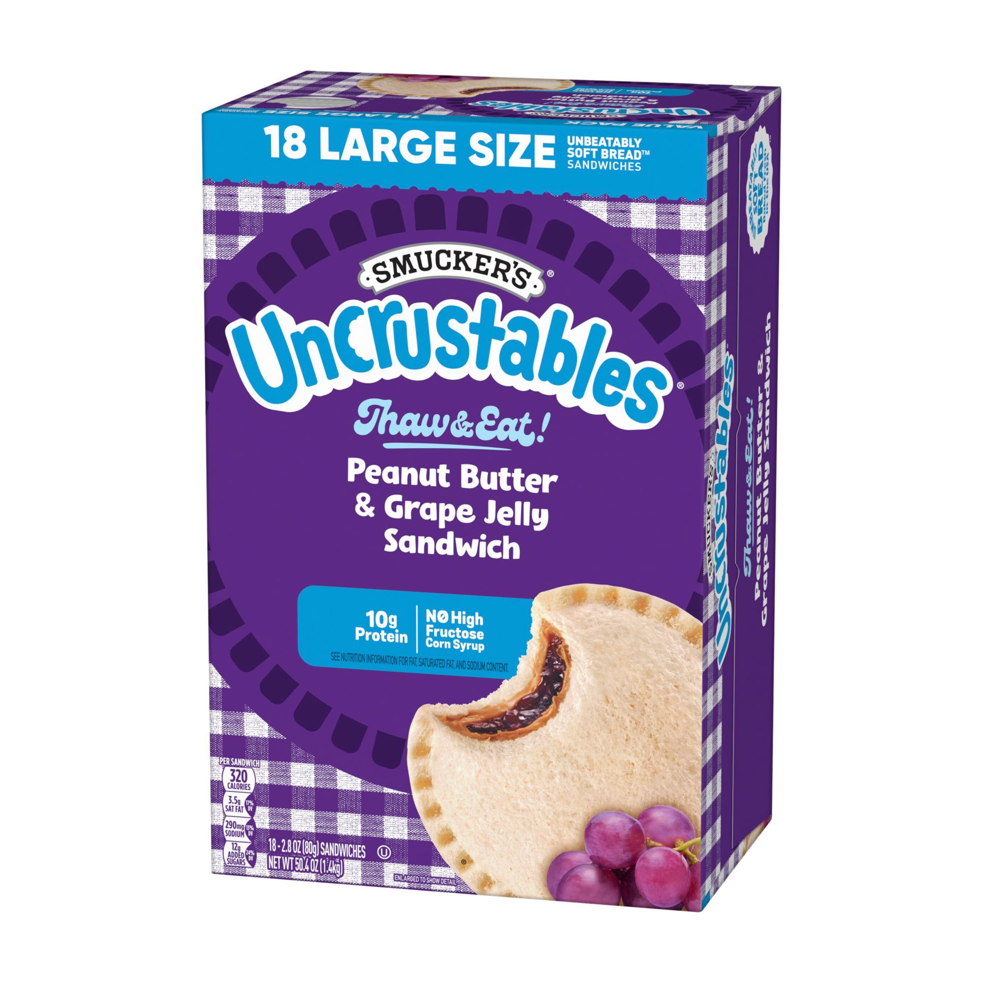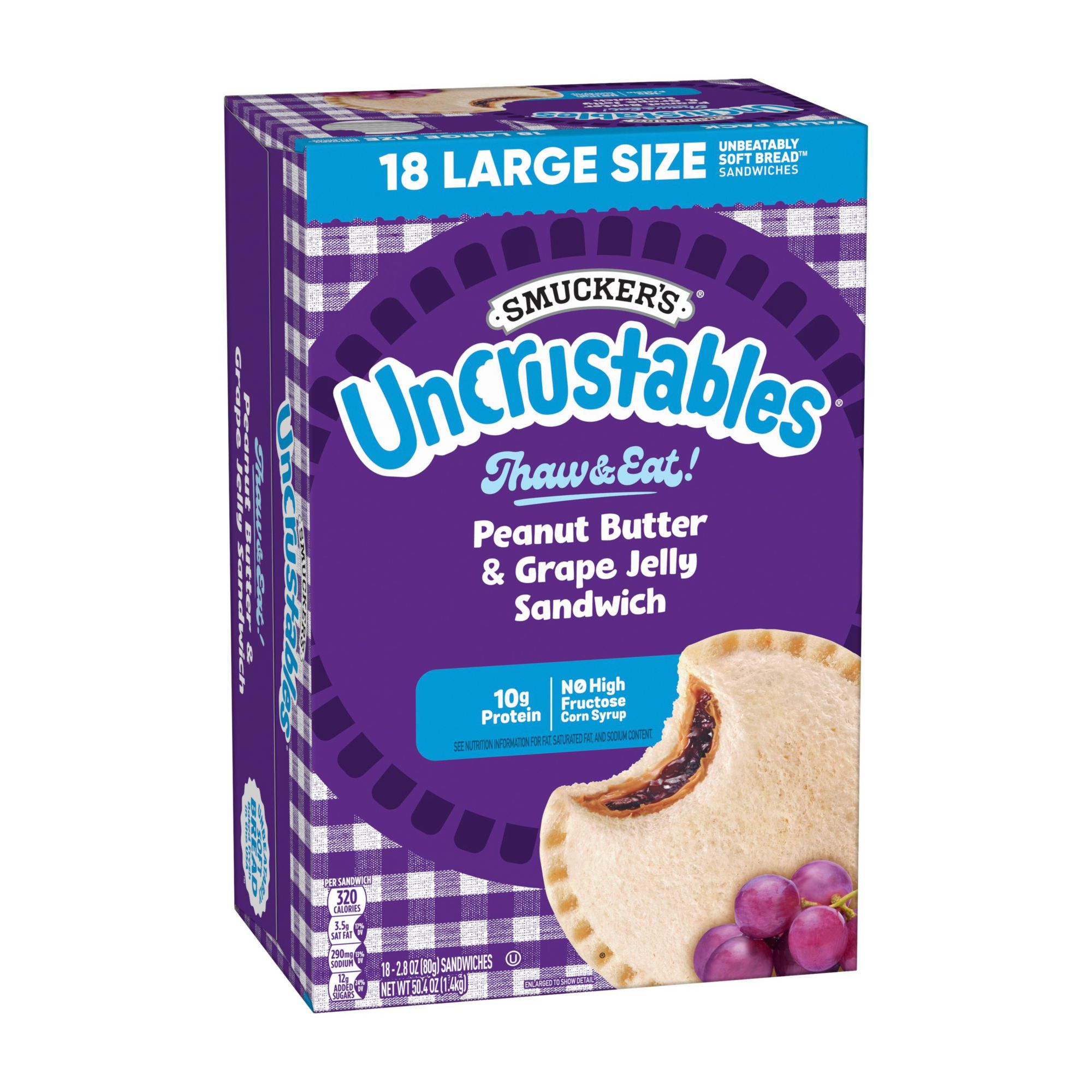Just thaw, unwrap, and snack wherever you are. Uncrustables Peanut Butter and Grape Jelly Sandwiches are a convenient, packable snack to take along wherever you and your kids are going next. These single serve sandwiches are individually wrapped for anytime snacking. With 10 grams (10% DV) of protein per serving (See nutrition information for fat, saturated fat, and sodium content), these frozen grab-and-go sandwiches taste great and are full of peanut butter and grape jelly flavor. For a taste of home, kids and adults alike can simply grab an Uncrustables Peanut Butter and Grape Jelly Sandwich to thaw and eat on-the-go during a lunch break at the office, snack break while running errands, at sporting events, in between carpool rides, and so much more. They have no high fructose corn syrup, so go ahead and keep a couple boxes stocked in the freezer for when any snack time situation hits.
